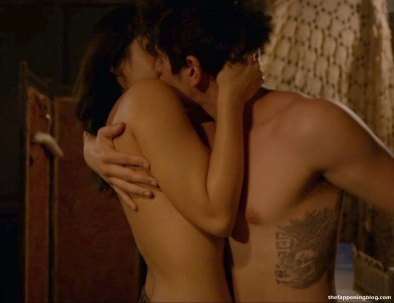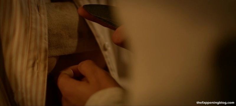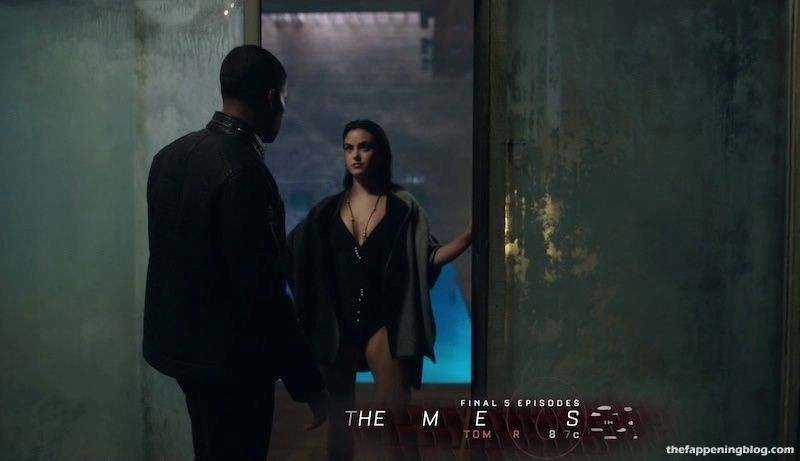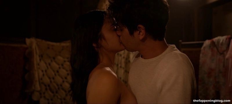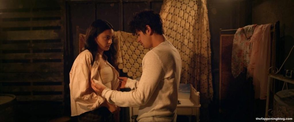 Camila Mendes fait ouvrir sa chemise par un homme pour révéler un bandage autour de sa poitrine, que l’homme coupe ensuite au couteau, dévoilant un peu de décolleté. Elle et l’homme s’embrassent ensuite alors qu’elle enlève sa chemise, seins nus et montrant un sideboob pressé contre l’homme alors qu’ils s’embrassent encore.