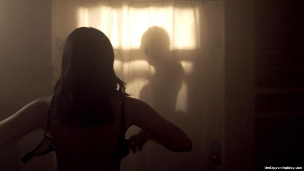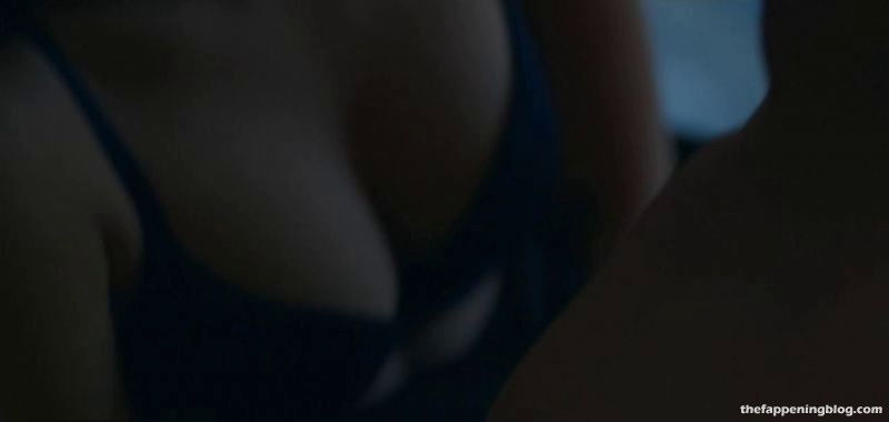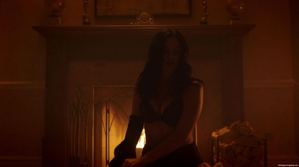 Camila Mendes et un homme s’embrassent en traversant une pièce, elle enlève ses vêtements pour révéler son décolleté dans un soutien-gorge noir, puis rampe sur un lit montrant ses fesses en culotte noire avant de s’allonger sur le dos et de le laisser grimper sur elle en l’embrassant, puis on la voit finalement au-dessus de lui alors qu’il défait son soutien-gorge.