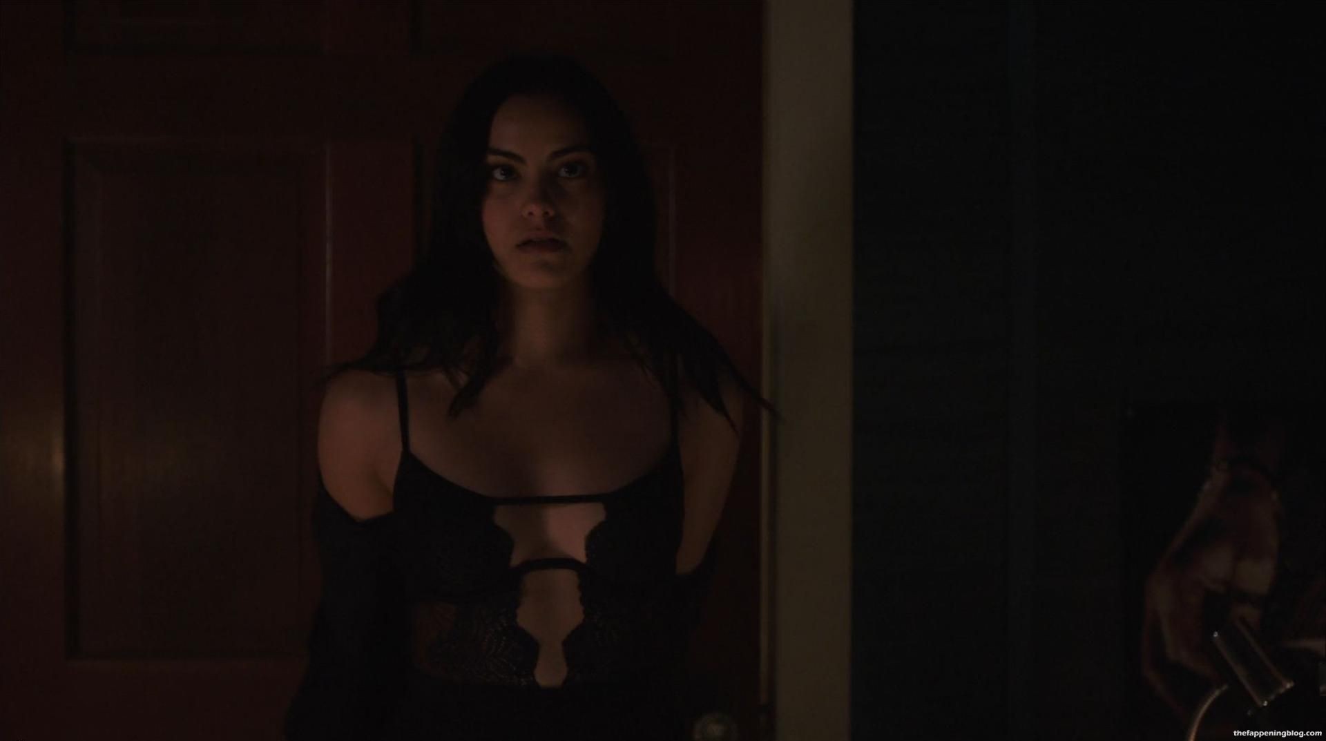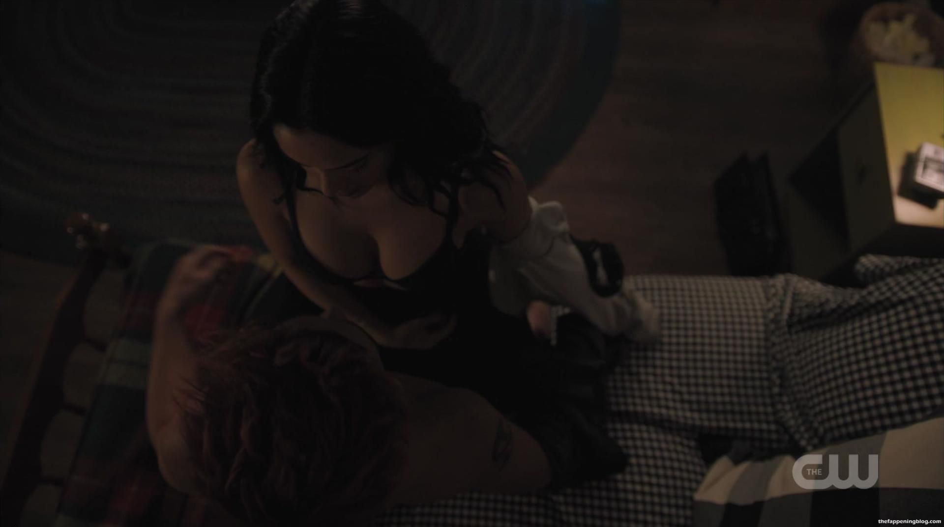 Camila Mendes et un homme s’embrassent en traversant une pièce, elle enlève ses vêtements pour révéler son décolleté dans un soutien-gorge noir, puis rampe sur un lit montrant ses fesses en culotte noire avant de s’allonger sur le dos et de le laisser grimper sur elle en l’embrassant, puis on la voit finalement au-dessus de lui alors qu’il défait son soutien-gorge.