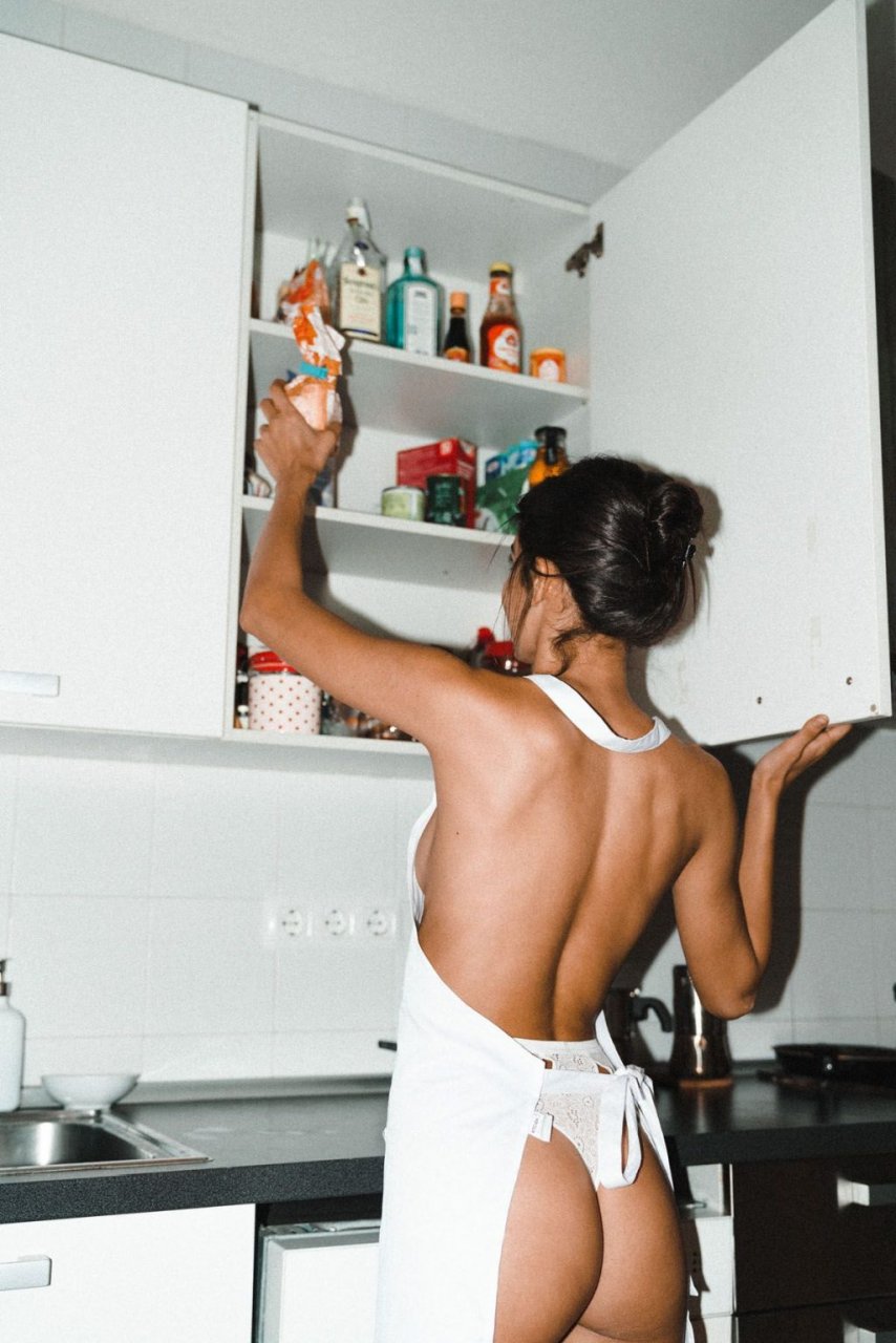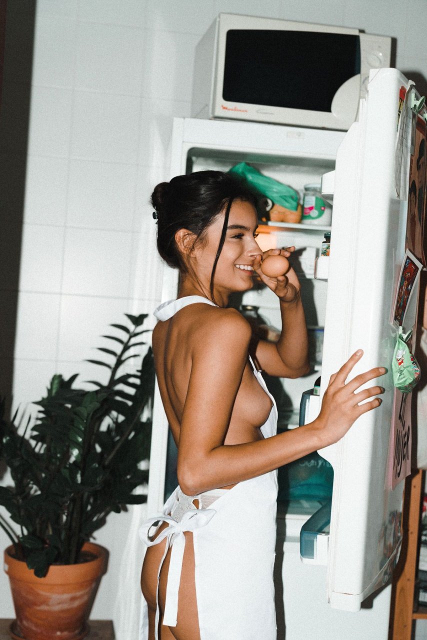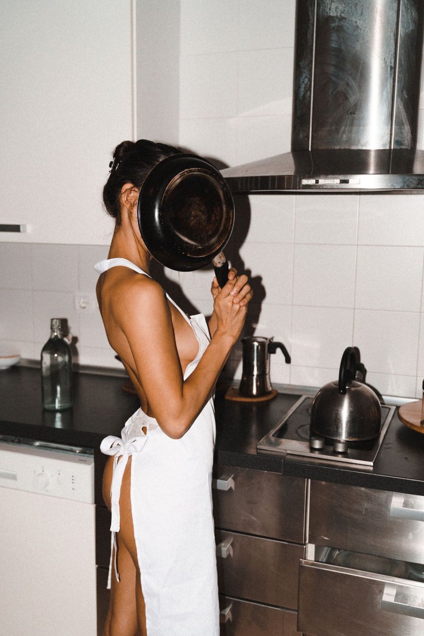 Model Camila “Cami” Romero portait un tablier sur son corps nu lors d’une séance photo par Jonny Seelenmeyer (2018). Une telle femme au foyer devrait être dans chaque cuisine !