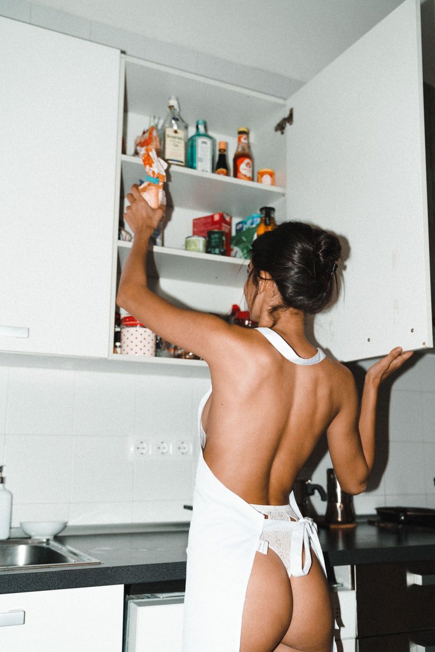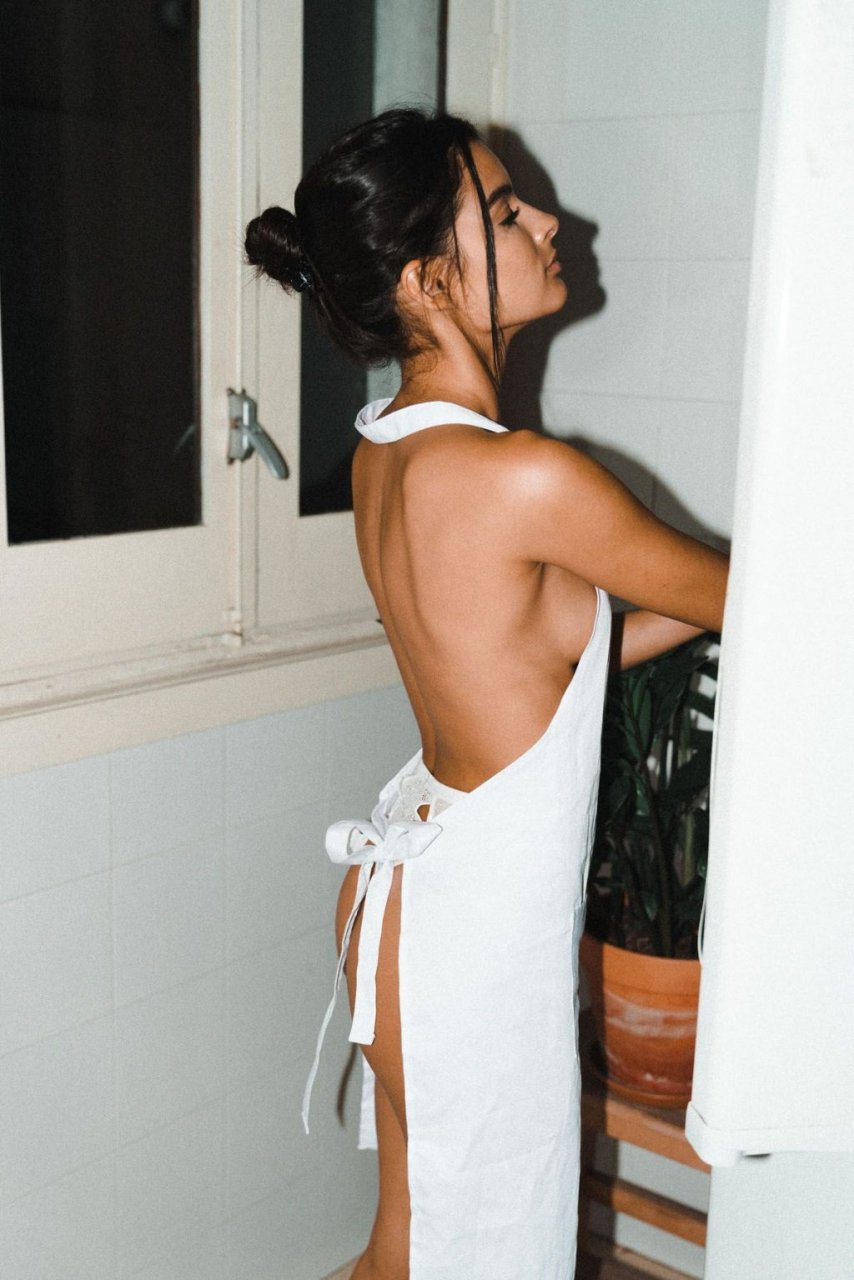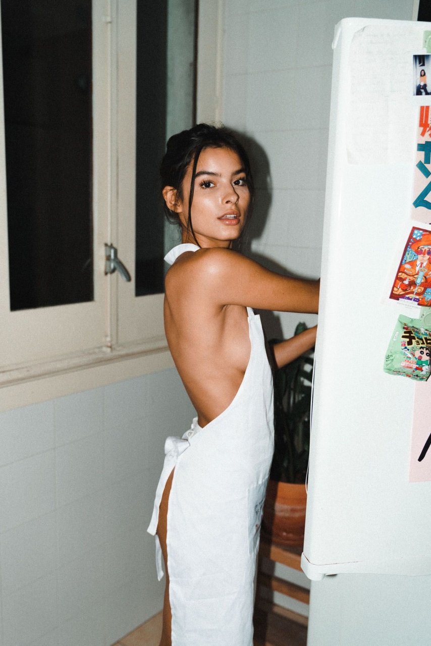 Model Camila “Cami” Romero portait un tablier sur son corps nu lors d’une séance photo par Jonny Seelenmeyer (2018). Une telle femme au foyer devrait être dans chaque cuisine !