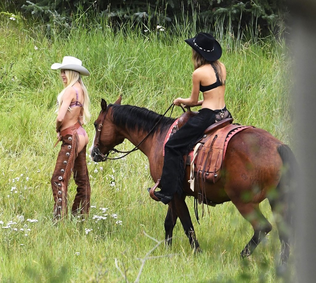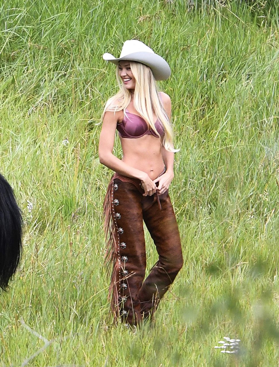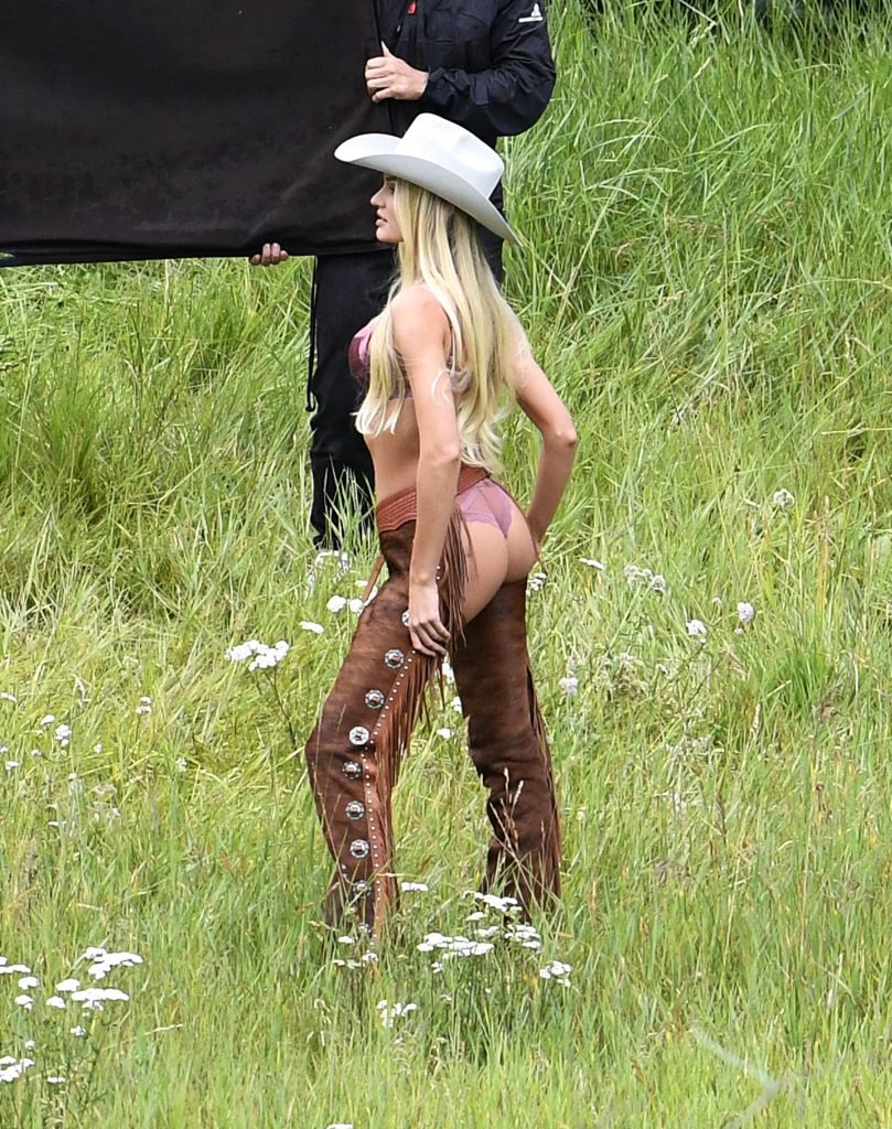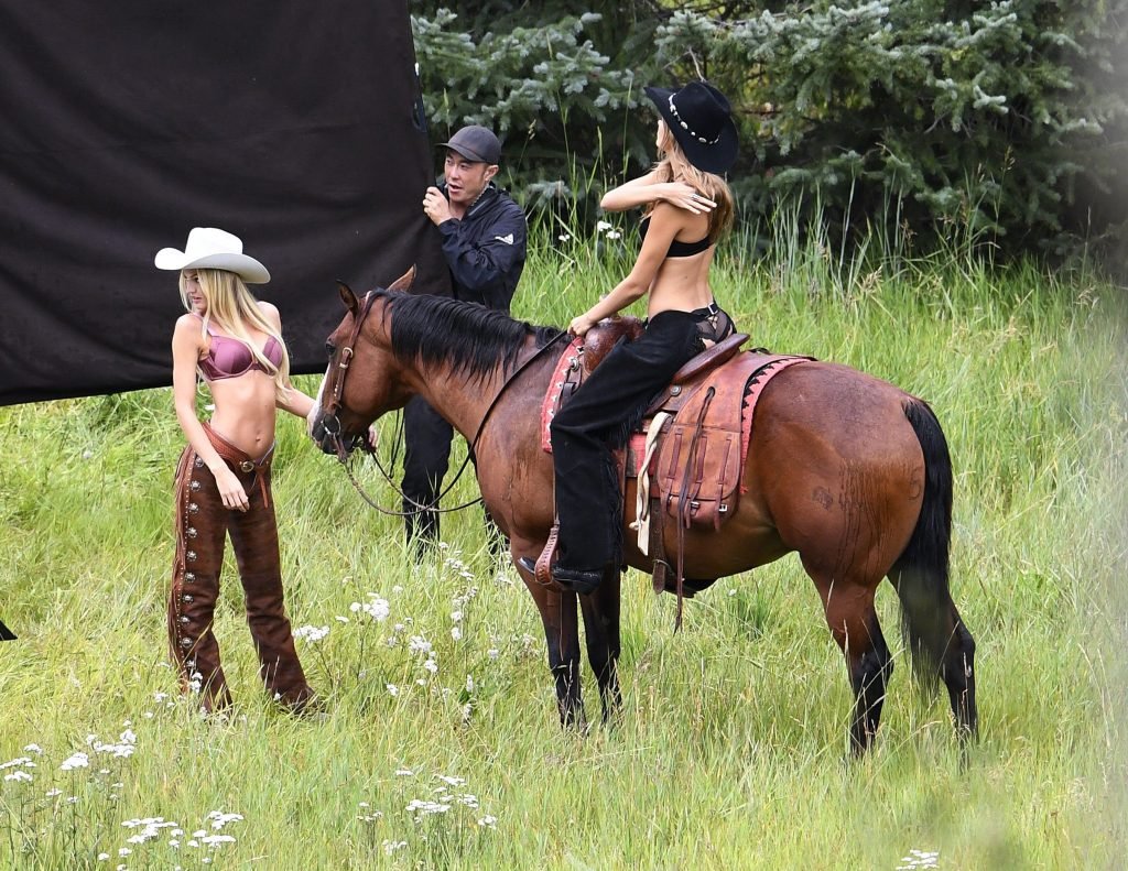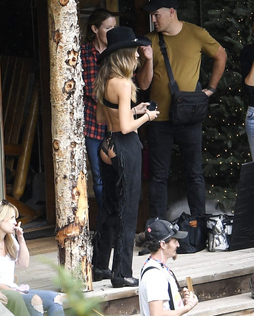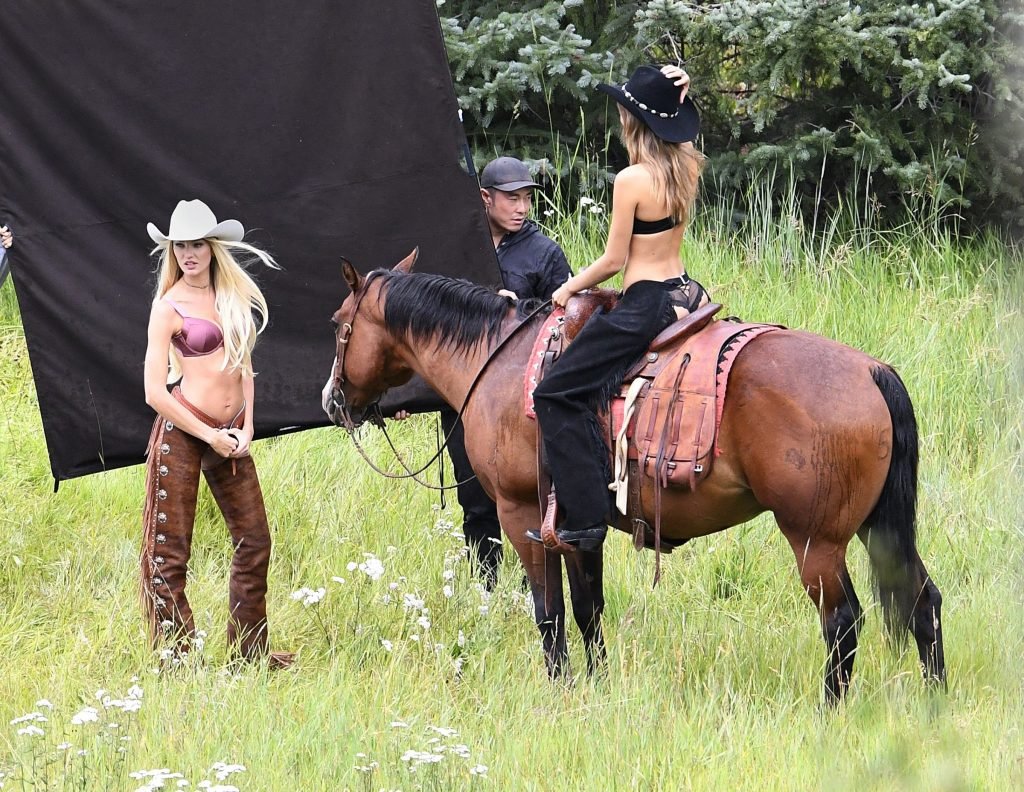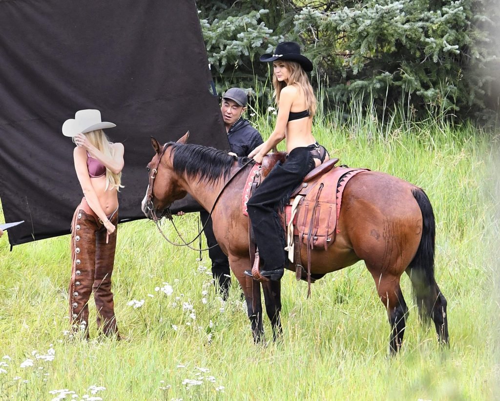 Supermodels Candice Swanepoel et Josephine Skriver ont été aperçues portant des tenues sexy de cow-boy lors du shooting pour le prochain catalogue de vacances de Victoria’s Secret à Aspen, le 15/08/2017.