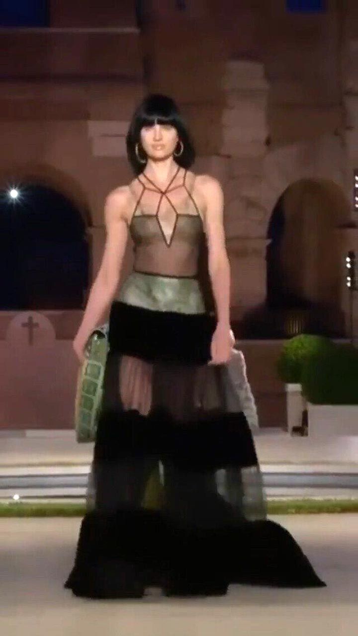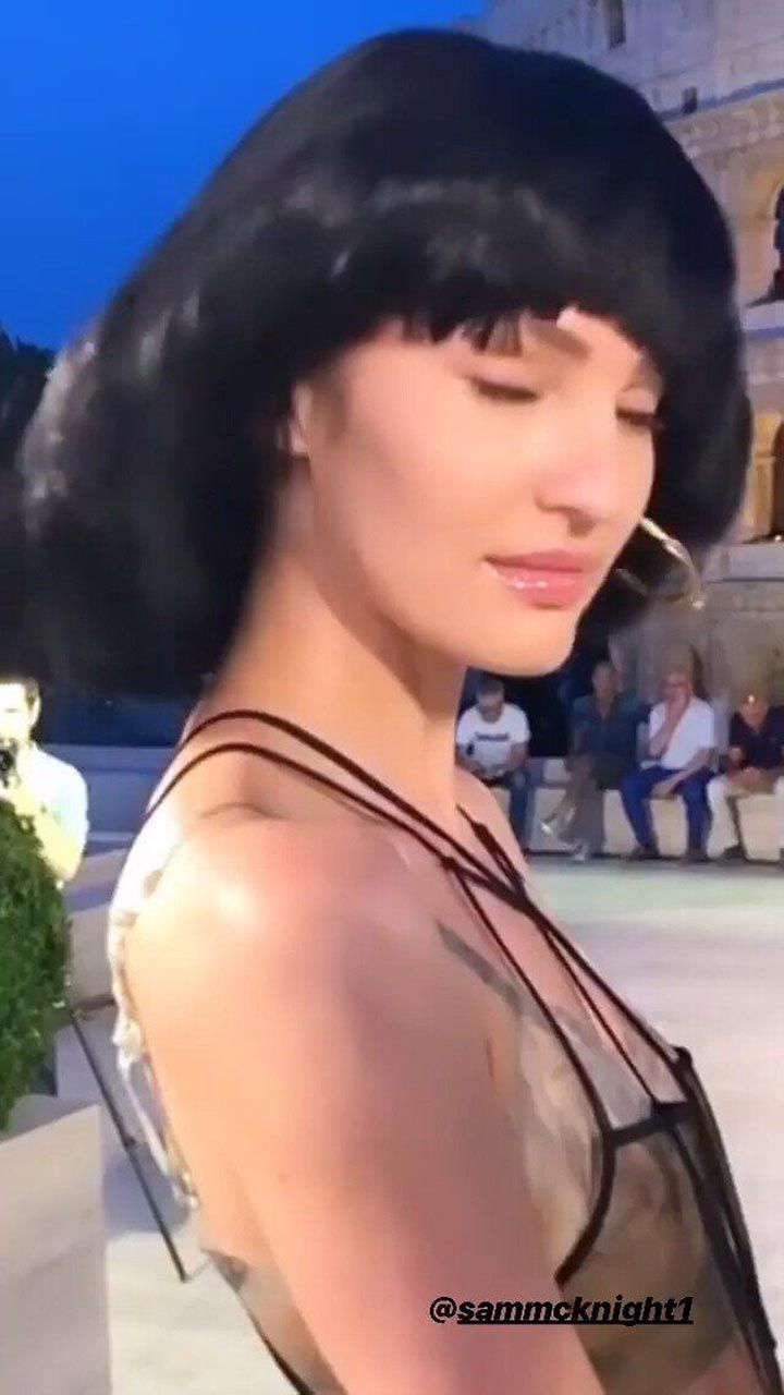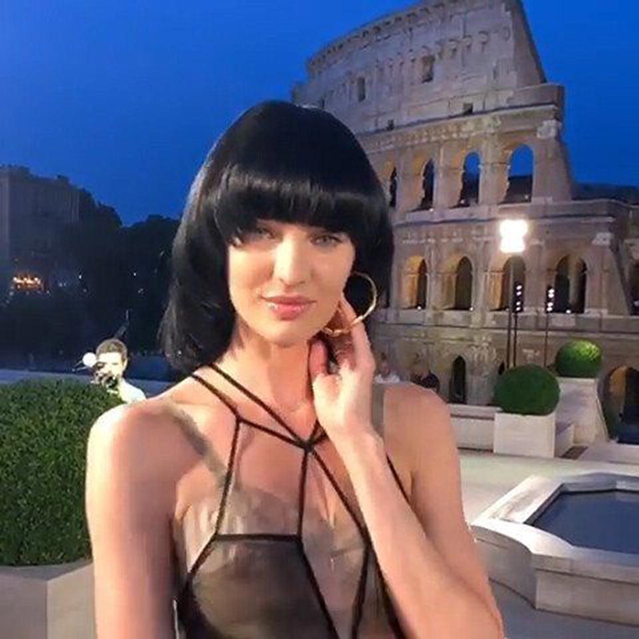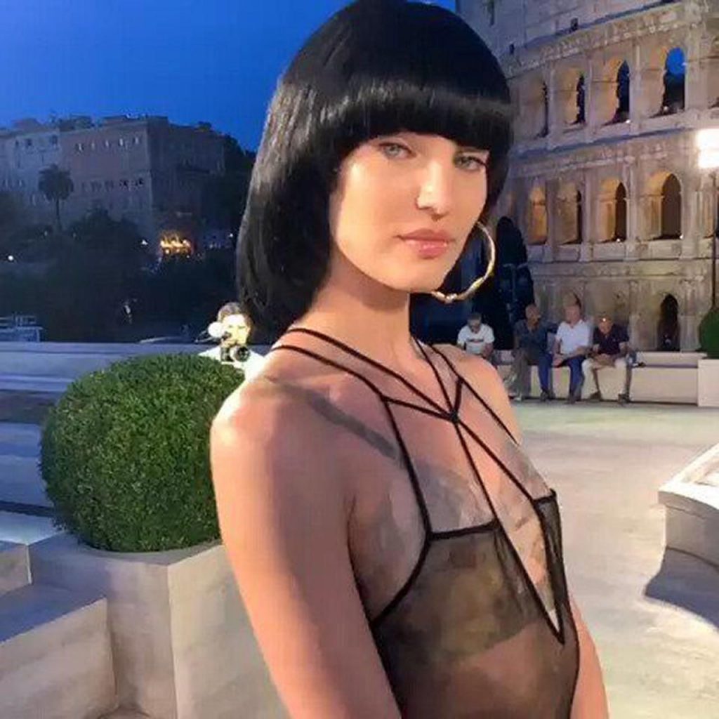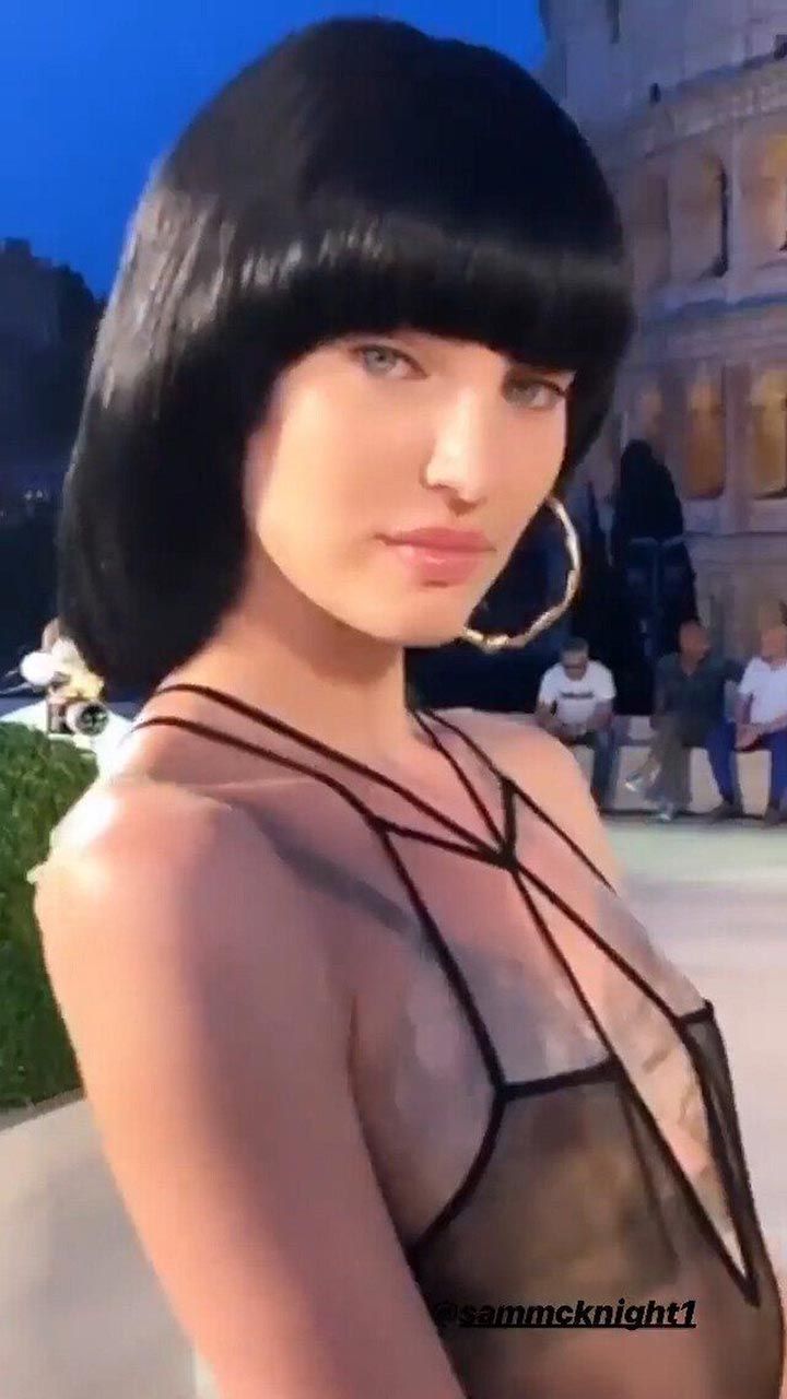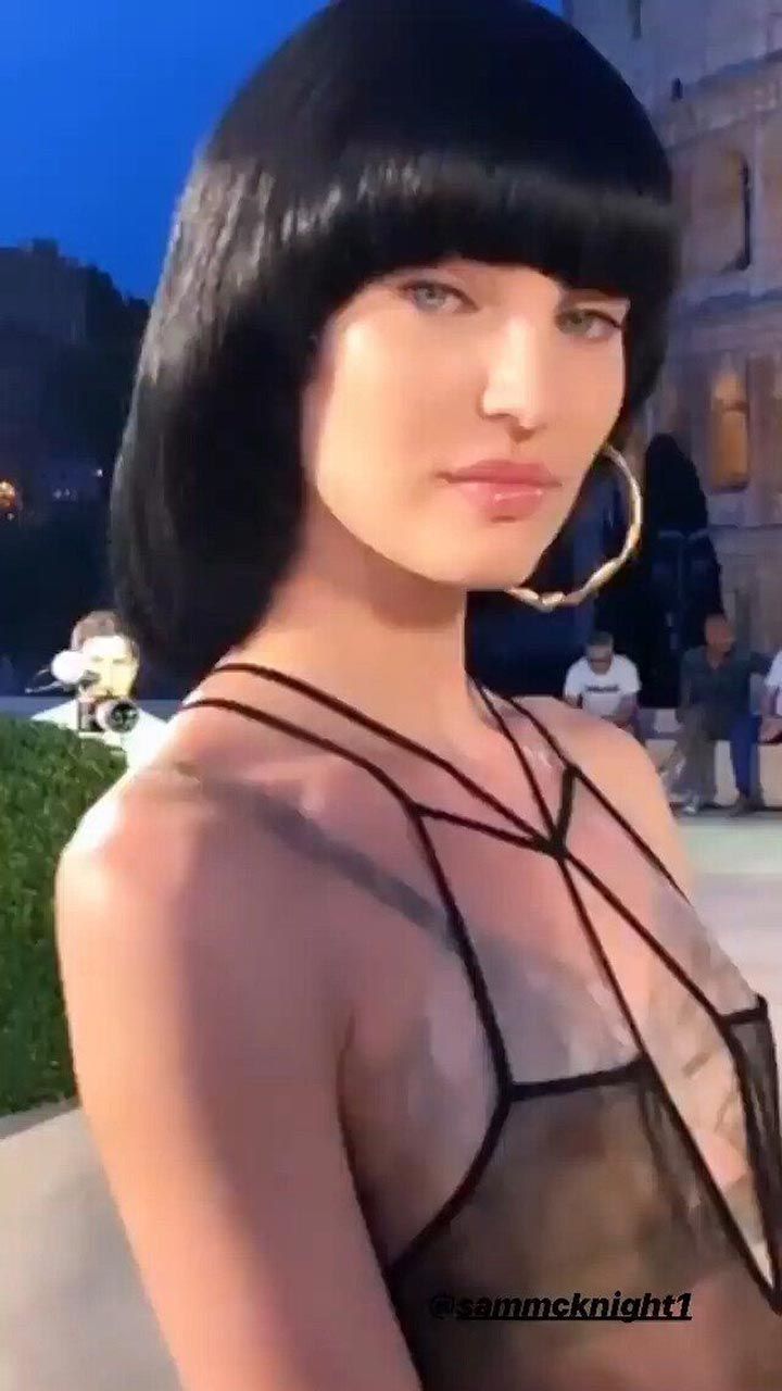 Check out the rare Candice Swanepoel see-through appearance from the runway! Candice was one of the models at the Fendi fashion show in Italy, and she looked like an alien! We like to see Swanepoel with her perfect blonde hair and hot blue eyes; this black wig doesn’t fit her! She wore a transparent dress, and we can see her small nipples here!