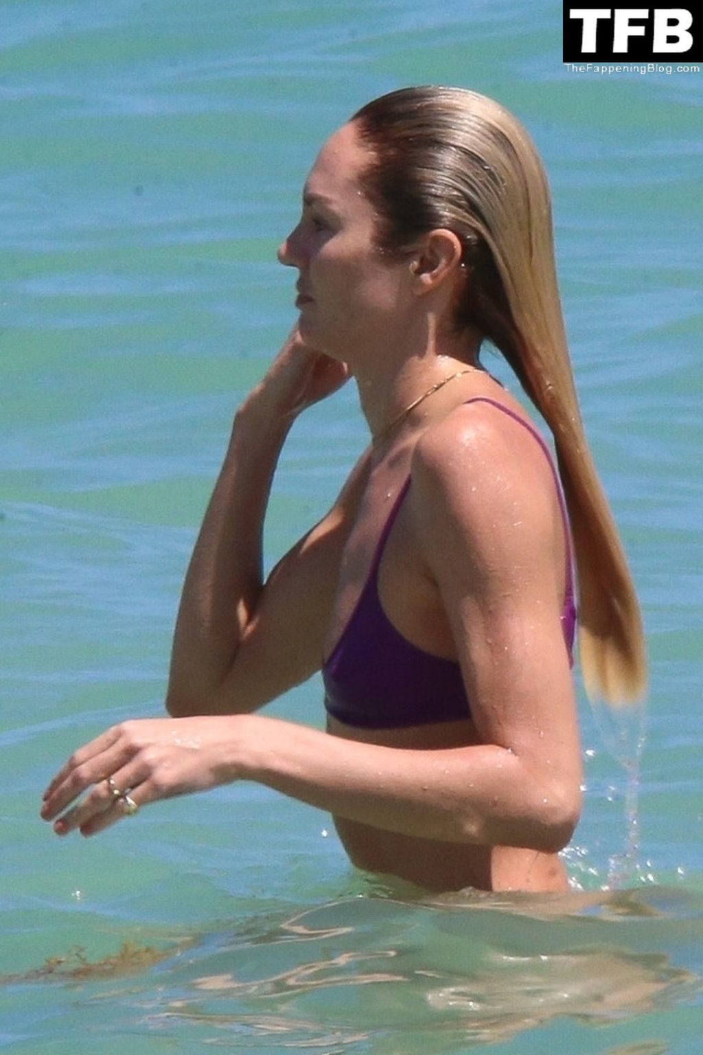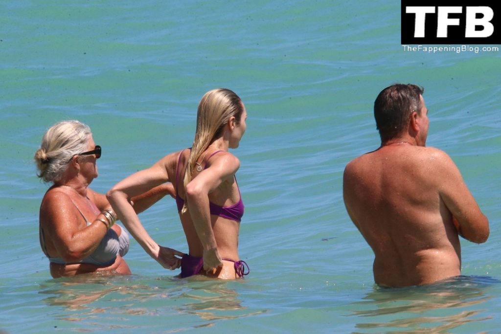 Candice Swanepoel exhibe sa silhouette tonique dans un bikini violet presque invisible lors d’une escapade à Miami avec ses parents vendredi.