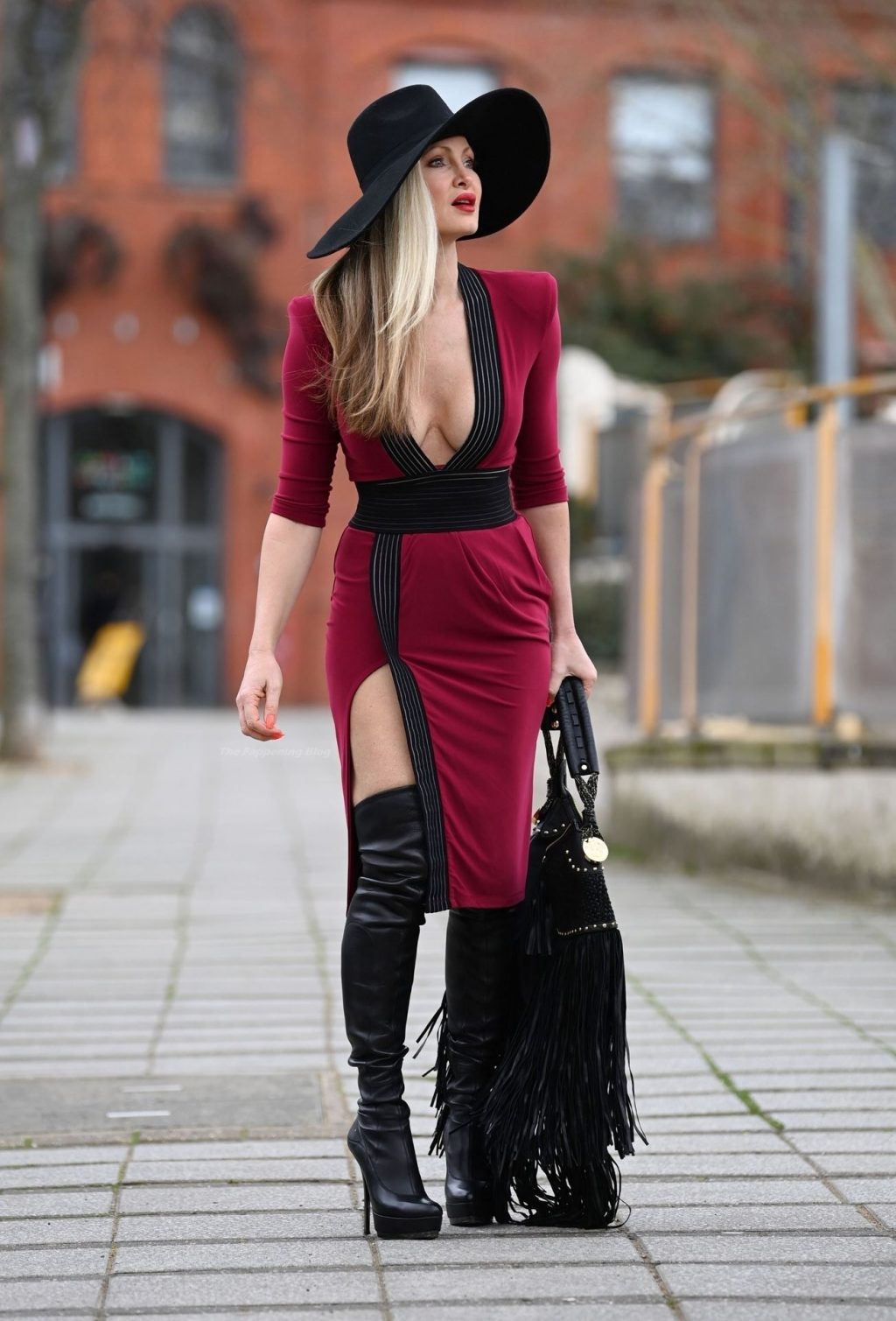 Model Caprice expose son ample décolleté dans une robe fendue sexy jusqu’à la cuisse et des bottes, tandis que son chapeau s’envole sous des conditions vraiment venteuses alors qu’elle sort d’une réunion de production à Londres, 03/11/2021.