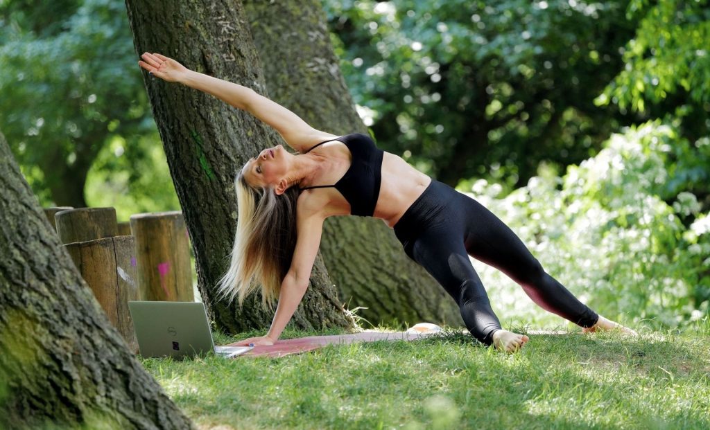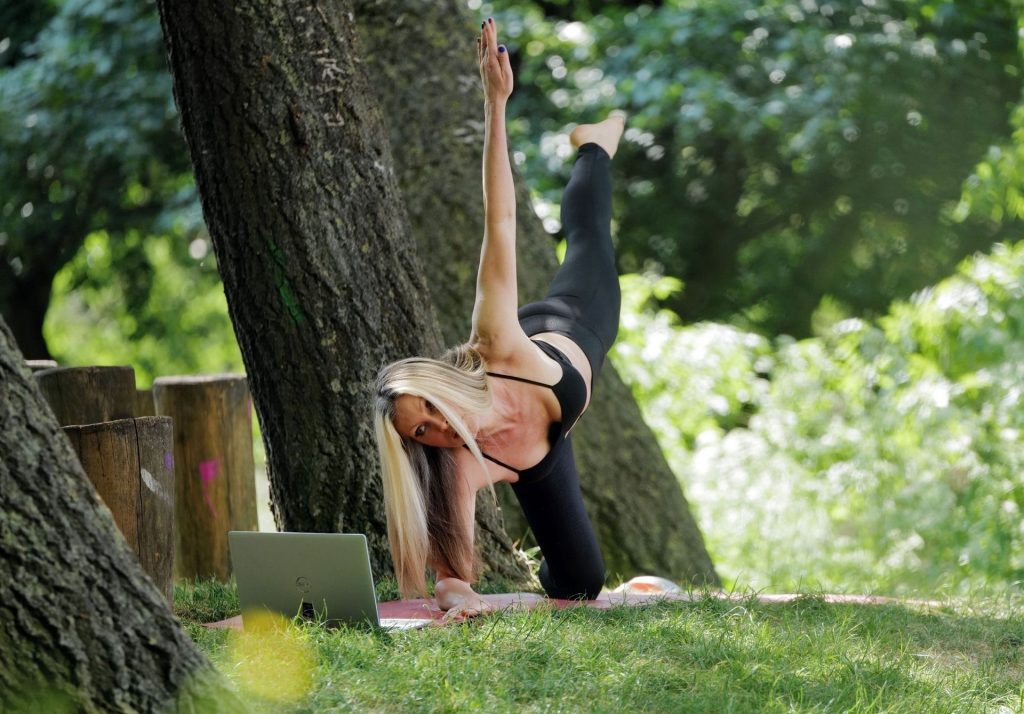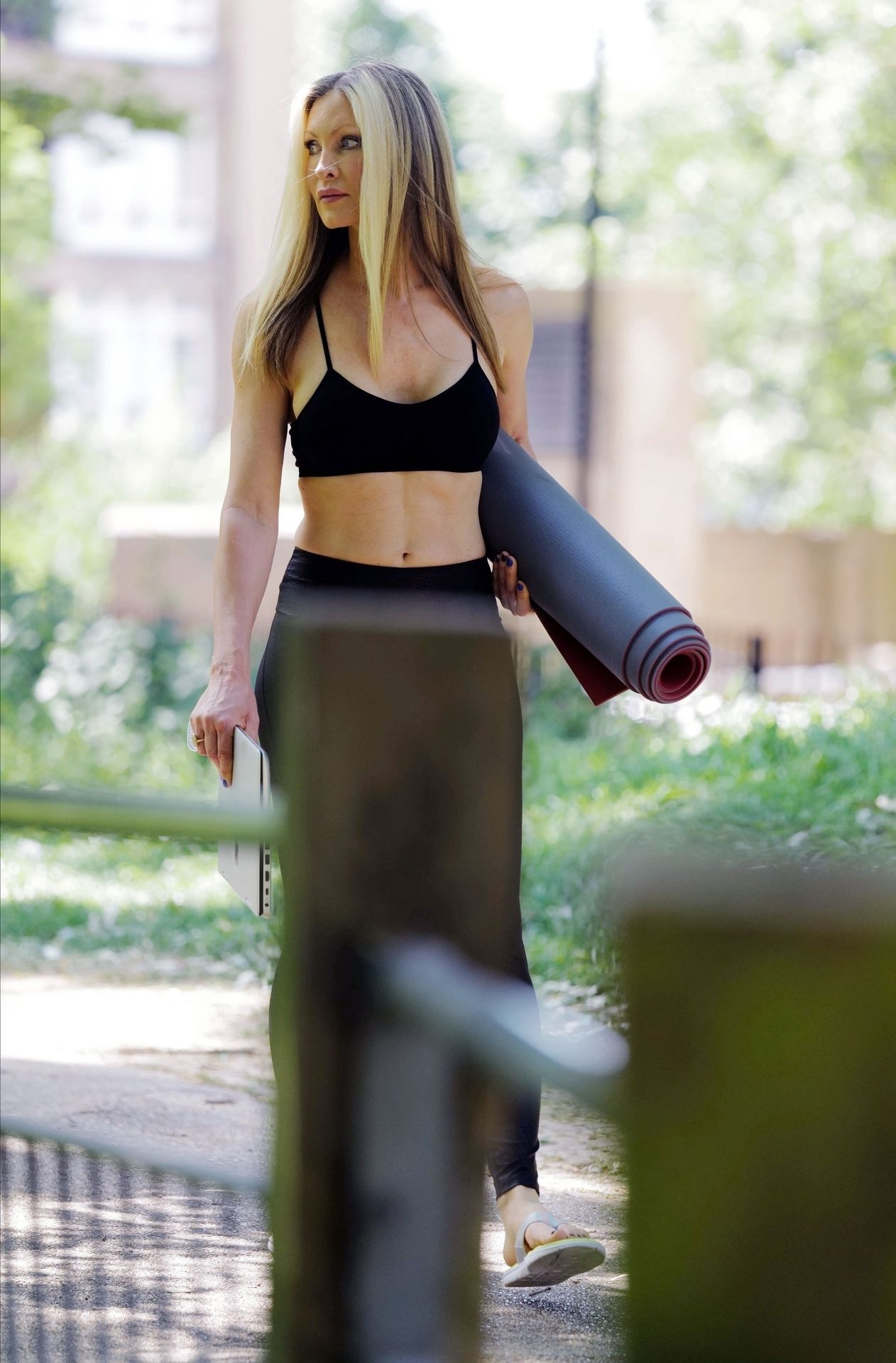 American model Caprice est photographiée en train de diffuser ses cours de yoga en ligne depuis un parc, portant un petit débardeur et des leggings à Londres, 13/06/2020.