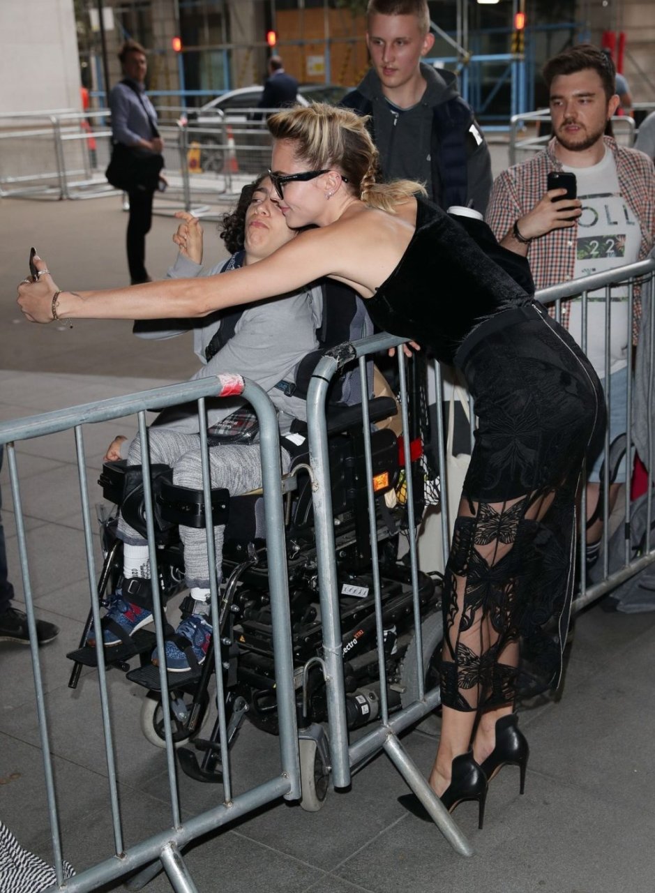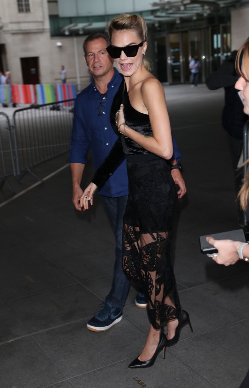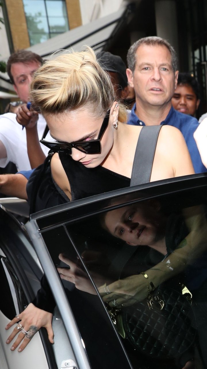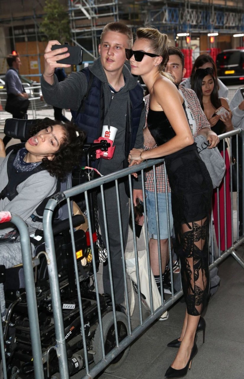 L’actrice/mannequin Cara Delevingne est élégante dans une robe noire alors qu’elle salue ses fans aux studios de la BBC à Londres, le 29/08/2019.