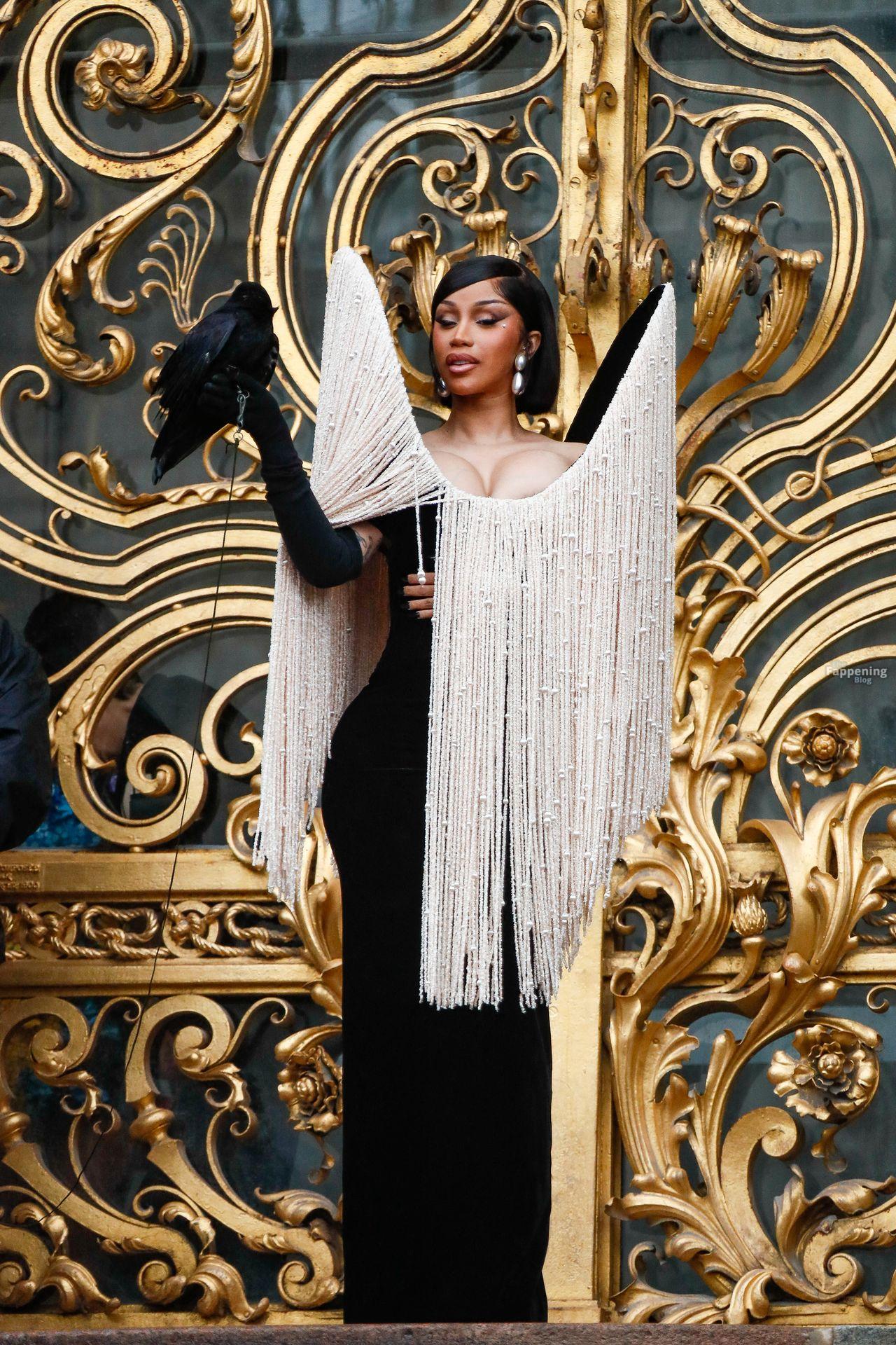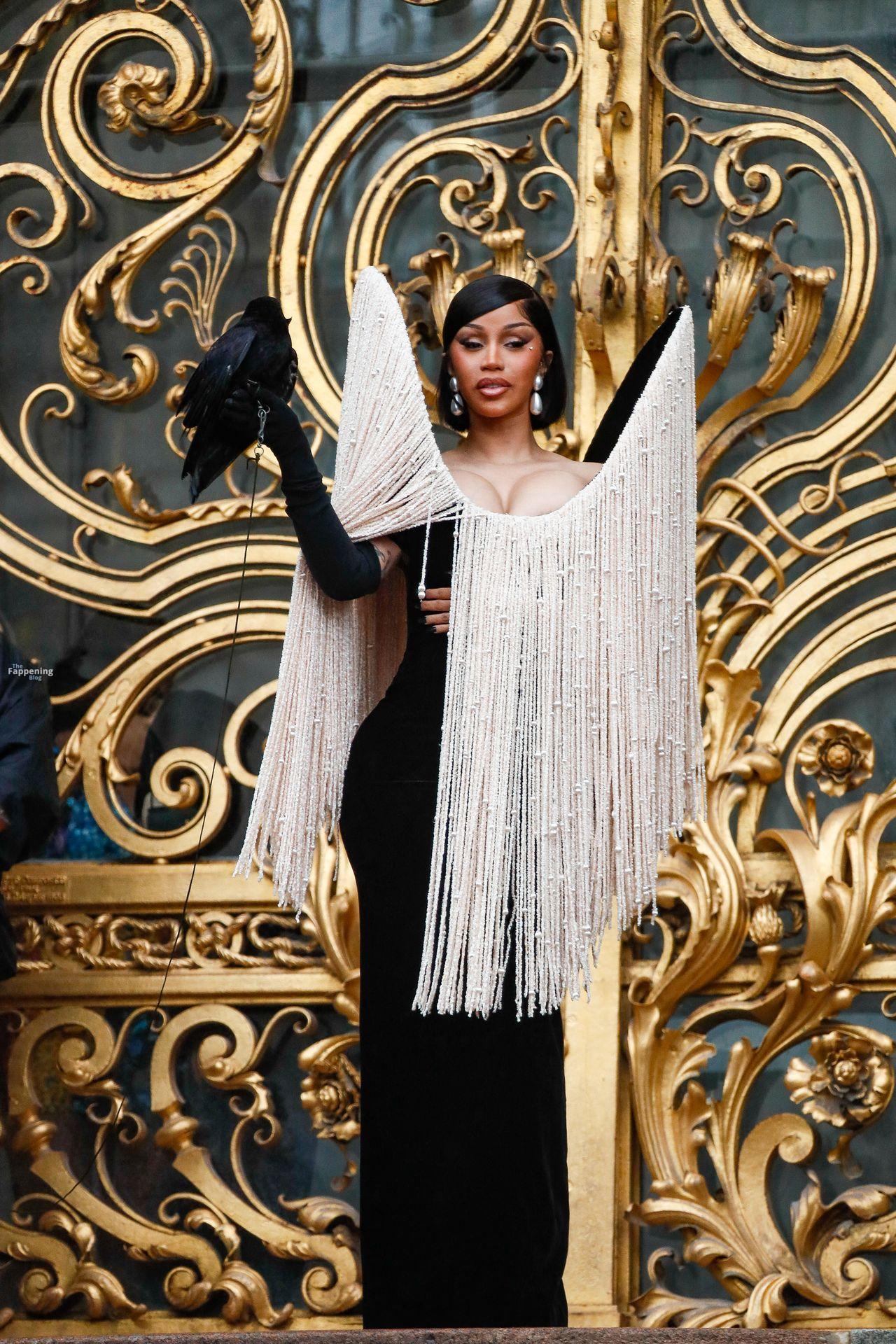 Cardi B est arrivée au défilé de couture Schiaparelli à Paris avec une entrée sauvage, arborant un corbeau vivant perché sur sa main.