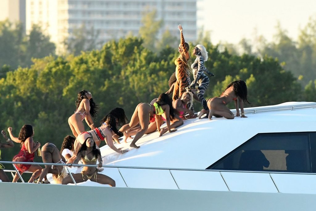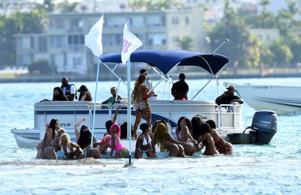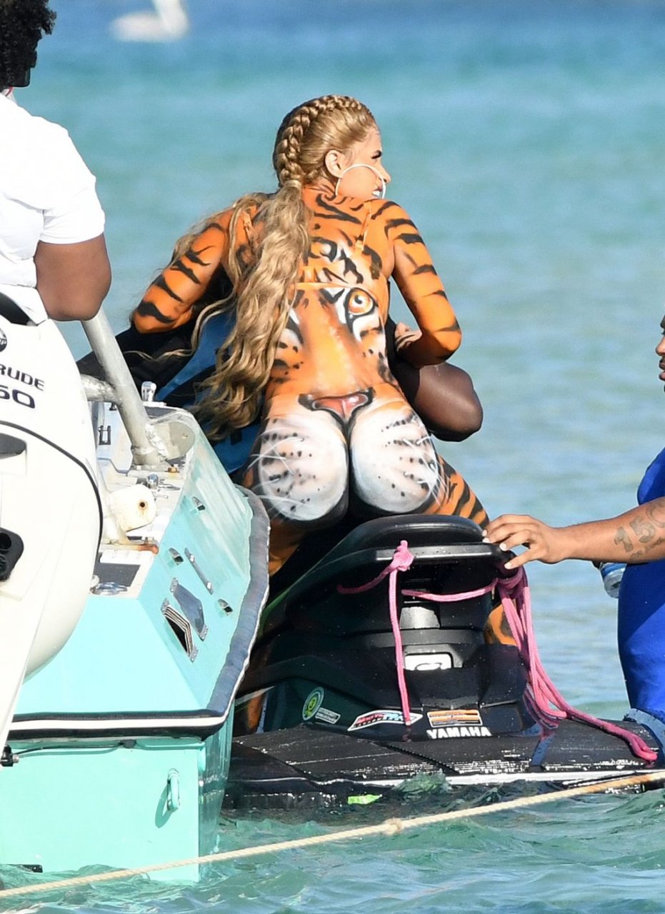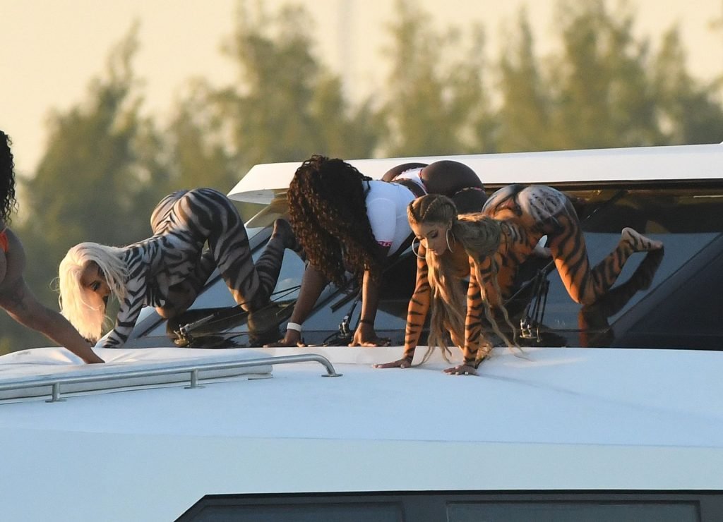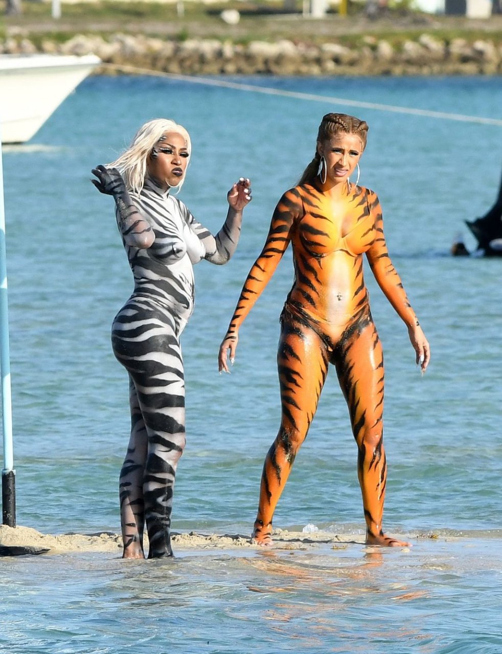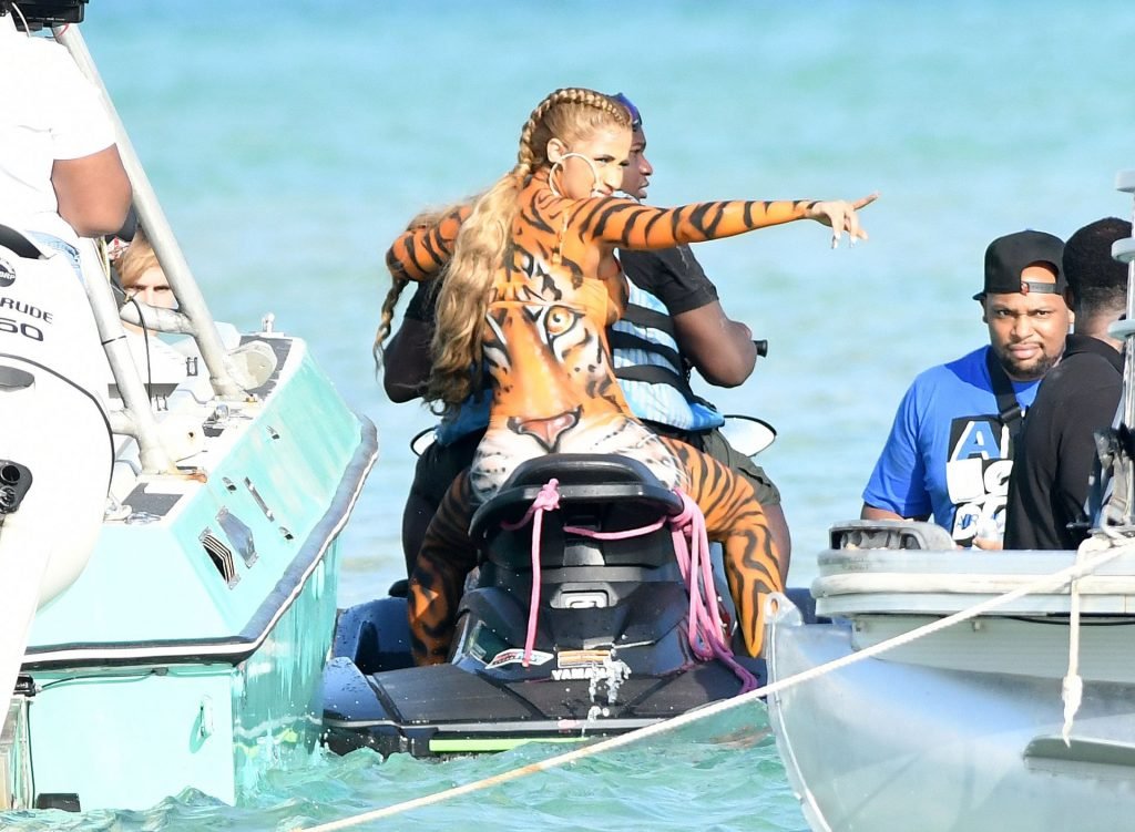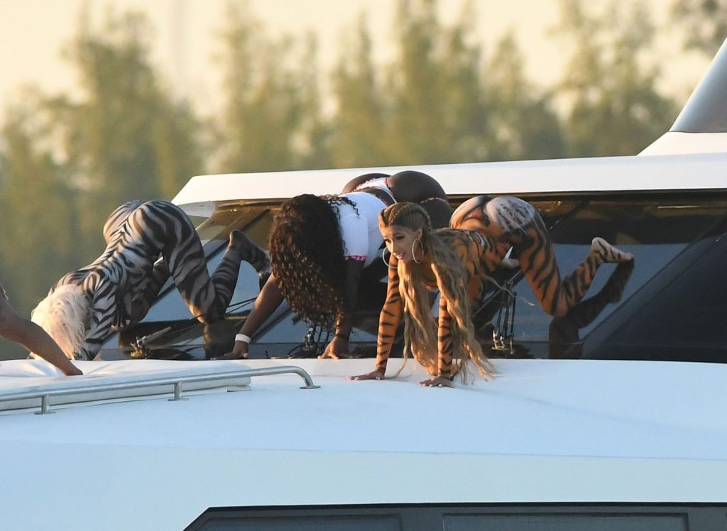 Le rappeur Cardi B (Belcalis Almanzar) porte une peinture corporelle tigre alors qu’elle fait du twerk sur un yacht lors d’un tournage vidéo à Miami, après avoir manqué une audience au tribunal à New York, le 12/03/2018.