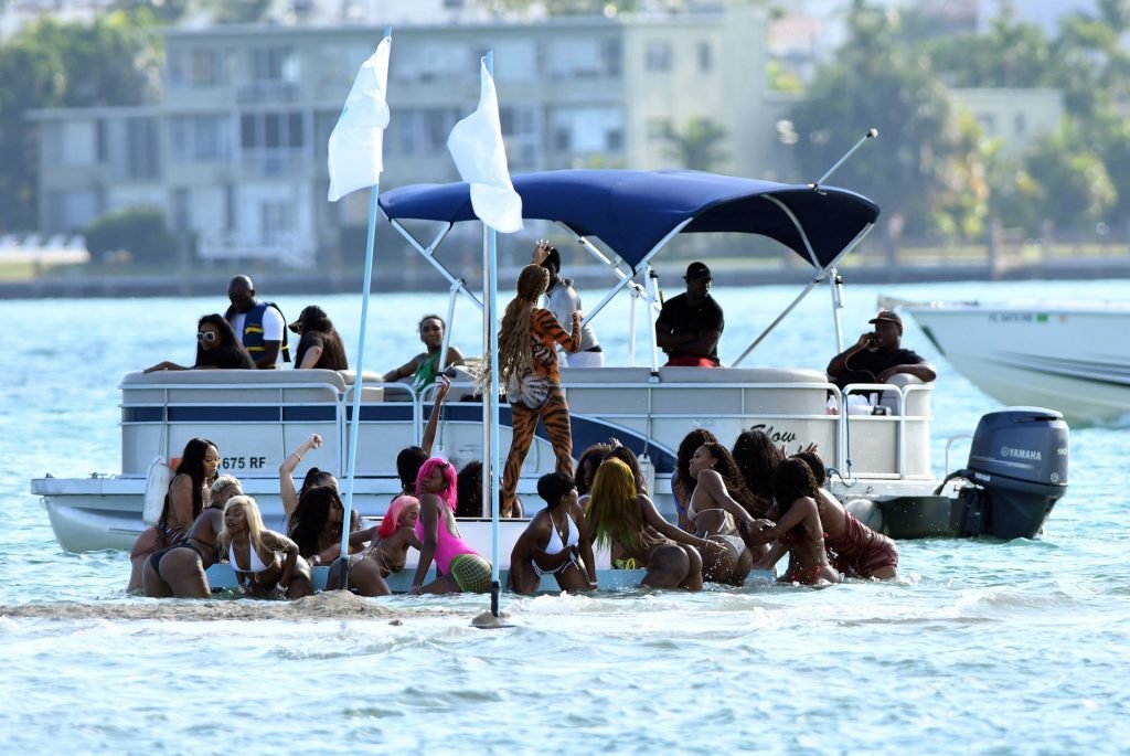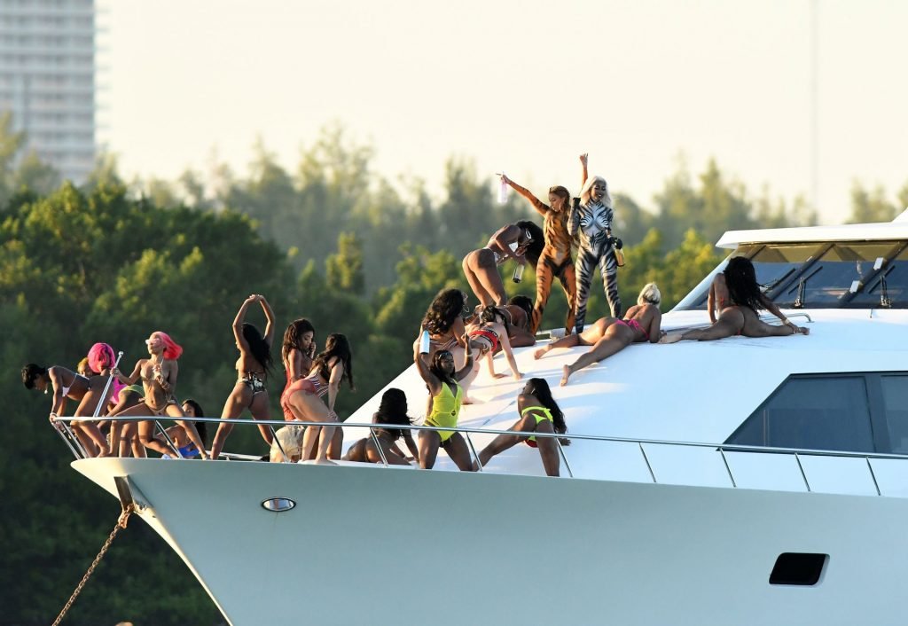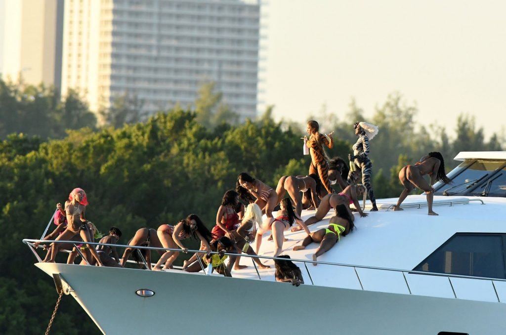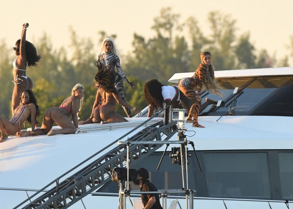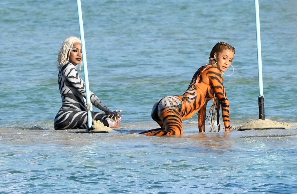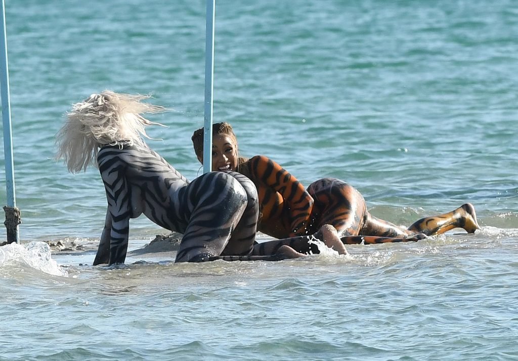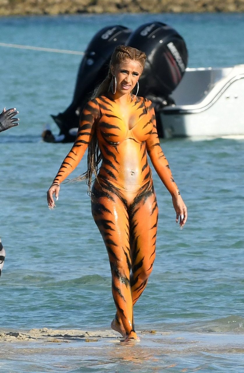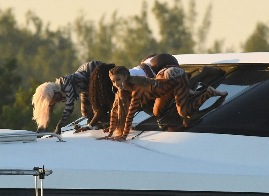 Le rappeur Cardi B (Belcalis Almanzar) porte une peinture corporelle tigre alors qu’elle fait du twerk sur un yacht lors d’un tournage vidéo à Miami, après avoir manqué une audience au tribunal à New York, le 12/03/2018.