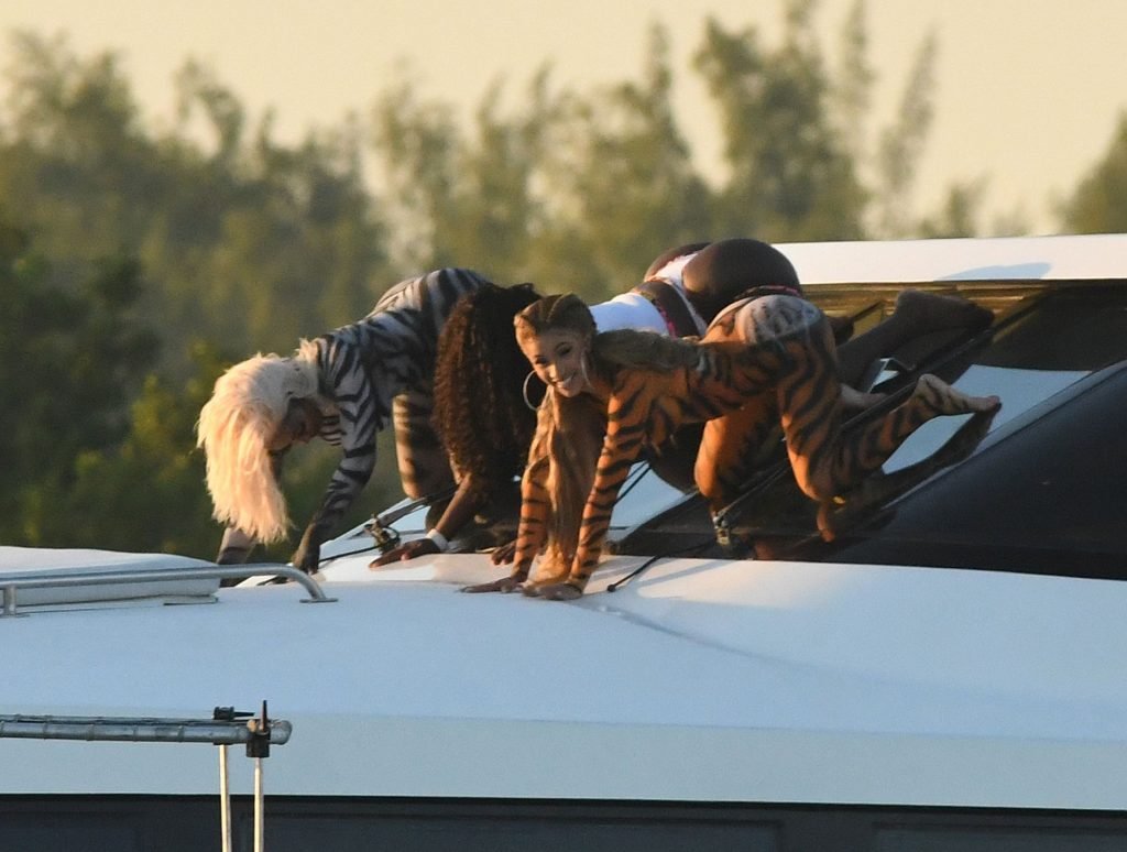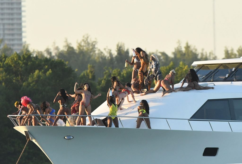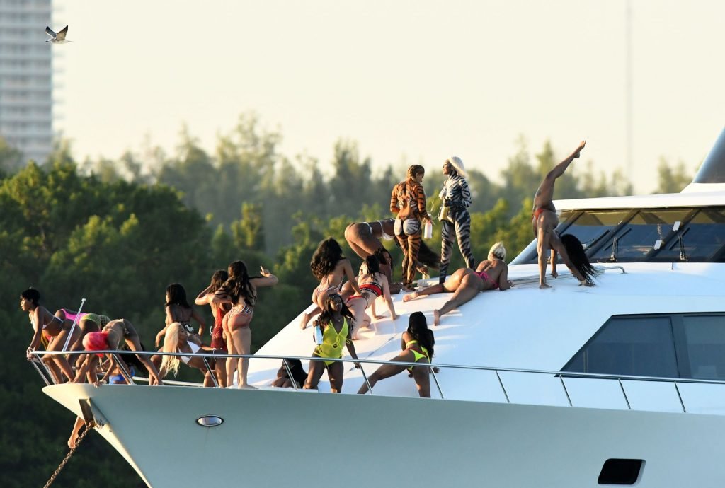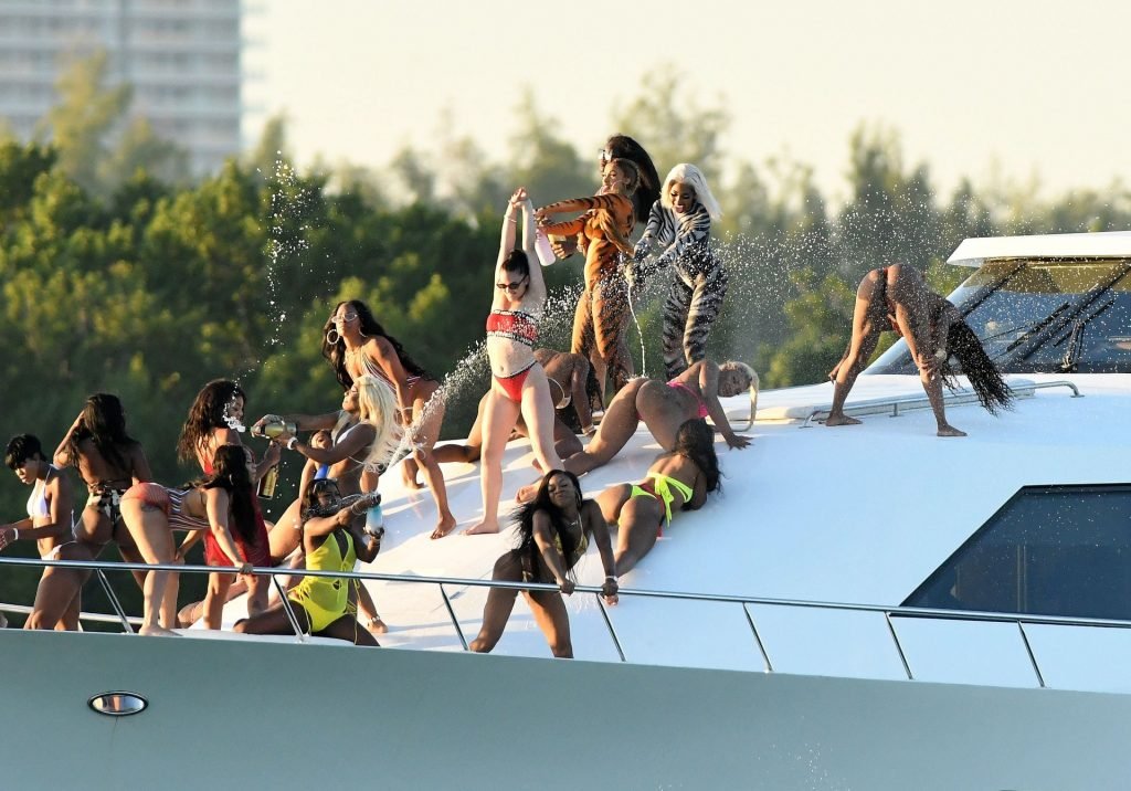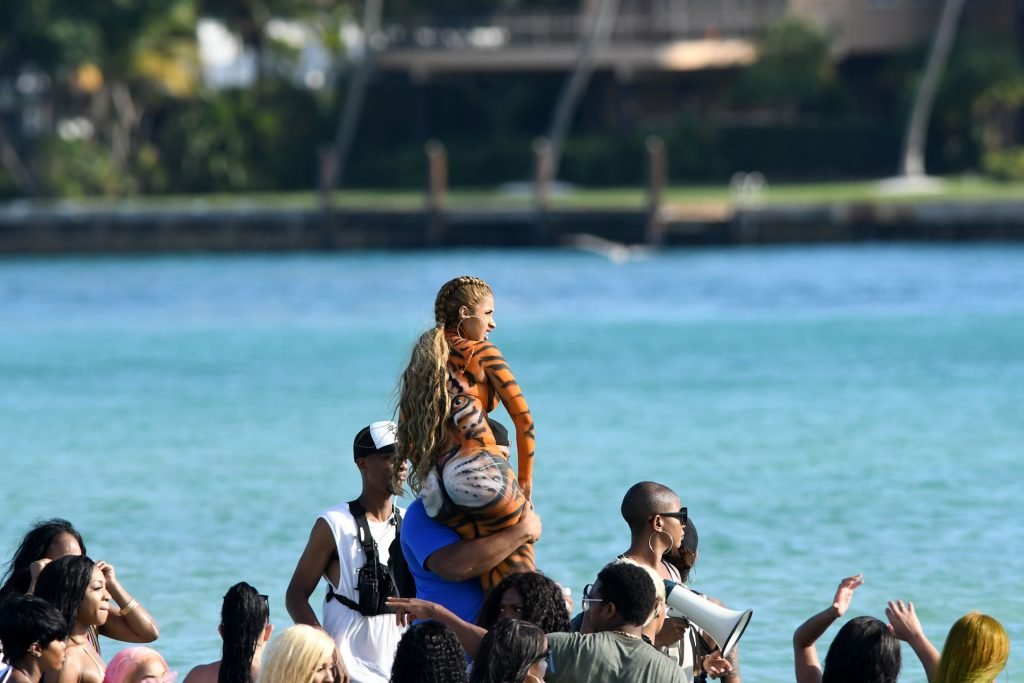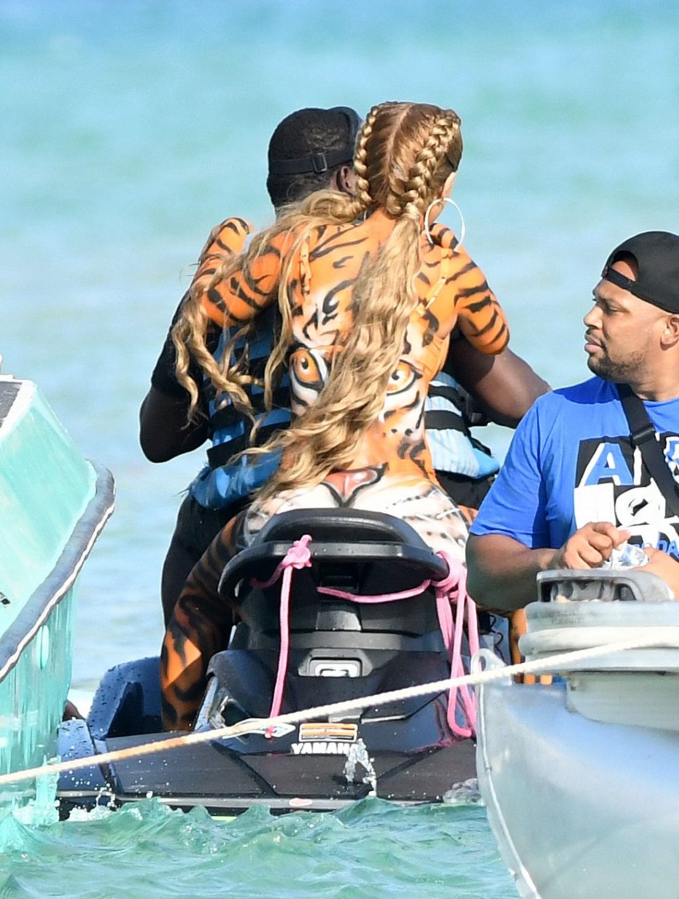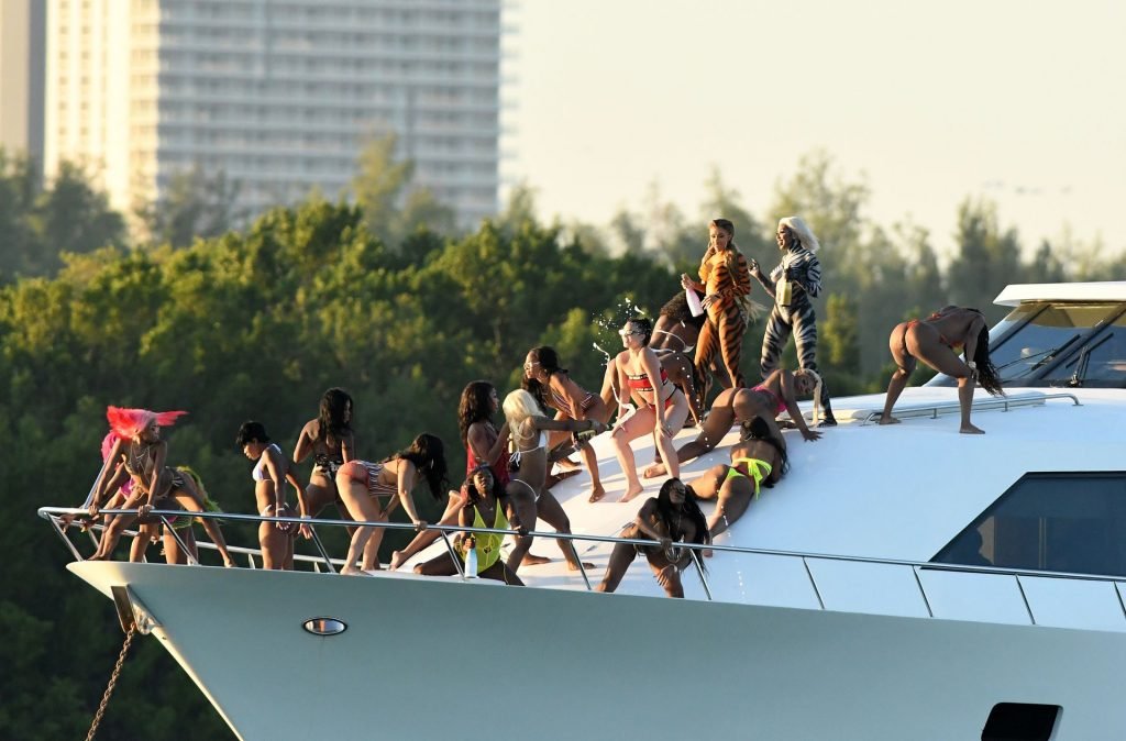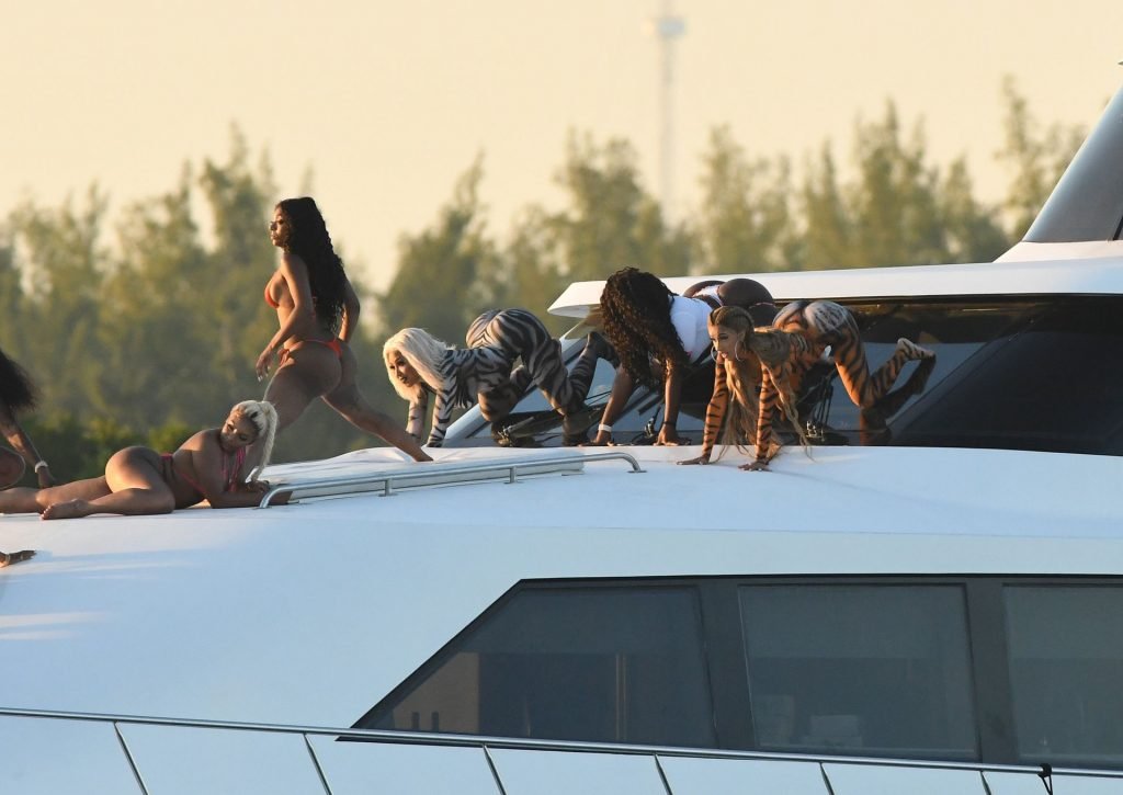 Le rappeur Cardi B (Belcalis Almanzar) porte une peinture corporelle tigre alors qu’elle fait du twerk sur un yacht lors d’un tournage vidéo à Miami, après avoir manqué une audience au tribunal à New York, le 12/03/2018.