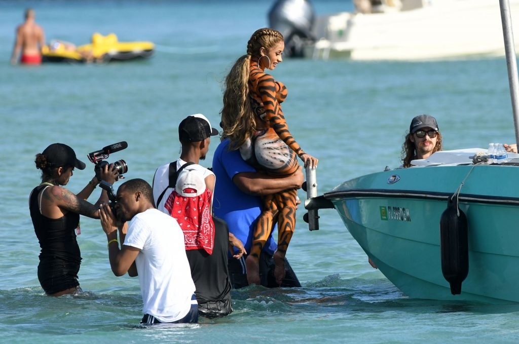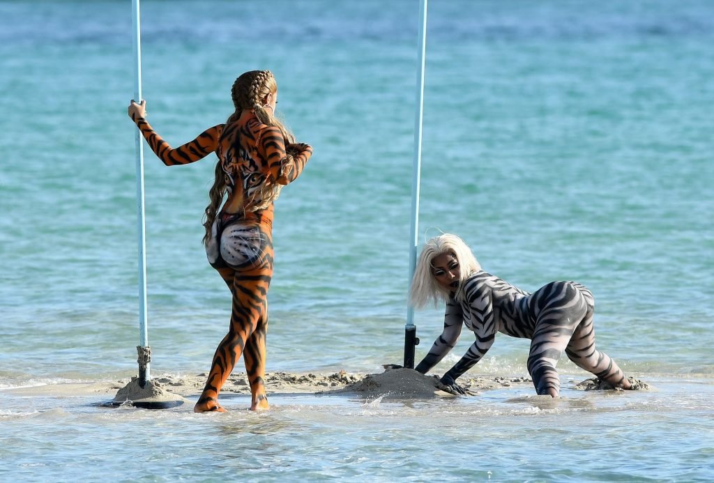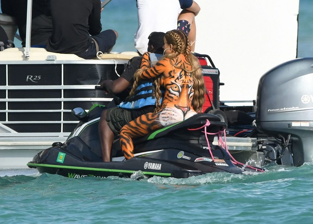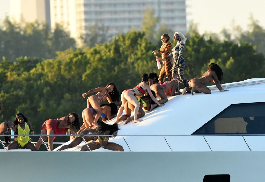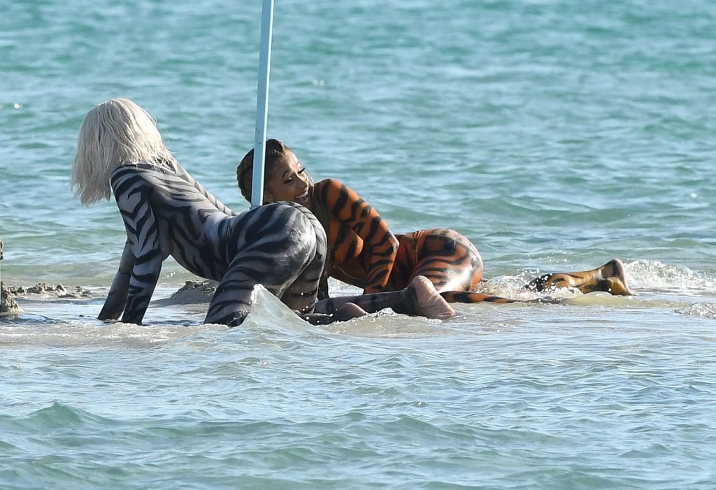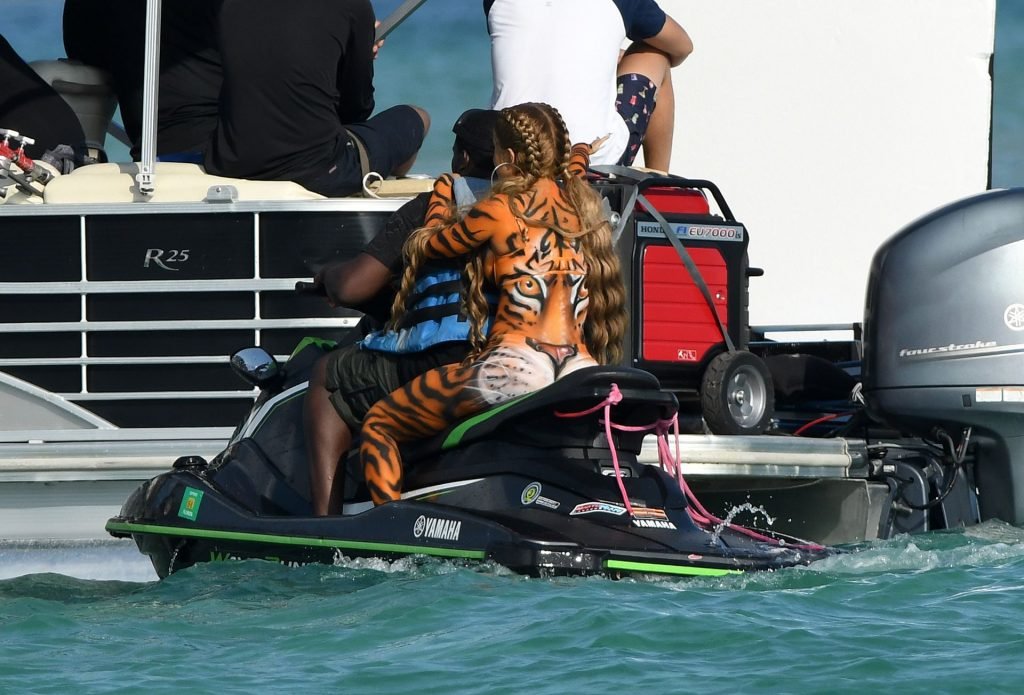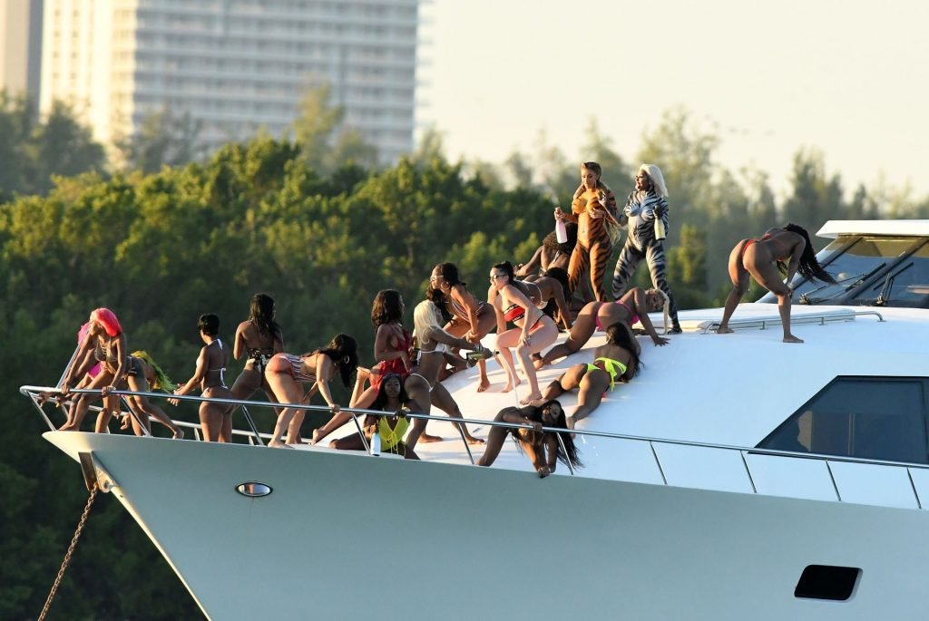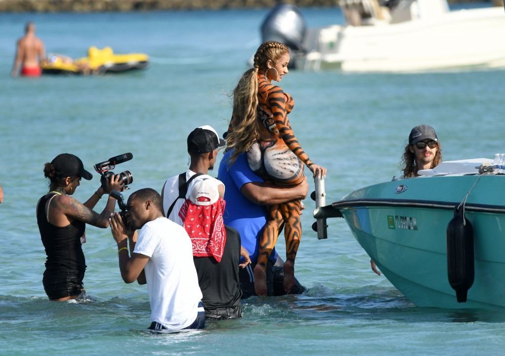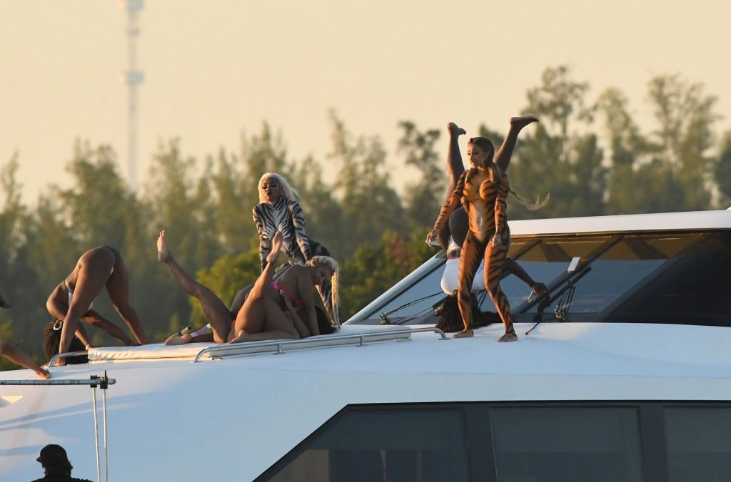 Le rappeur Cardi B (Belcalis Almanzar) porte une peinture corporelle tigre alors qu’elle fait du twerk sur un yacht lors d’un tournage vidéo à Miami, après avoir manqué une audience au tribunal à New York, le 12/03/2018.