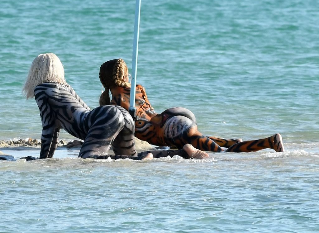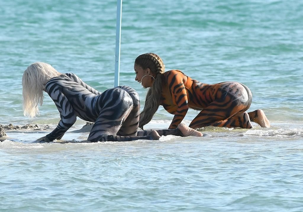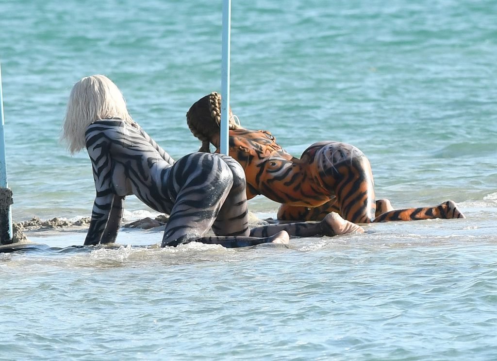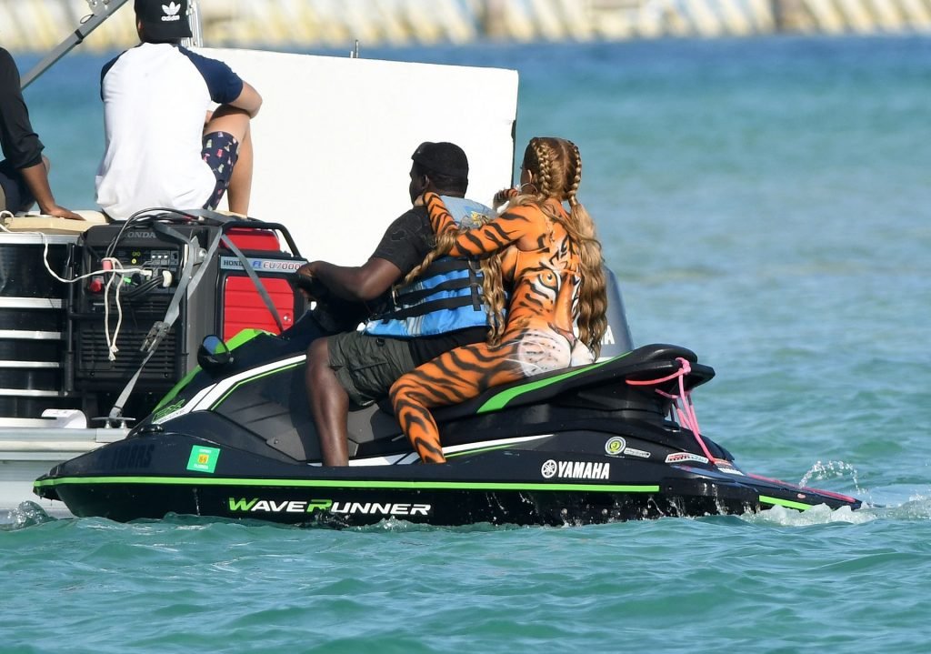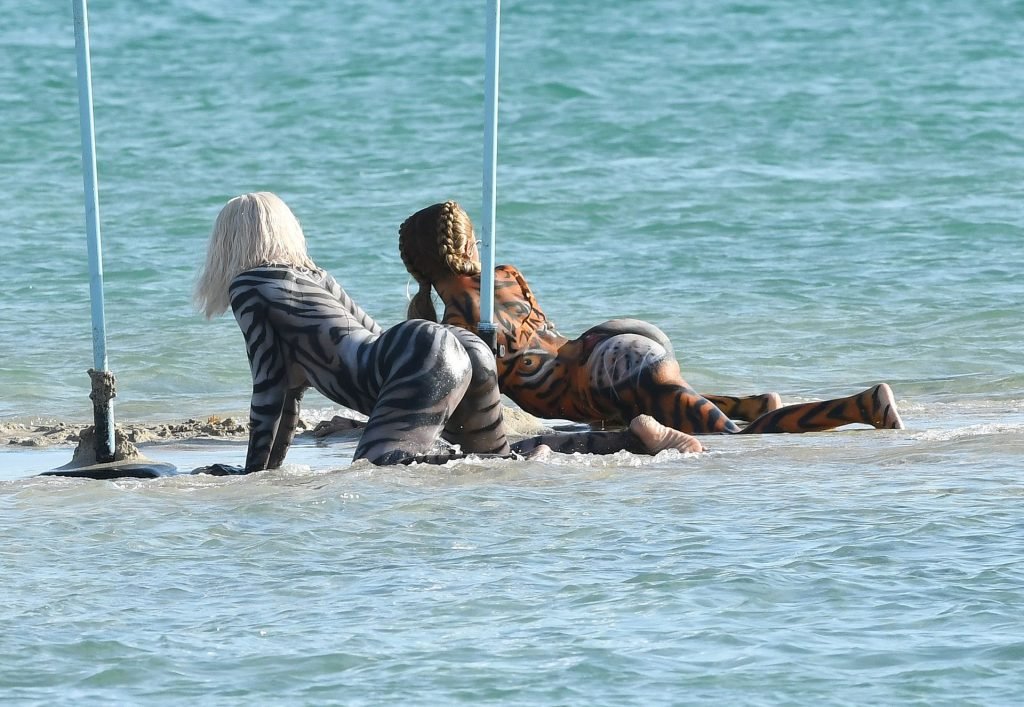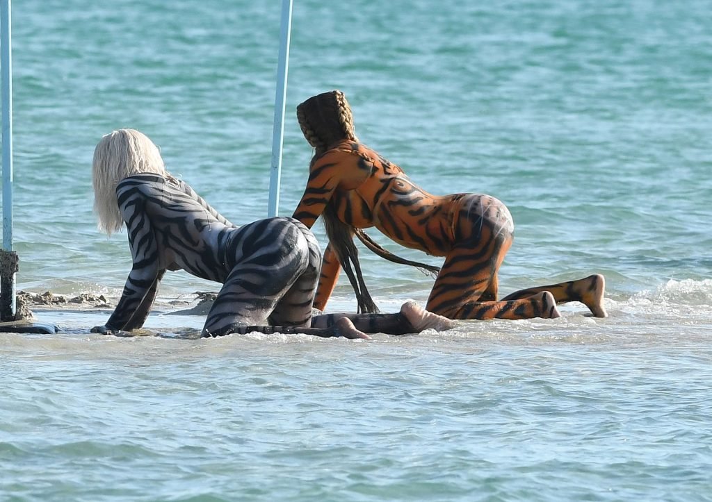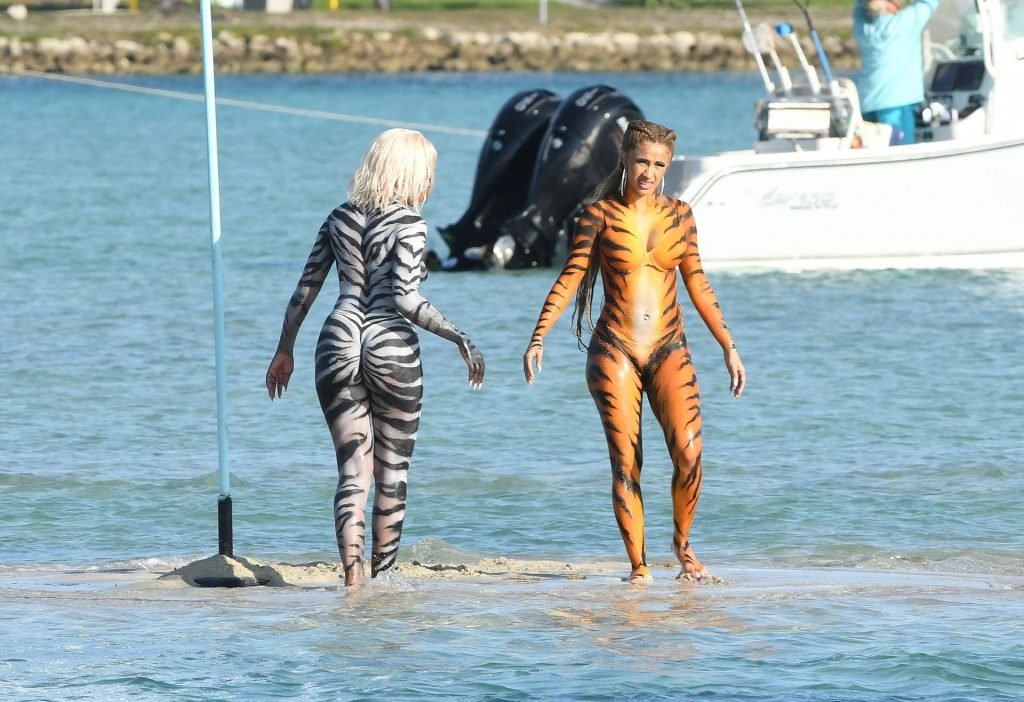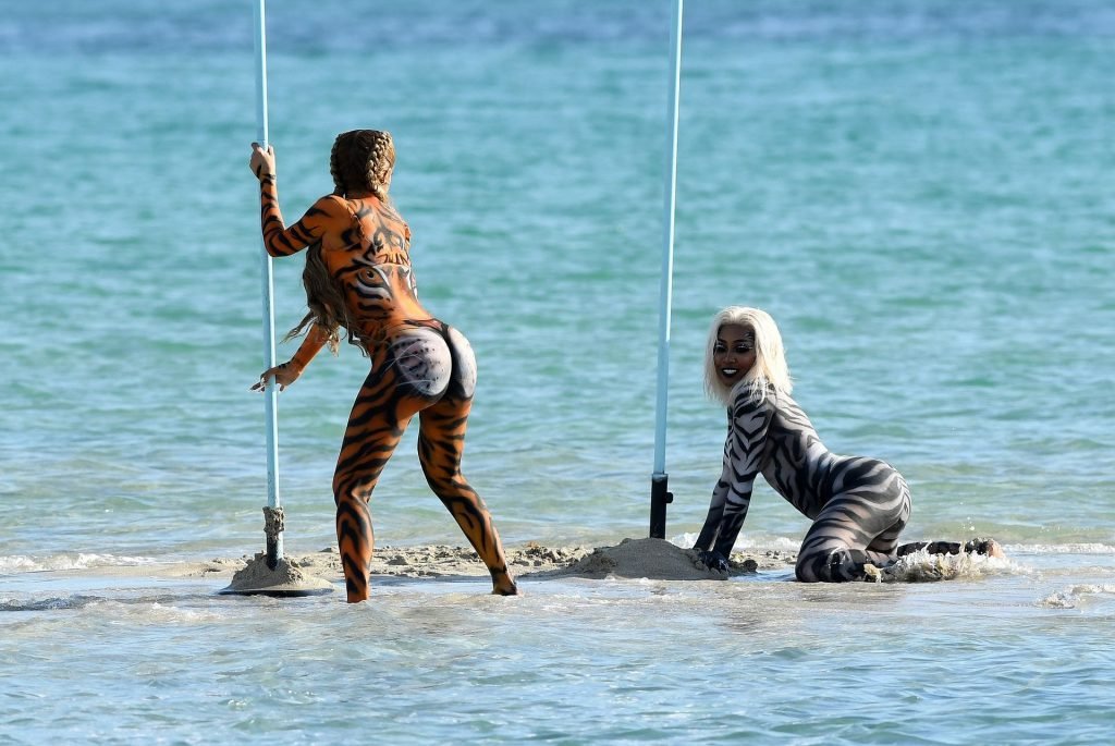 Le rappeur Cardi B (Belcalis Almanzar) porte une peinture corporelle tigre alors qu’elle fait du twerk sur un yacht lors d’un tournage vidéo à Miami, après avoir manqué une audience au tribunal à New York, le 12/03/2018.