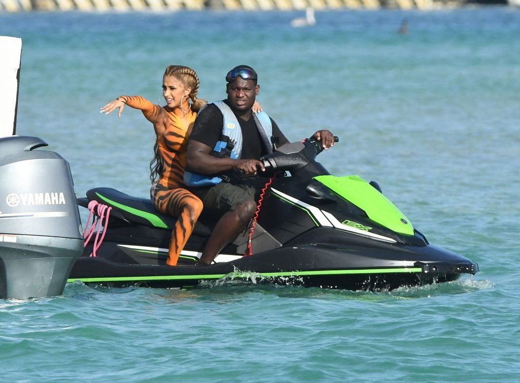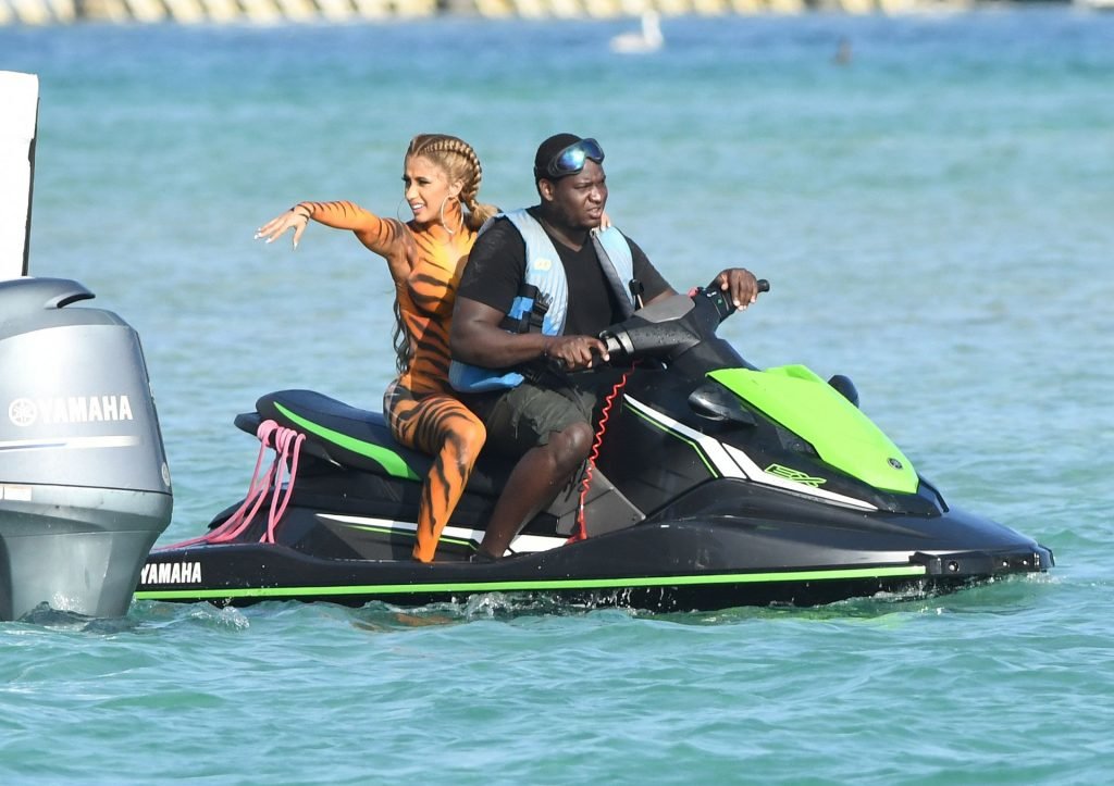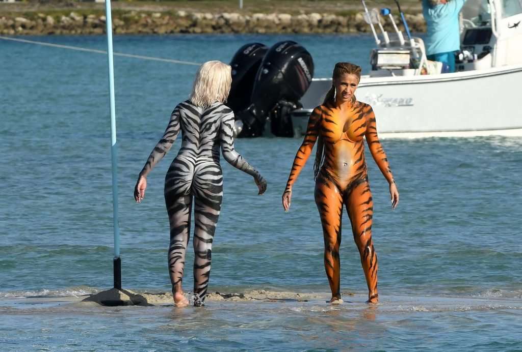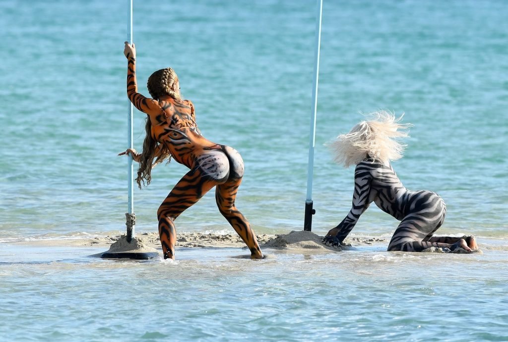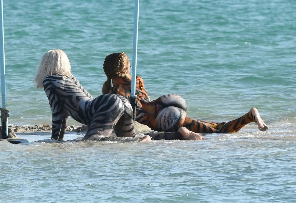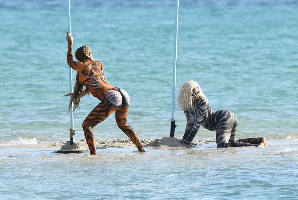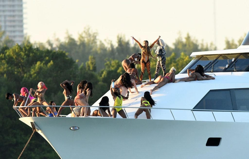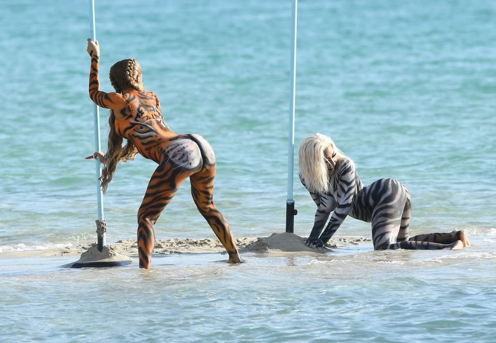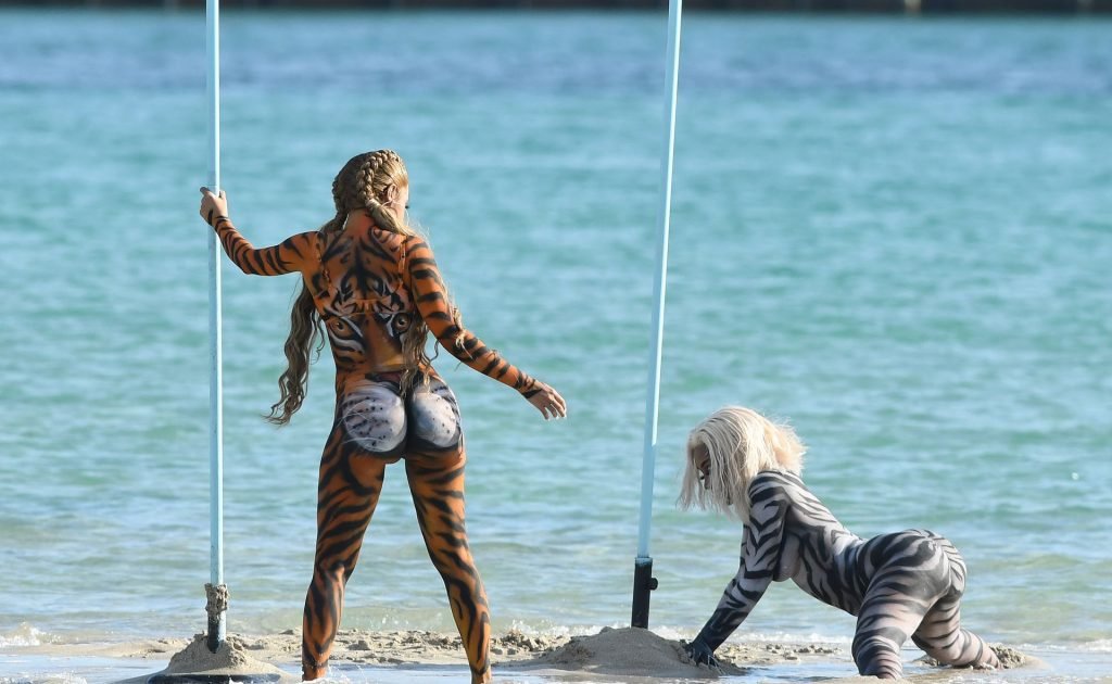 Le rappeur Cardi B (Belcalis Almanzar) porte une peinture corporelle tigre alors qu’elle fait du twerk sur un yacht lors d’un tournage vidéo à Miami, après avoir manqué une audience au tribunal à New York, le 12/03/2018.