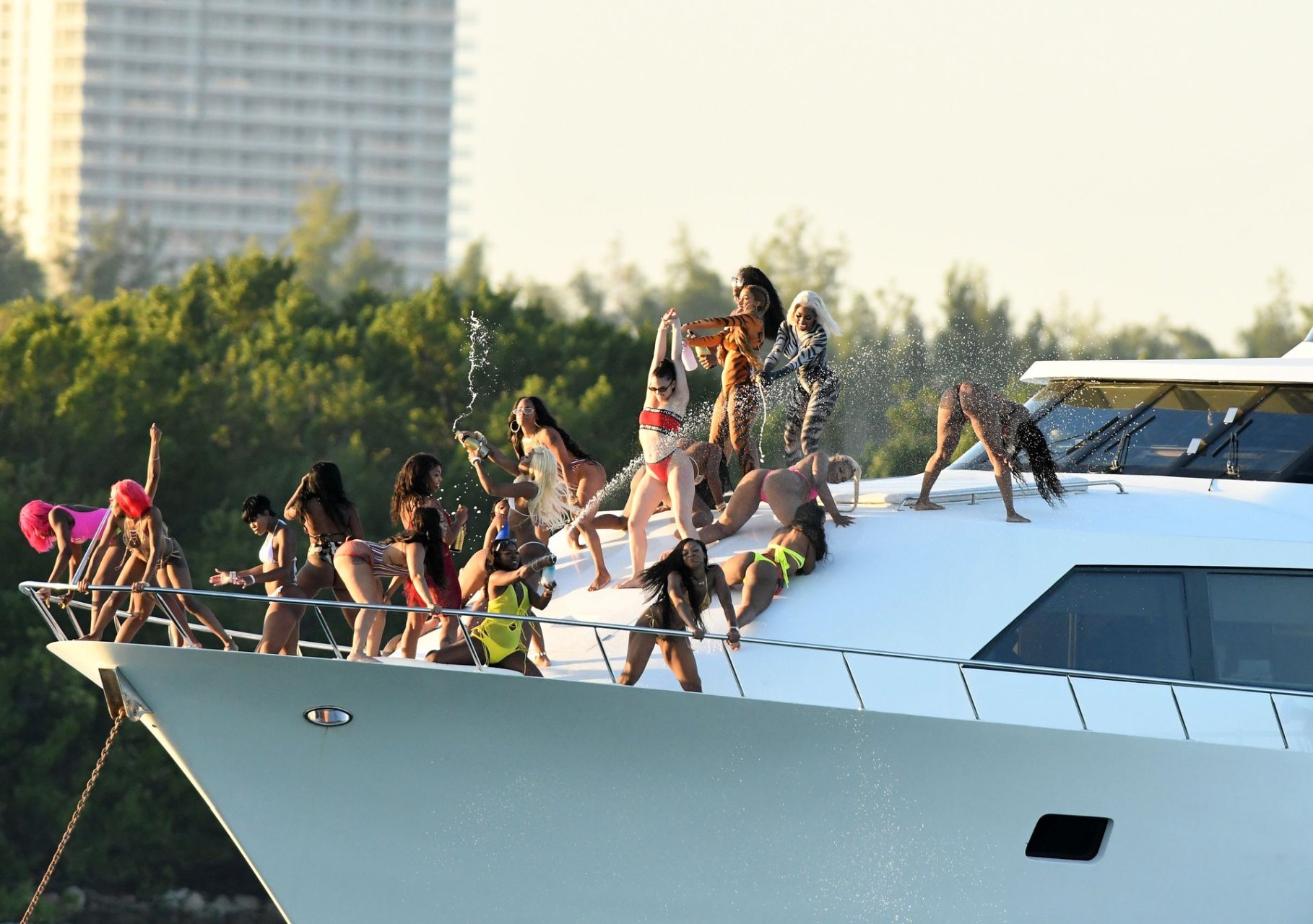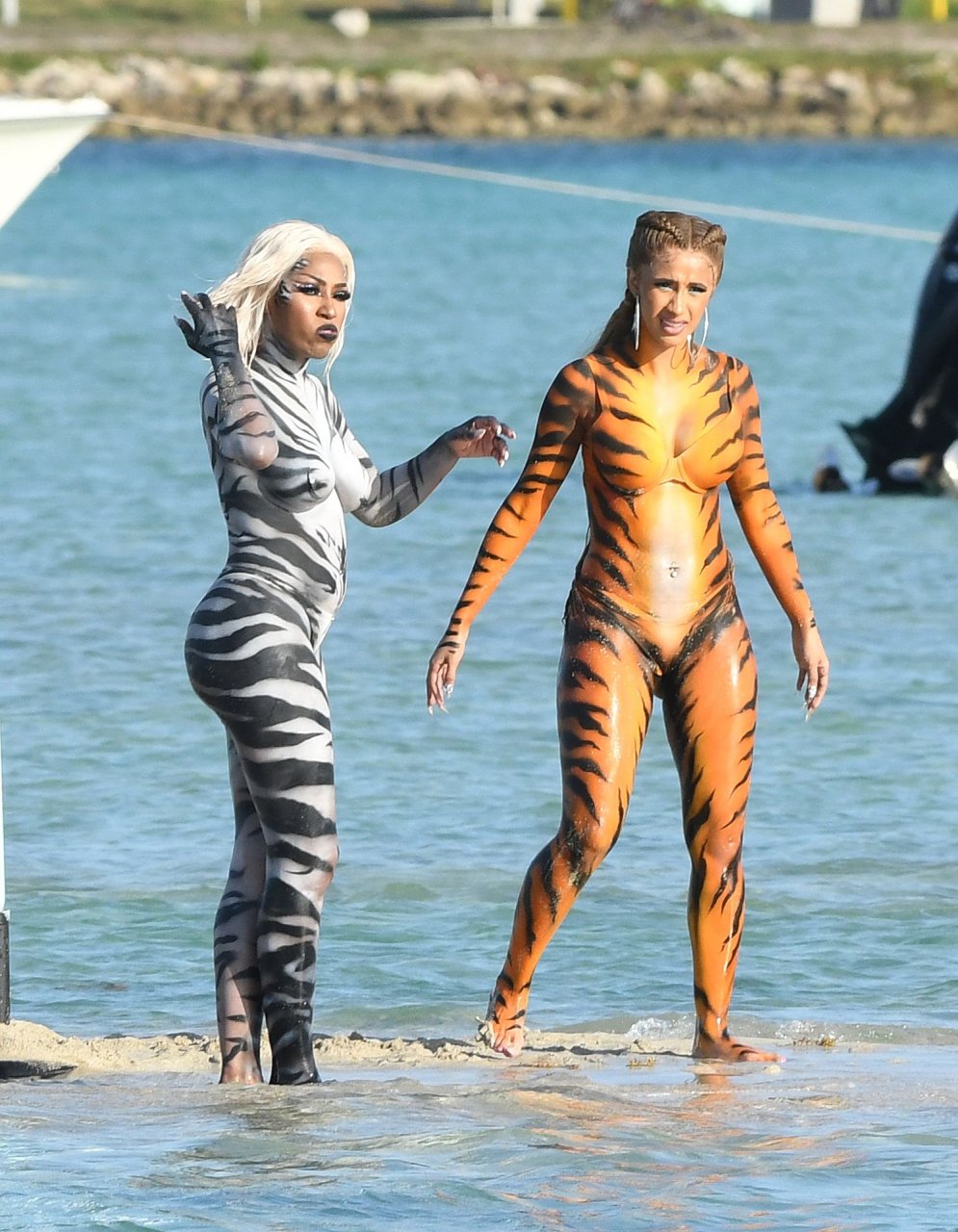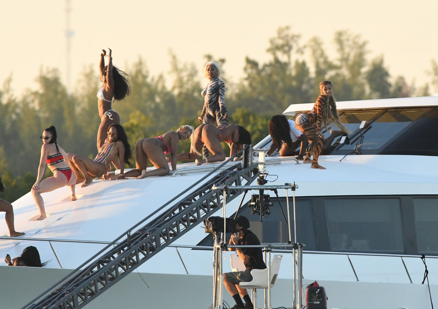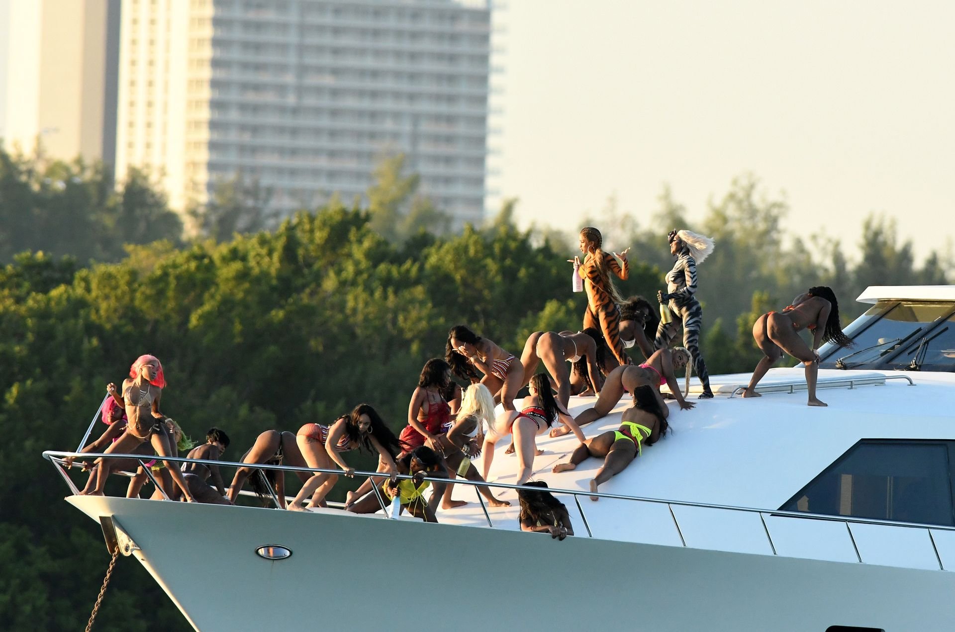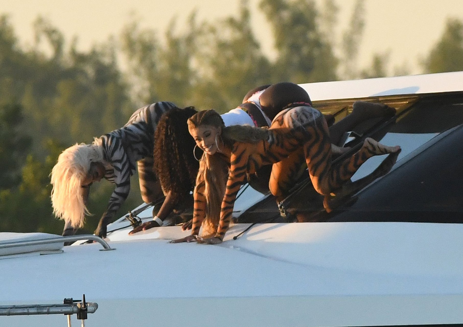 Le rappeur Cardi B (Belcalis Almanzar) porte une peinture corporelle tigre alors qu’elle fait du twerk sur un yacht lors d’un tournage vidéo à Miami, après avoir manqué une audience au tribunal à New York, le 12/03/2018.