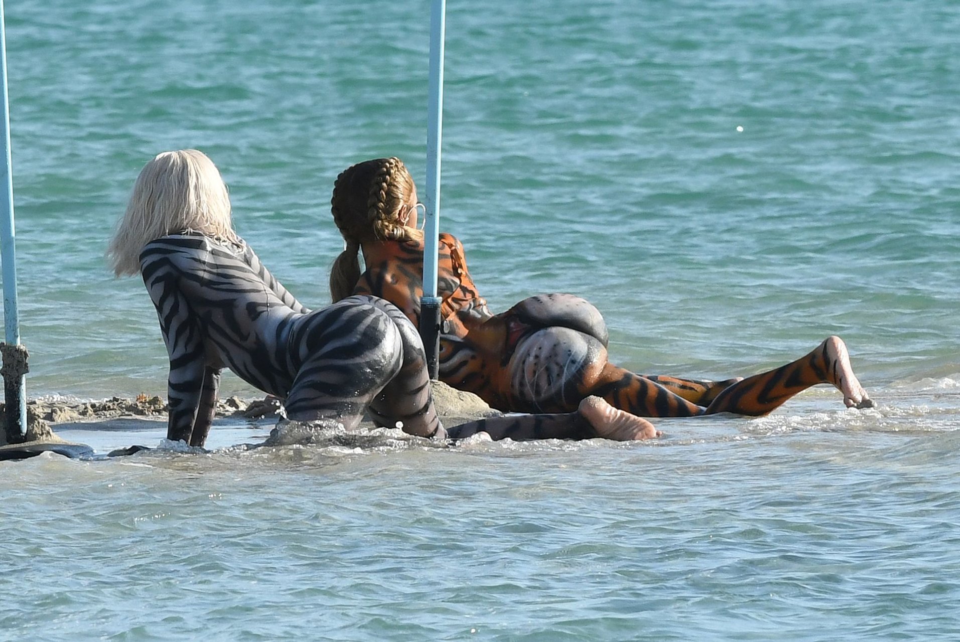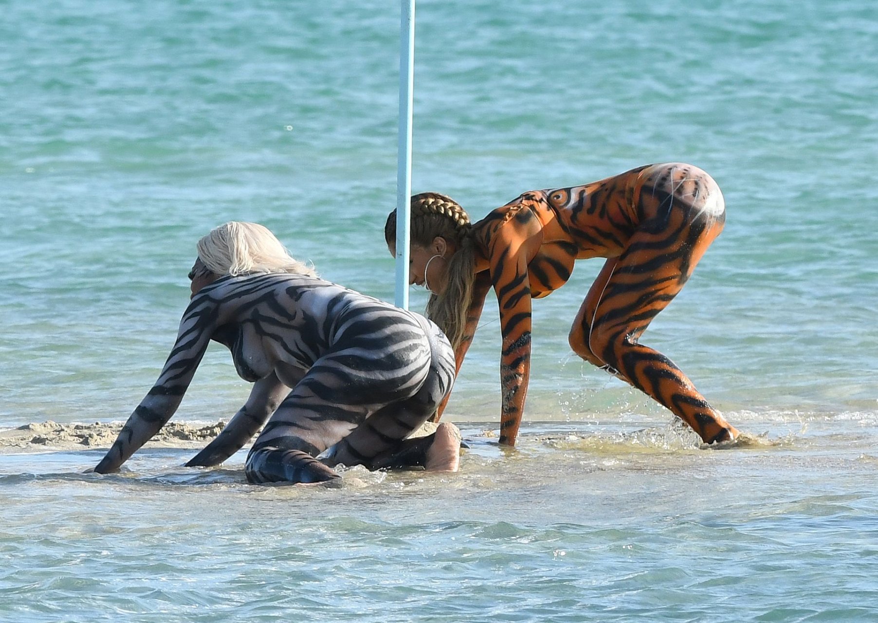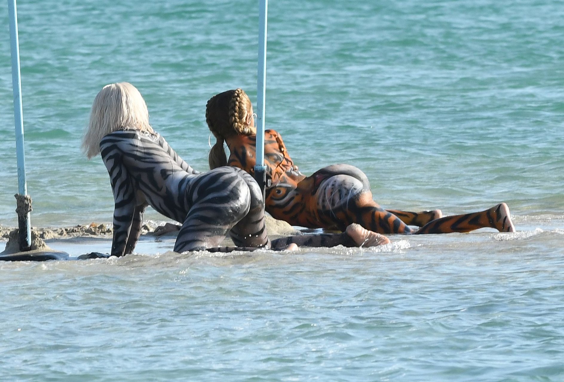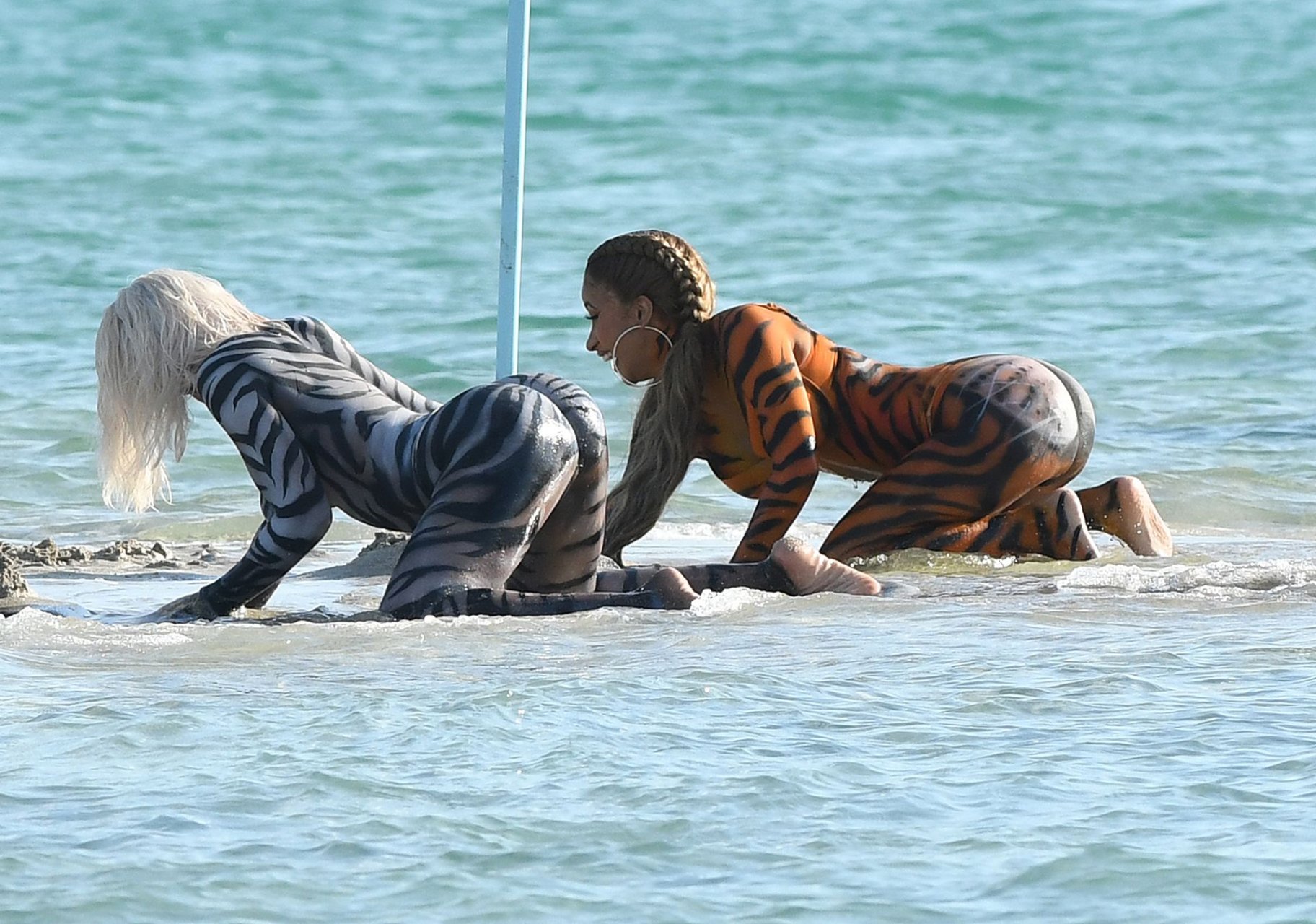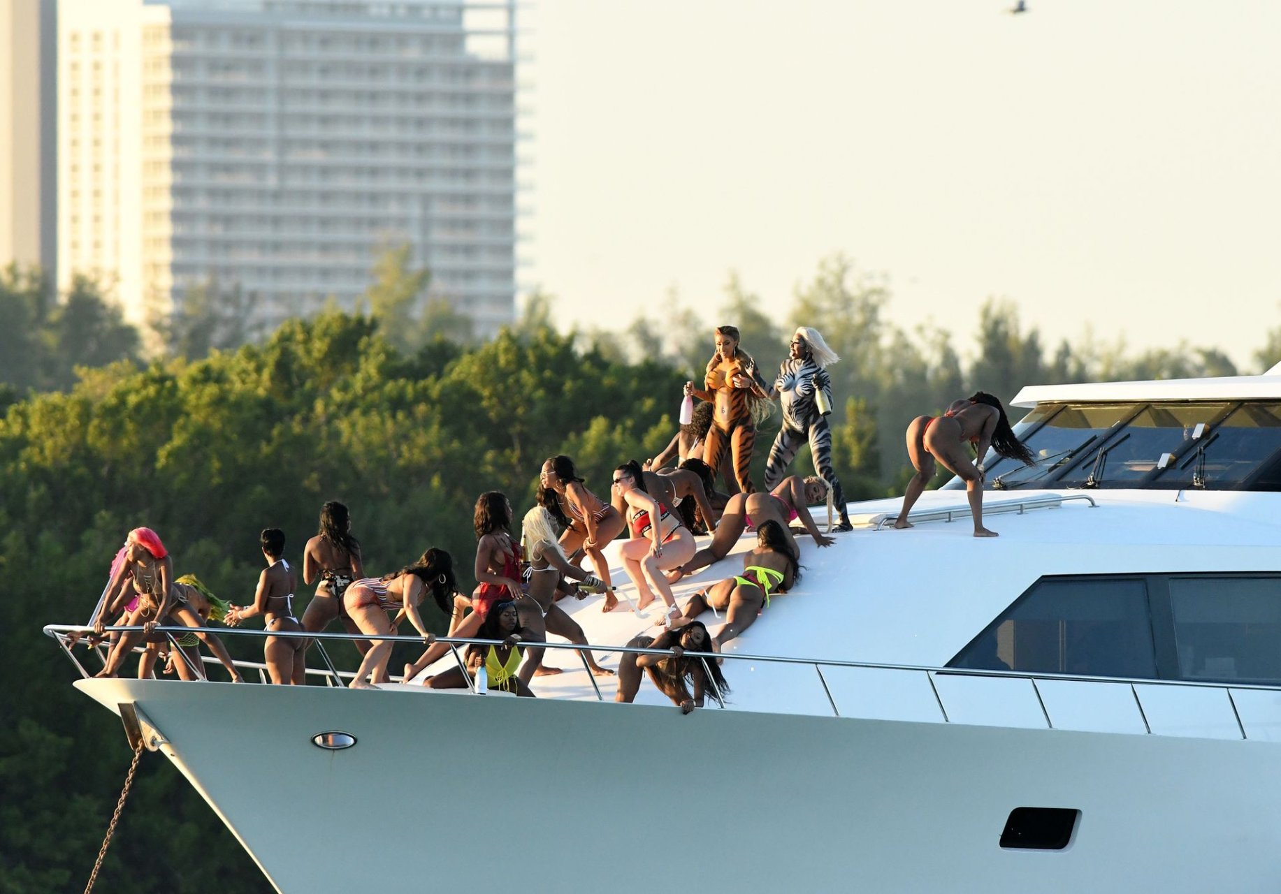 Le rappeur Cardi B (Belcalis Almanzar) porte une peinture corporelle tigre alors qu’elle fait du twerk sur un yacht lors d’un tournage vidéo à Miami, après avoir manqué une audience au tribunal à New York, le 12/03/2018.