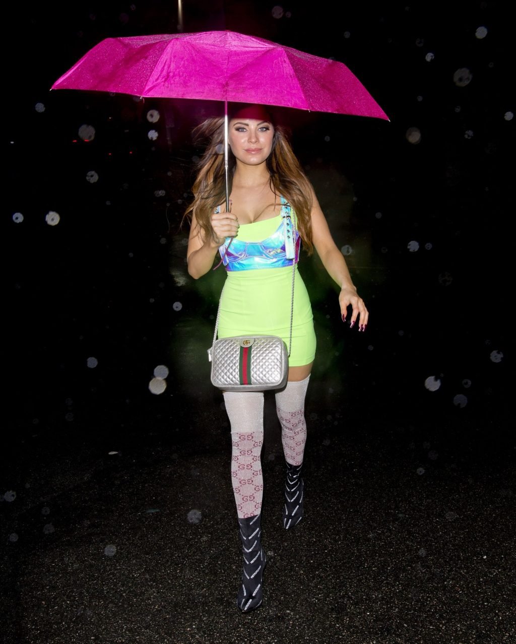 Le mannequin britannique Playboy Carla Howe brave la forte pluie de Los Angeles mais perd son parapluie dans le vent alors qu’elle a été vue se rendant à la fête de la Saint-Valentin de Dan Bilzerian à Beverly Hills, le 14/02/2019.