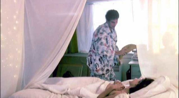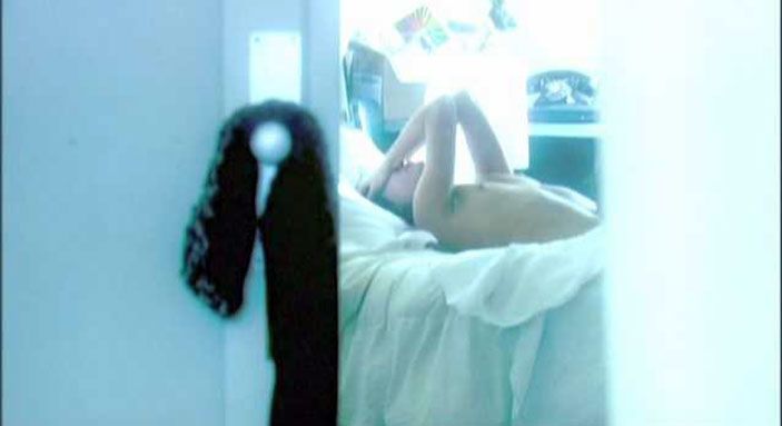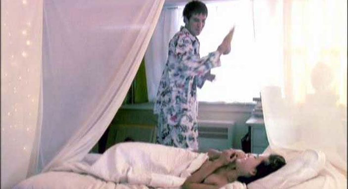 The next scene from the same movie is here! As she smiles, Carly Pope lays topless on a bed on her back with her arms over her breasts and then waves her arm at a man and gives us a view of her right breast and her left nipple peeking out.