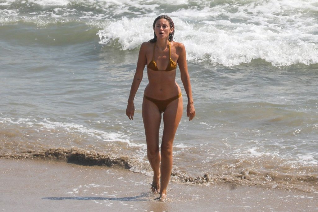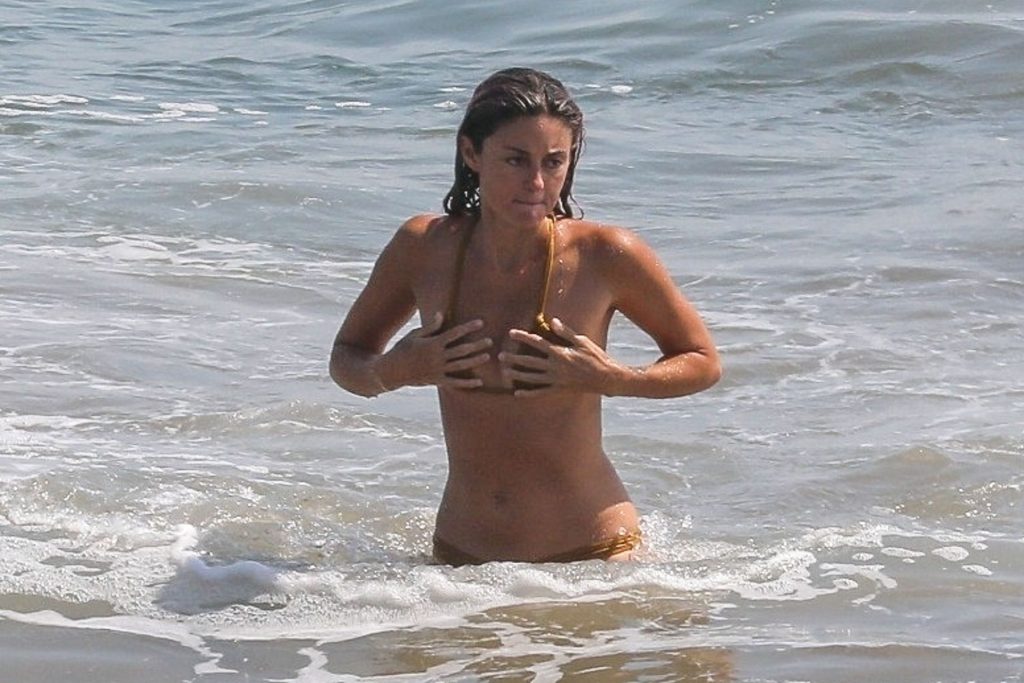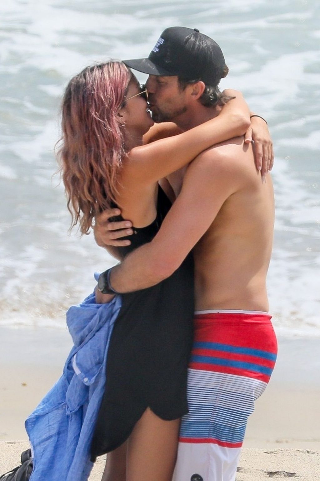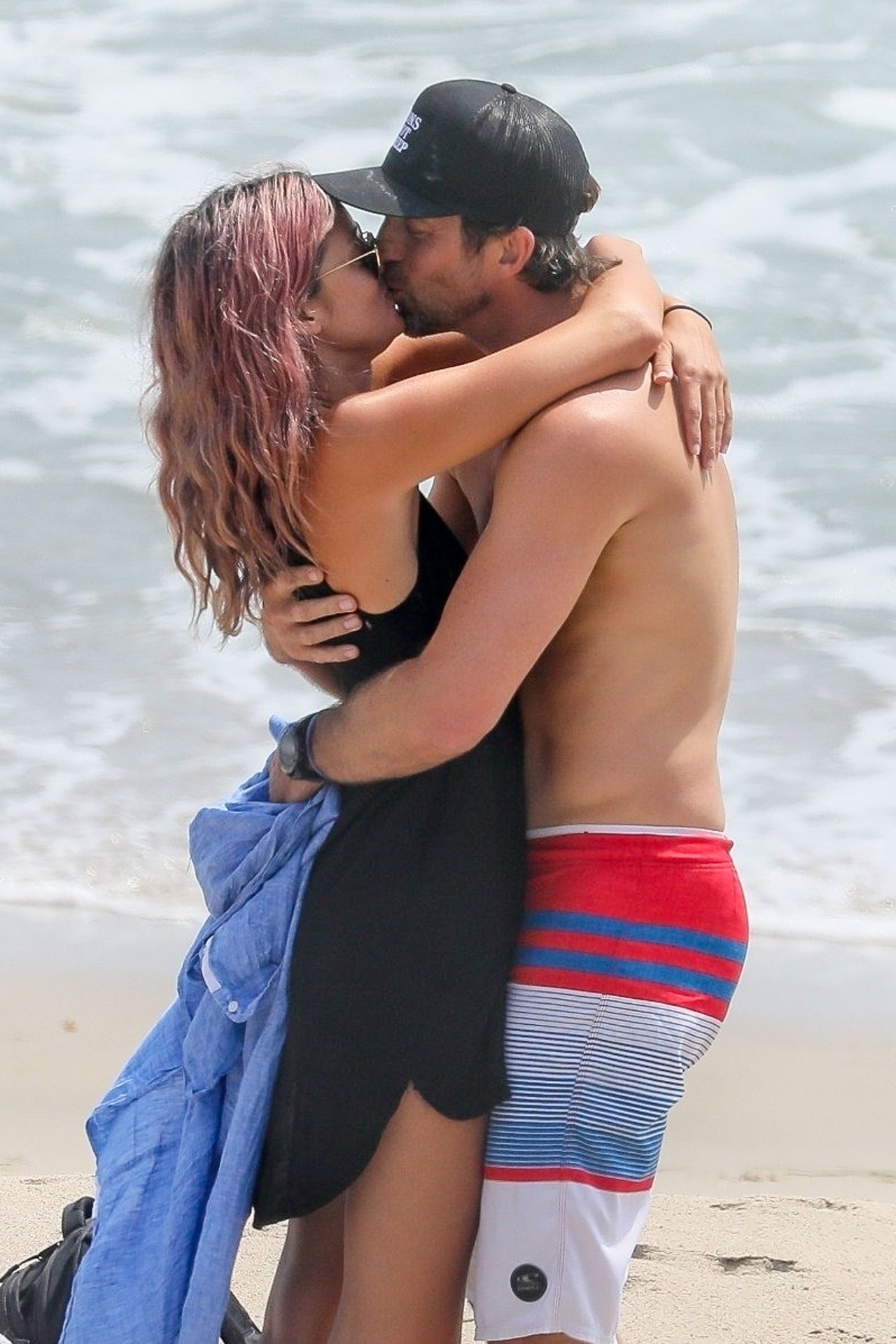 L’entrepreneuse américaine, actrice, mannequin et DJ Caroline D’Amore et son mari Bobby Alt partagent un peu de tendresse devant notre caméra tout en profitant d’une journée à la plage à Malibu cet après-midi (août 2020).