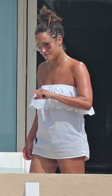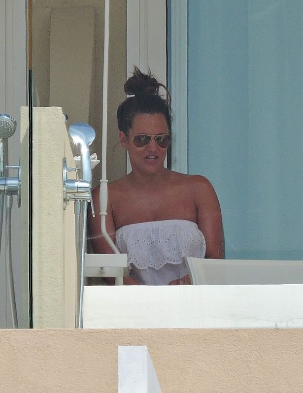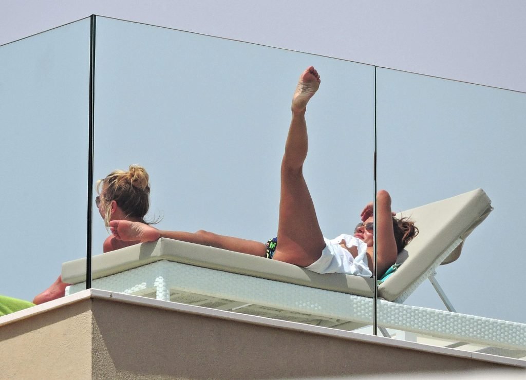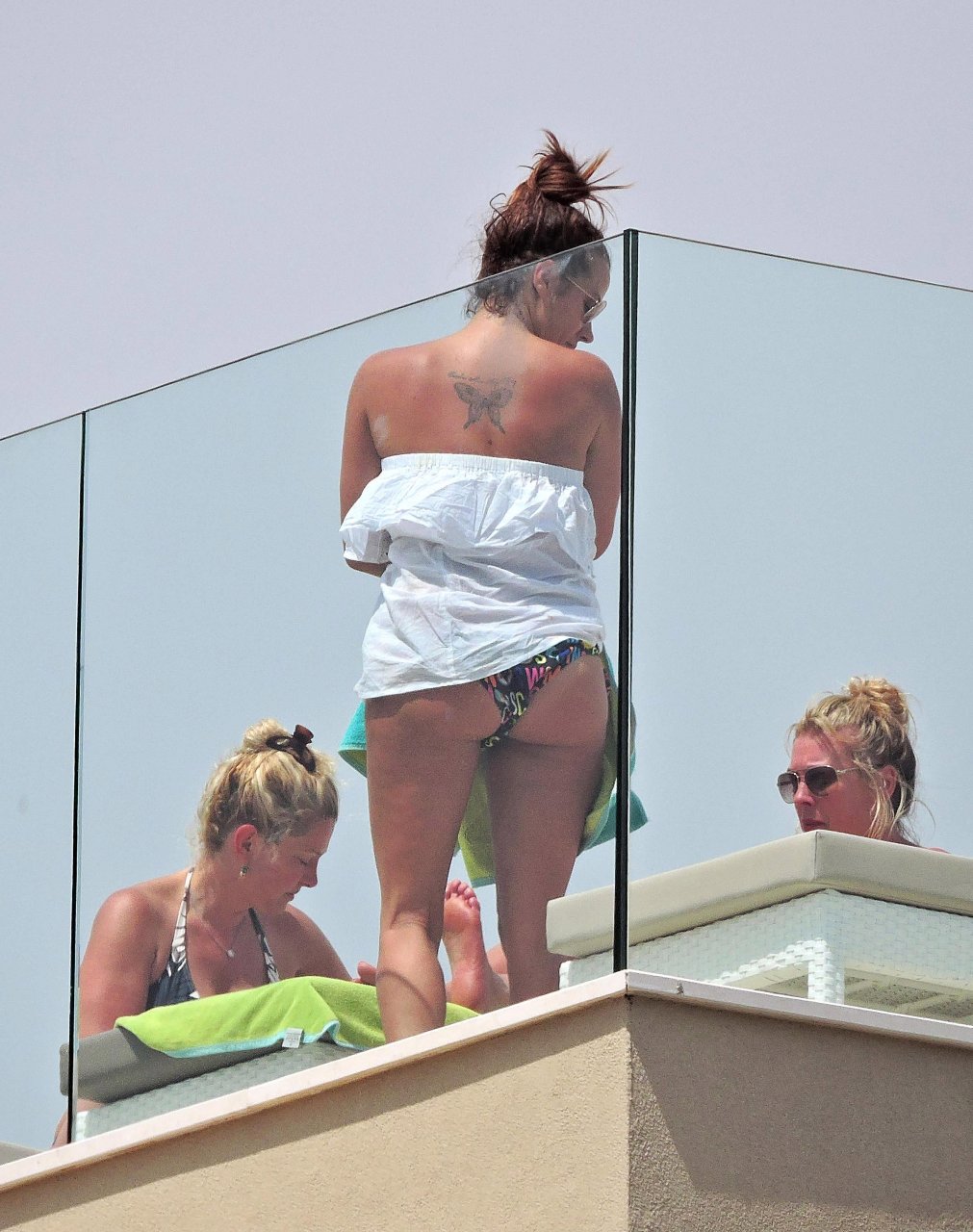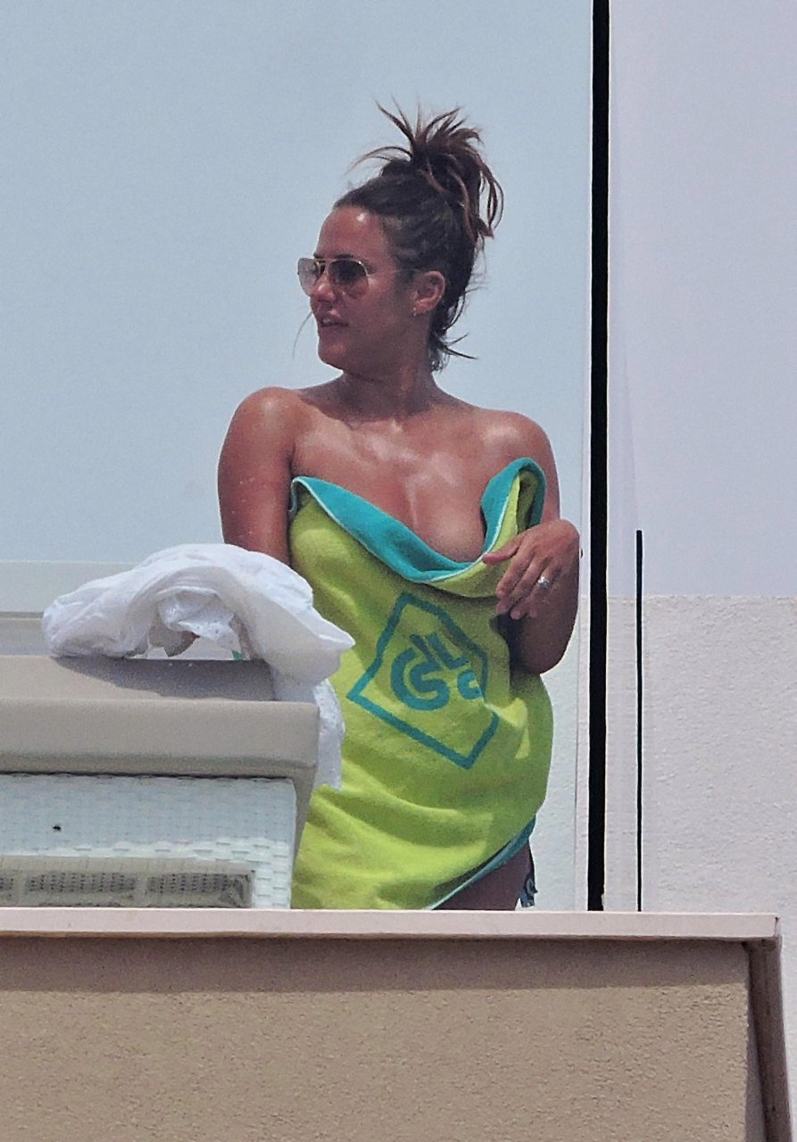 Caroline Flack est vue sur le balcon de son hôtel à Majorque, 08/06/2017. Caroline Flack est une présentatrice anglaise de télévision et de radio, mannequin. Âge : 37 ans.
