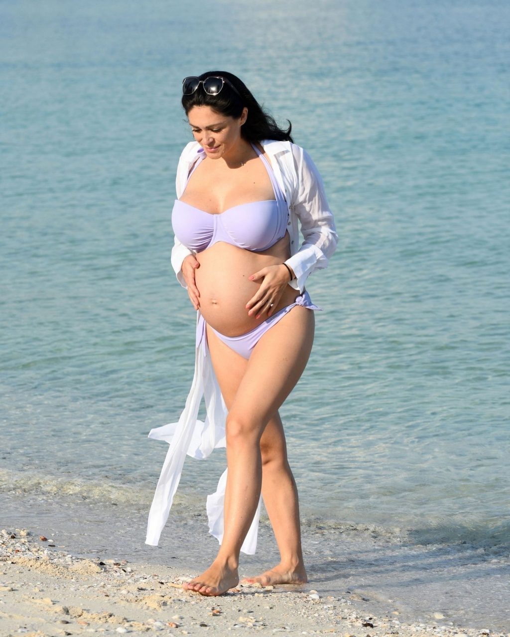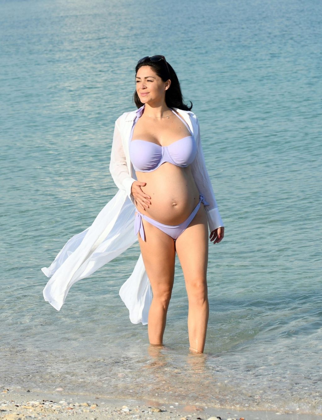 La star de la télé-réalité Casey Batchelor est vue lors d’une séance photo pour son application de yoga à Dubaï, le 11/04/2019. La star de Celebrity Big Brother, qui est enceinte de près de 7 mois de son deuxième enfant, montre son ventre de grossesse grandissant dans un bikini violet et un caftan blanc.