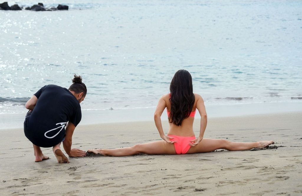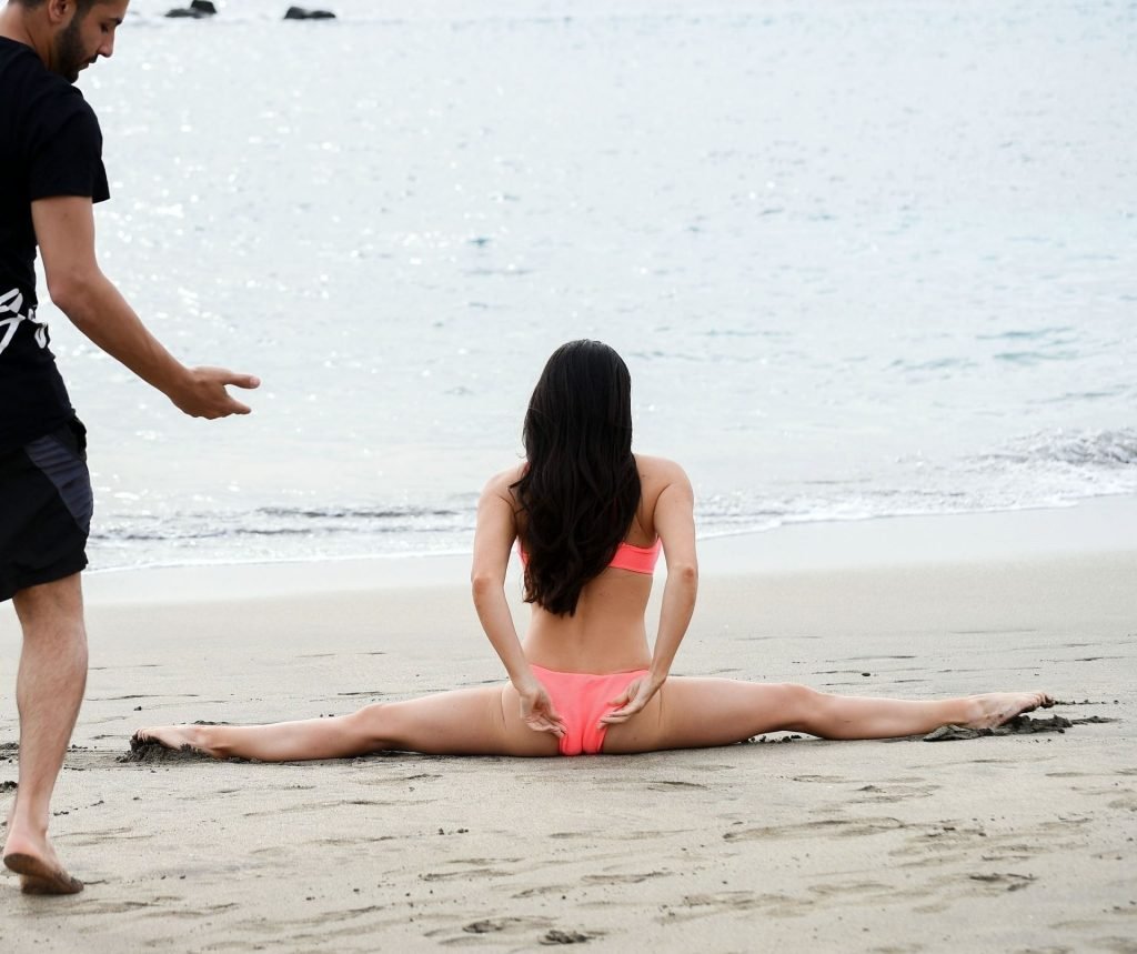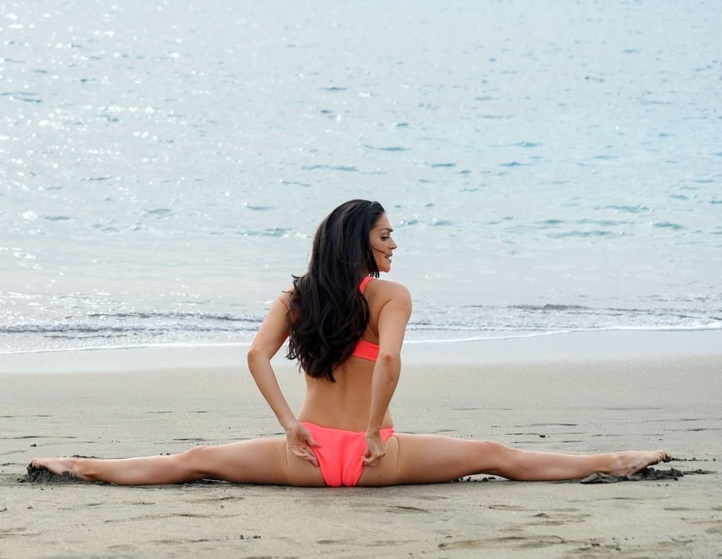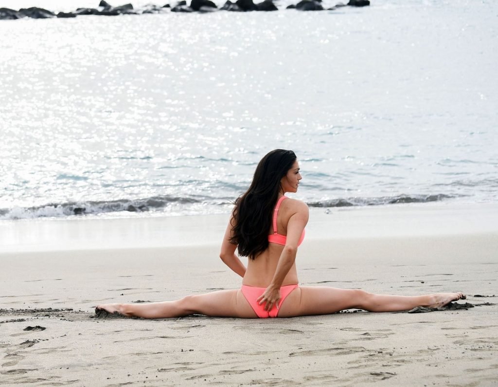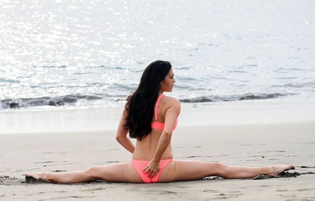 La star de la télé-réalité montre sa perte de poids incroyable de 4 stones dans un bikini orange. Casey, qui est professeur de yoga qualifiée, montre sa flexibilité en faisant le grand écart sur la plage.