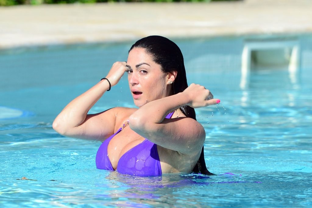 Casey Batchelor porte un bikini violet dans la piscine en République dominicaine, 30/03/2017. Casey Batchelor est un mannequin, actrice (Bonded by Blood 2 – 2017). Âge – 32 ans (née le 2 octobre 1984).