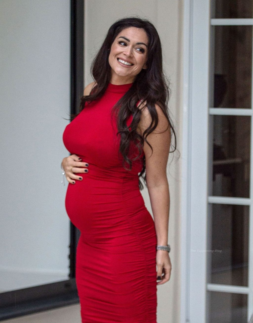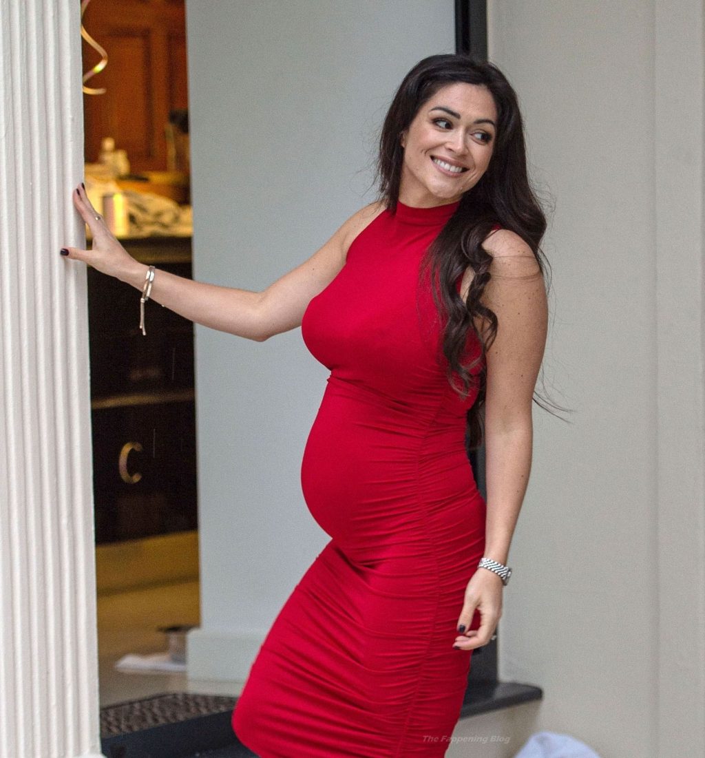 Casey Batchelor est vue lors d’une séance photo à Londres, le 16/02/2021. La star de la télé-réalité montre son ventre de grossesse dans une robe rouge frappante alors qu’elle se fait une retouche de maquillage.