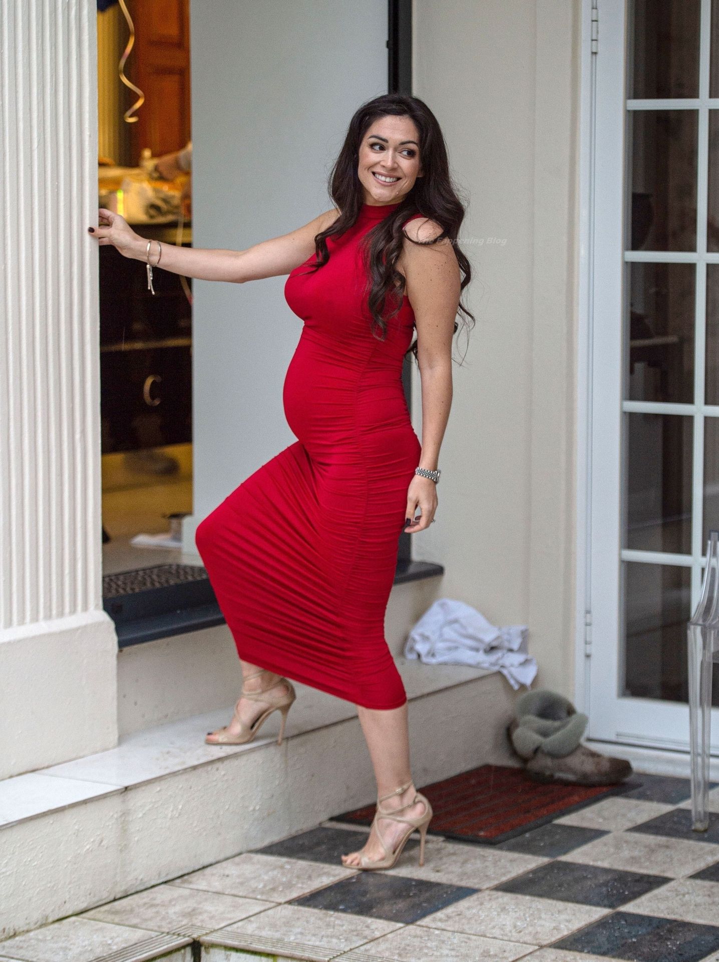 Casey Batchelor est vue lors d’une séance photo à Londres, le 16/02/2021. La star de la télé-réalité montre son ventre de grossesse dans une robe rouge frappante alors qu’elle se fait une retouche de maquillage.