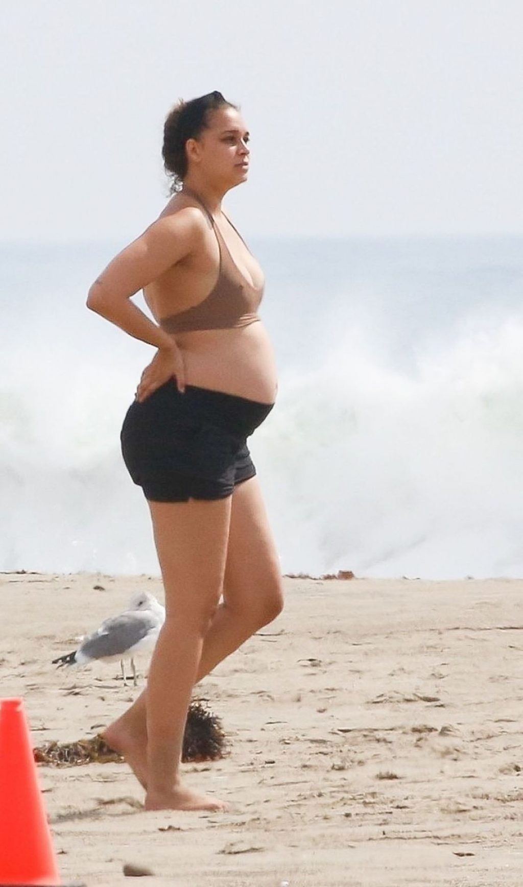 April Love Geary enceinte montre son ventre de grossesse grandissant lors d’une journée à la plage avec son mari Robin Thicke à Malibu, 10/05/2020.