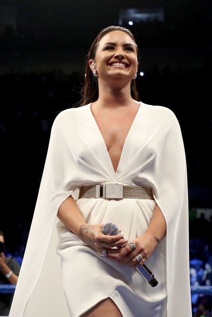 Demi Lovato chante l’hymne national lors du combat Mayweather / McGregor à la T-Mobile Arena de Las Vegas, le 26/08/2017.