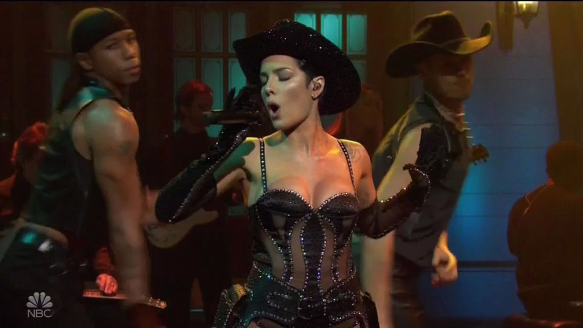 Halsey a fait son retour triomphal à SNL avec deux performances captivantes de nouveaux singles tirés de son album récemment sorti, Manic. La chanteuse de 25 ans est d’abord montée sur scène pour interpréter la chanson You Should Be Sad. Habillée d’un body noir orné de strass avec des bas résille et des gants, Halsey, qui a ouvert la performance en chevauchant un taureau mécanique avec un chapeau de cowboy couvert de strass et des bottes de cowboy assorties, a chauffé sa première prestation de la soirée avec une interprétation sexy de la chanson.