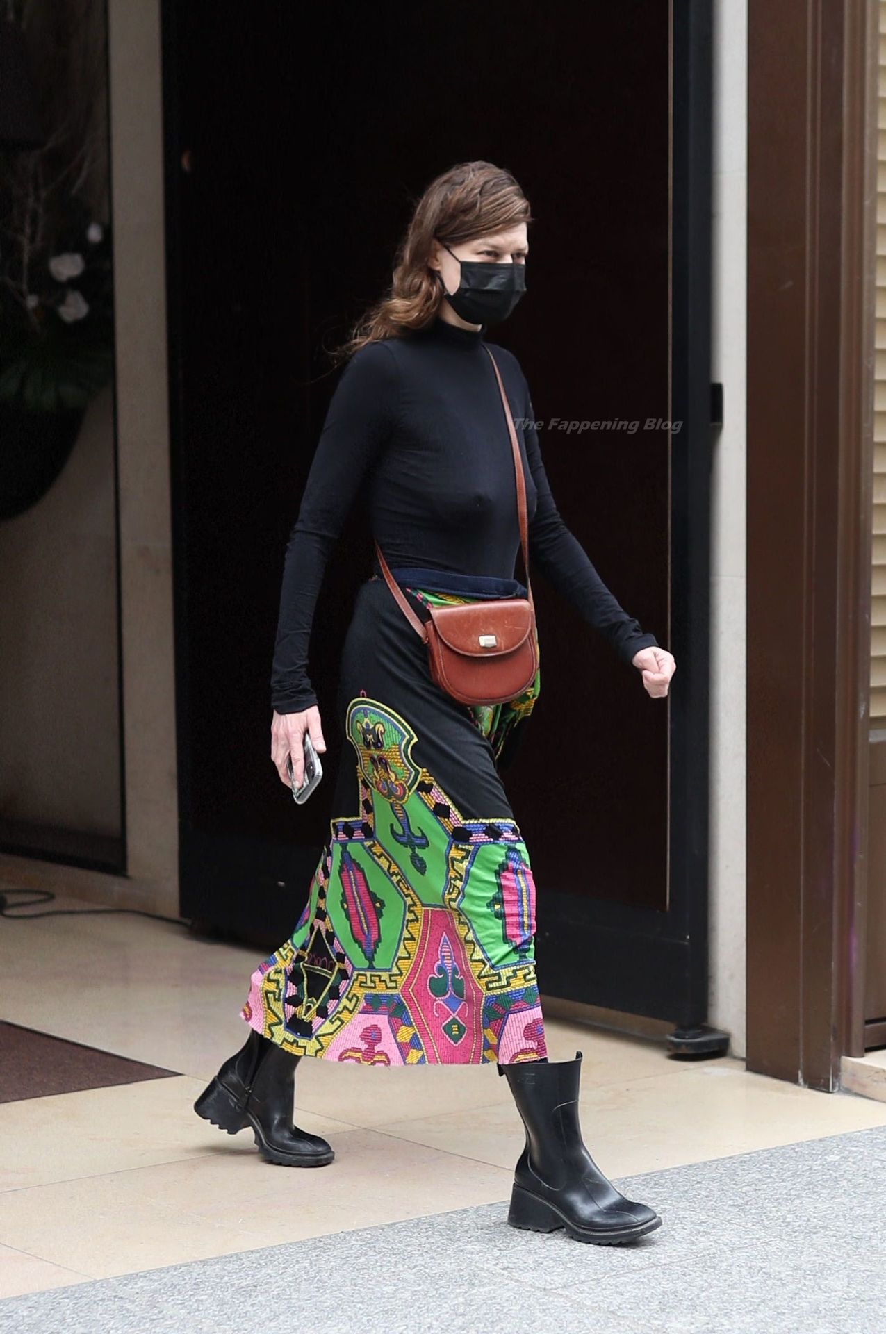 L’actrice américaine Milla Jovovich affiche du style en quittant l’hôtel Mandarin. Elle portait son masque facial et une jupe multicolore ainsi que des bottes noires pendant la semaine de la mode à Paris, le 03/05/2021.