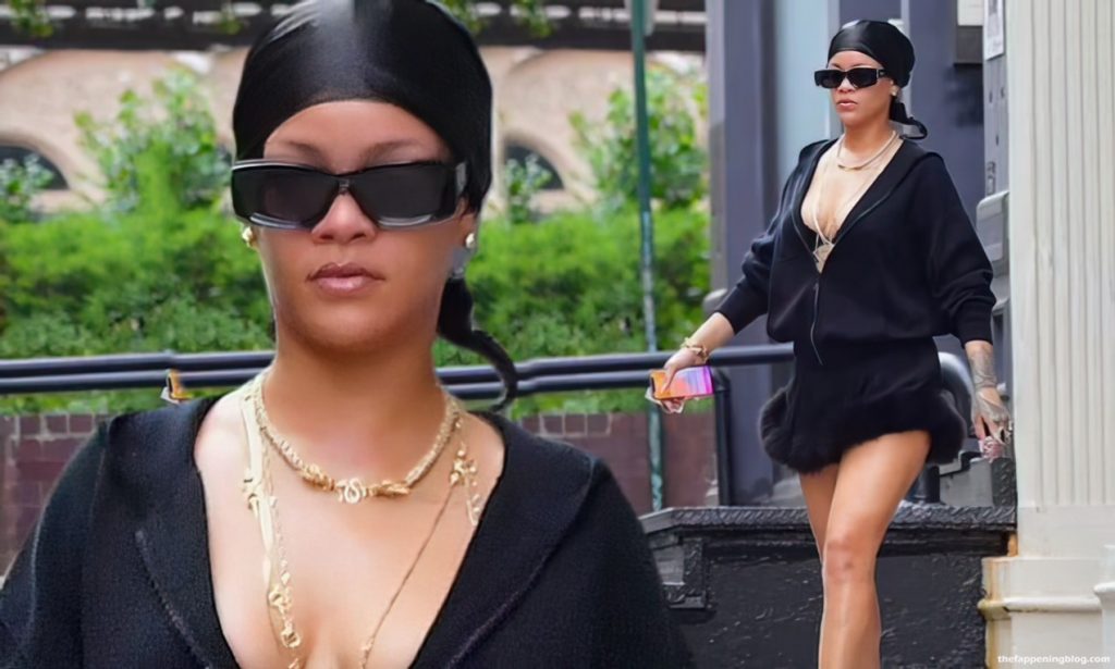 La star du Fappening, magnat de la mode et chanteuse Rihanna sort pour une séance de shopping à NYC et la star éblouit dans une mini robe noire bordée de fourrure qu’elle associe à des talons noirs séduisants et un sweat à capuche, 10/02/2021.