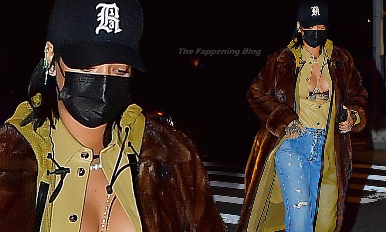 La star barbadienne du Fappening a attiré les regards en exhibant ses longues jambes dans une mini-jupe courte avec un haut révélateur et un long trench-coat noir.