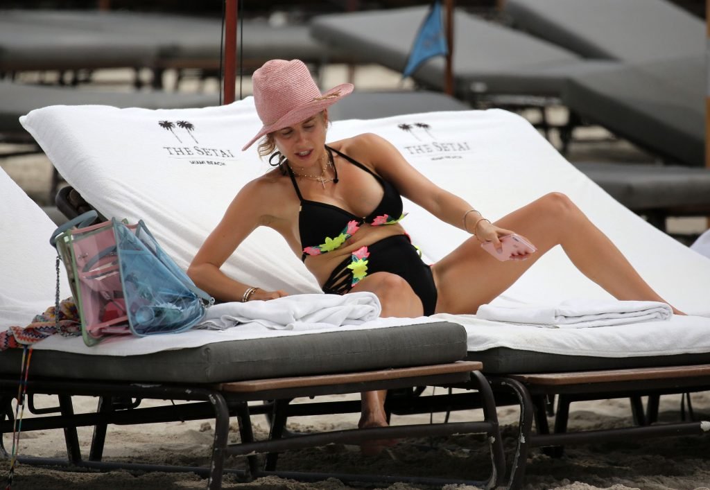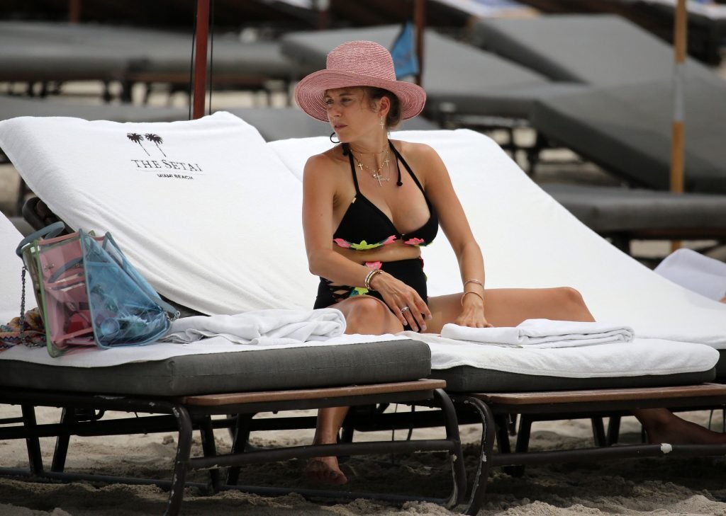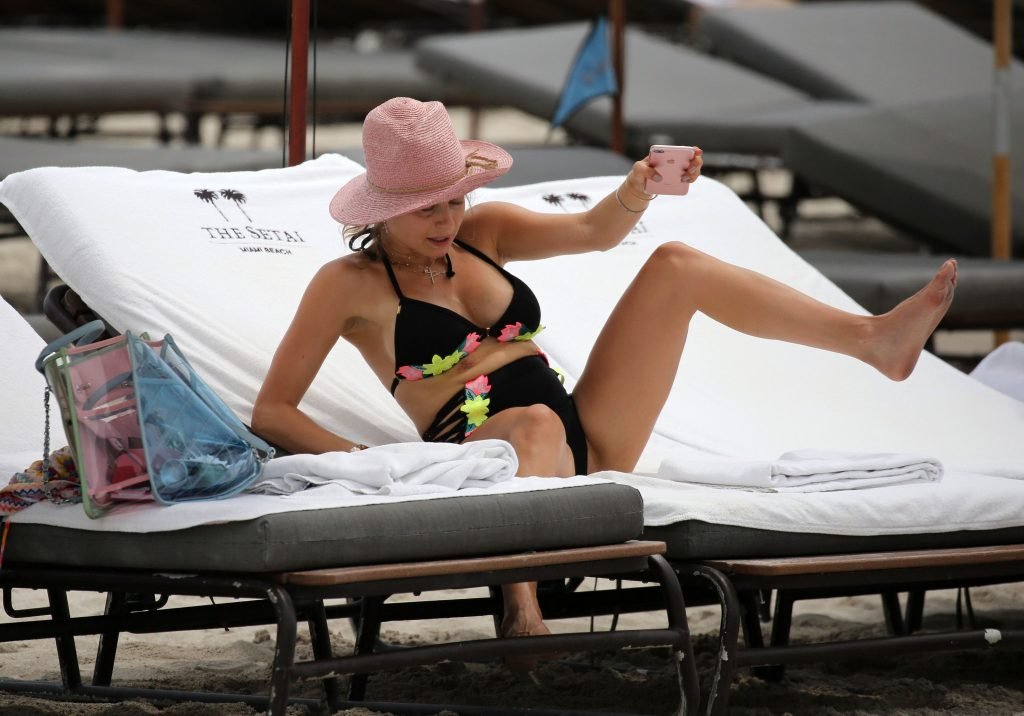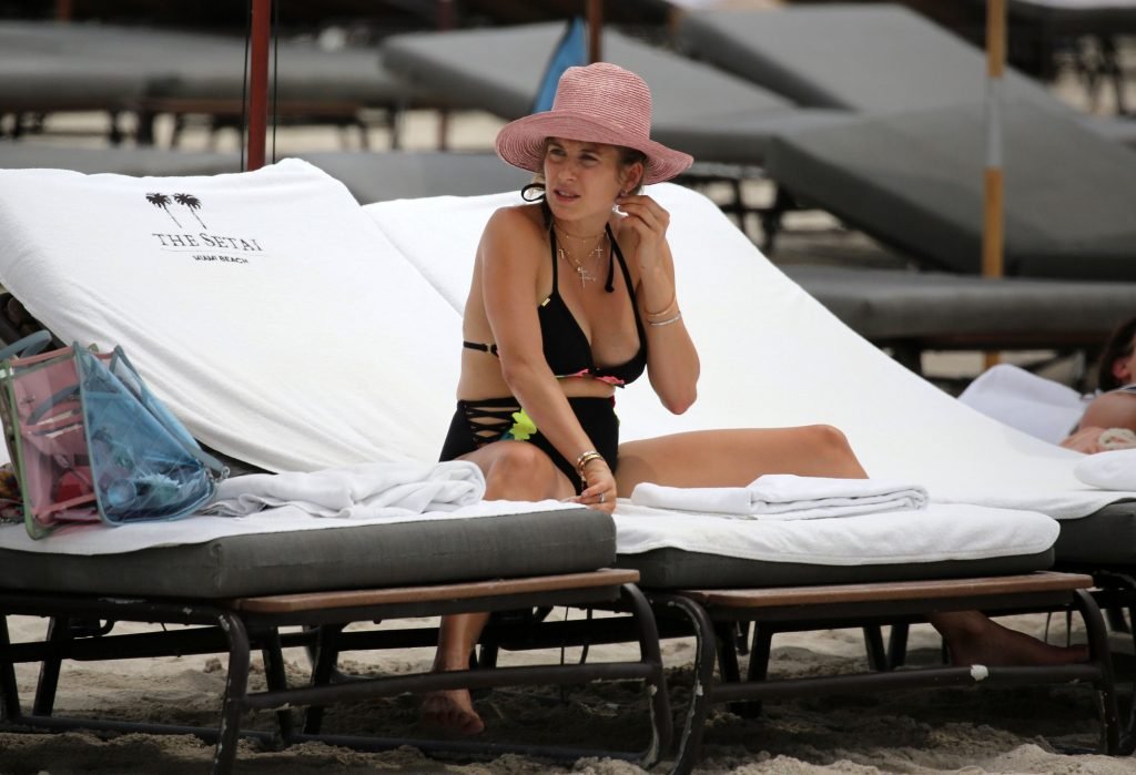 Cathy Fisher-Hummels montre son corps flasque dans un bikini noir sur la plage de Miami, 27/04/2018. Cathy Hummels est une animatrice de télévision et l’épouse du footballeur Mats Hummels, originaire de Dachau, Allemagne. Âge – 30.