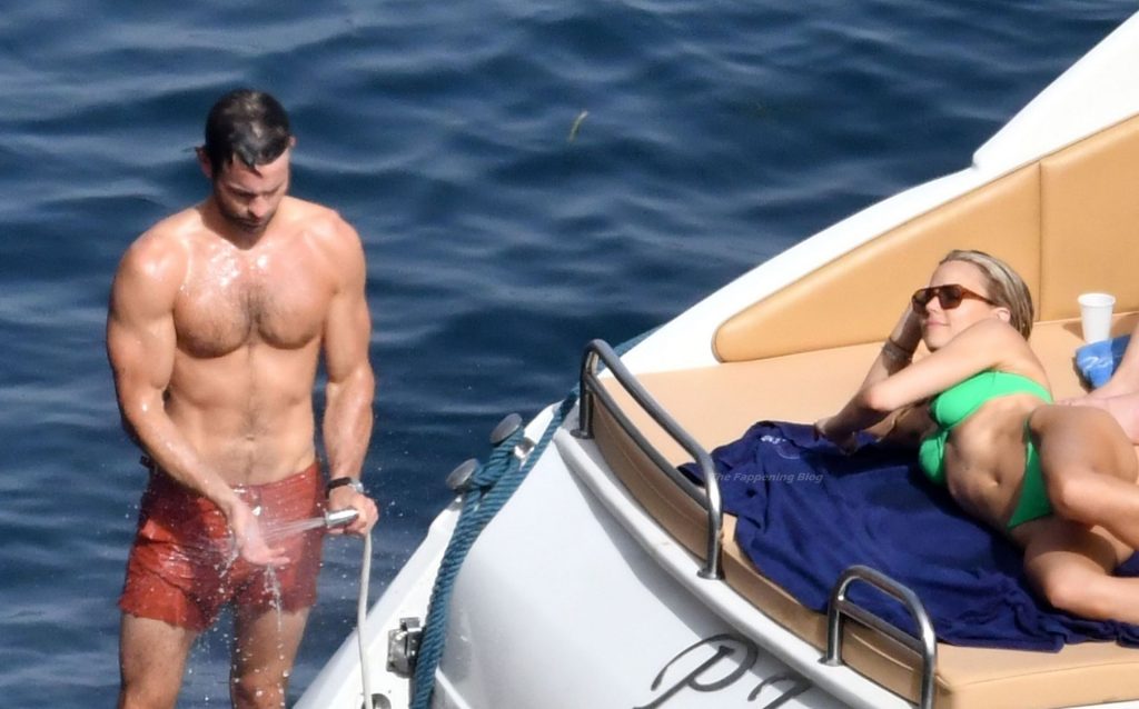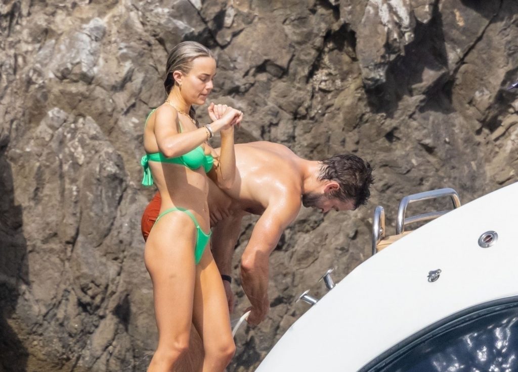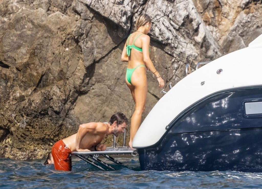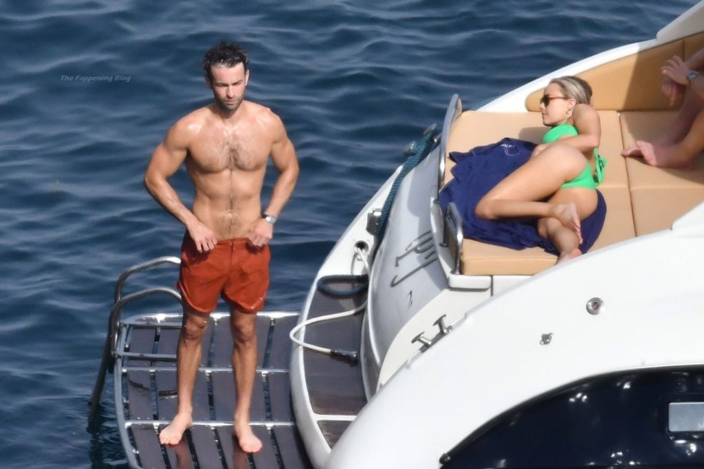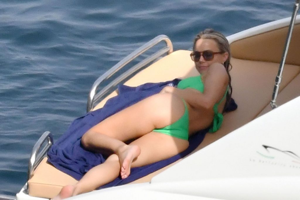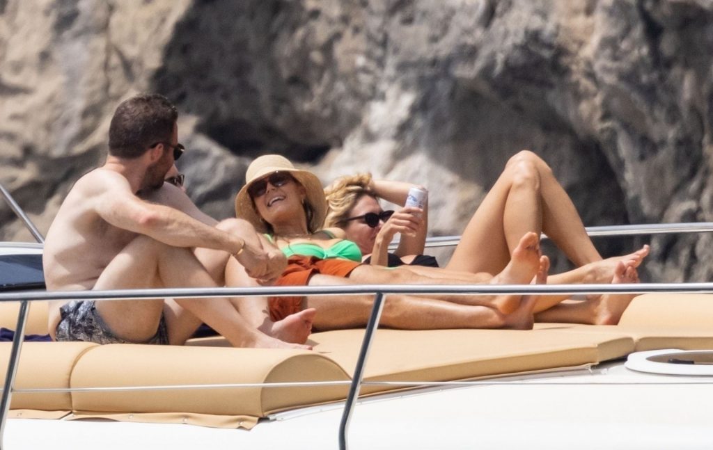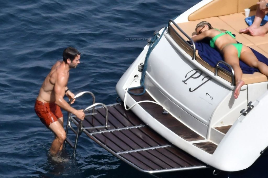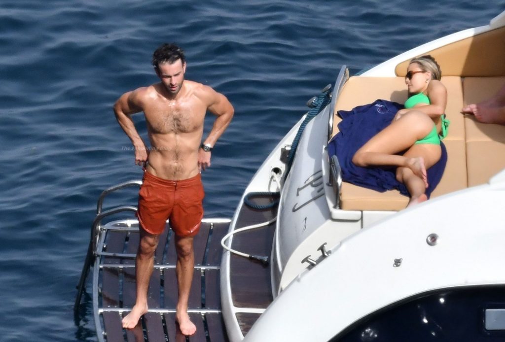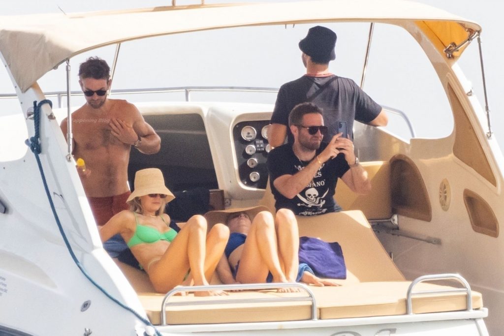 Avec quelques amis, le couple se détendait sur leur bateau et a fait un plongeon dans la mer italienne chaude, profitant du soleil brûlant tout en s’appliquant de la crème solaire pendant leurs vacances.