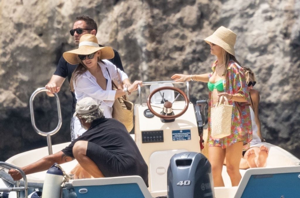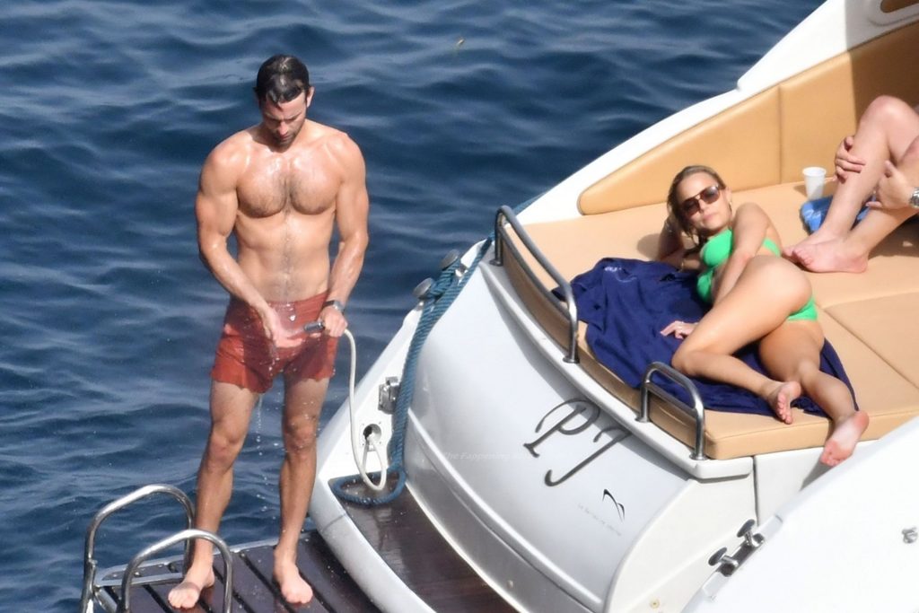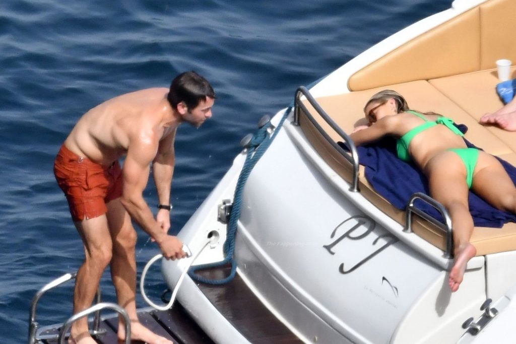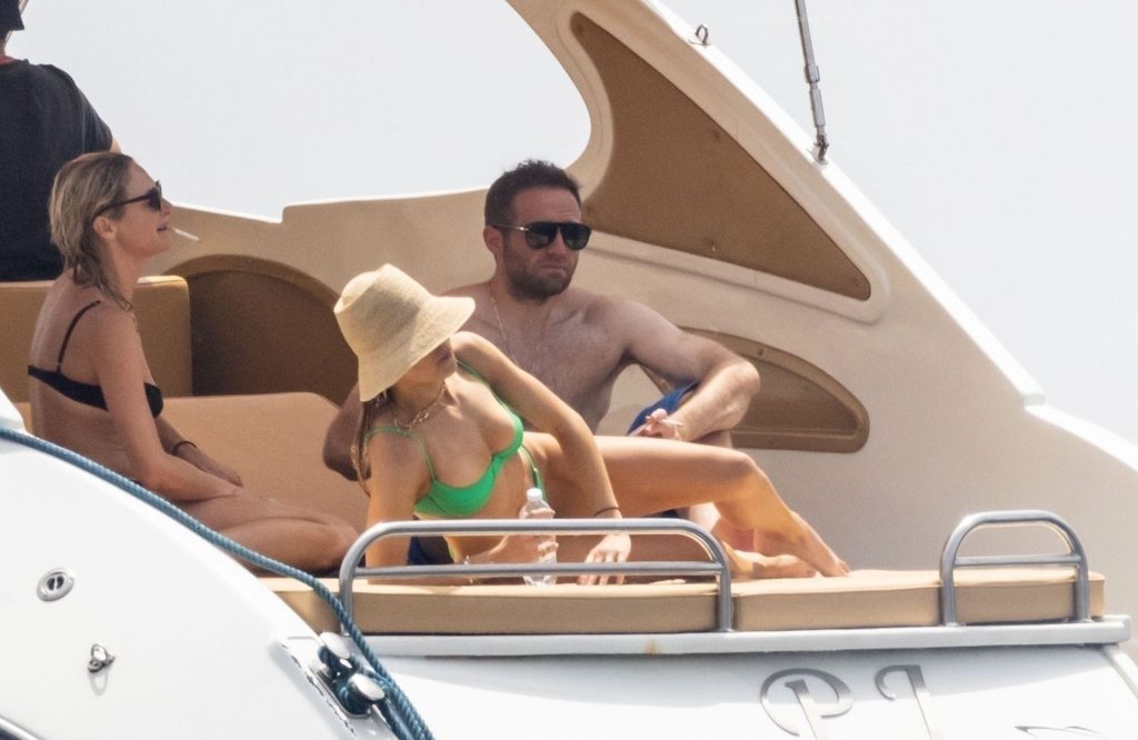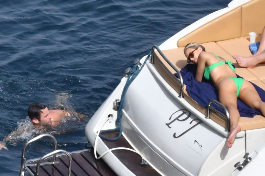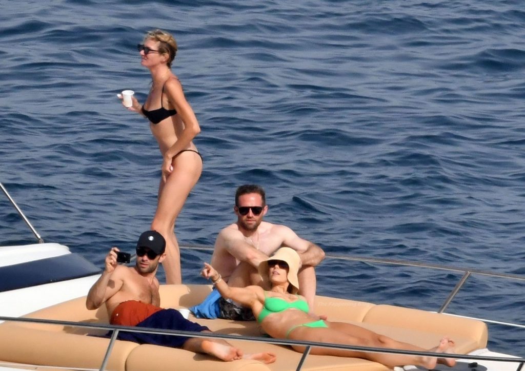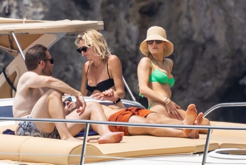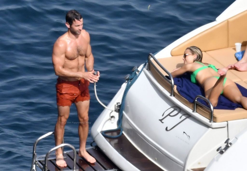 Avec quelques amis, le couple se détendait sur leur bateau et a fait un plongeon dans la mer italienne chaude, profitant du soleil brûlant tout en s’appliquant de la crème solaire pendant leurs vacances.