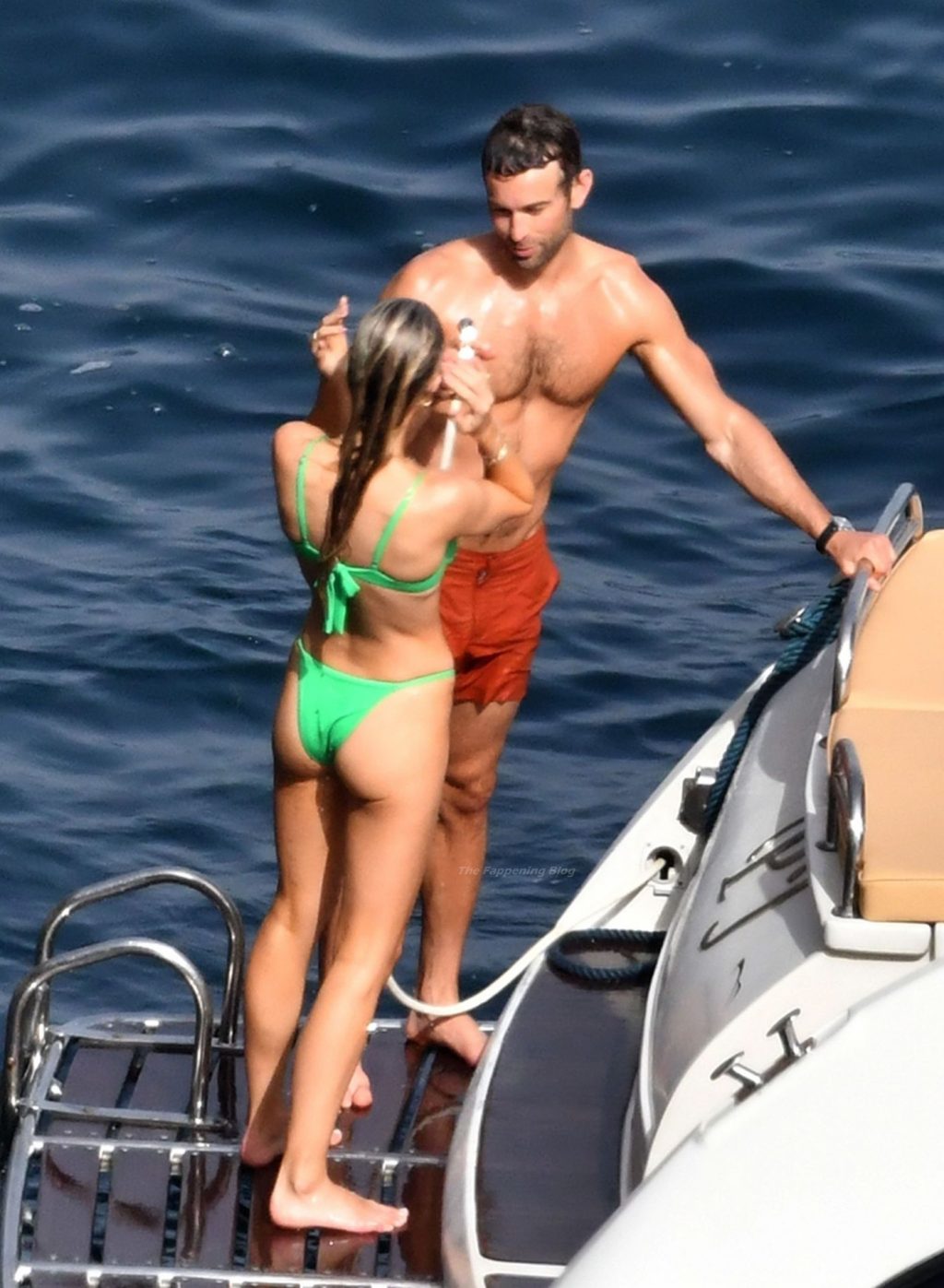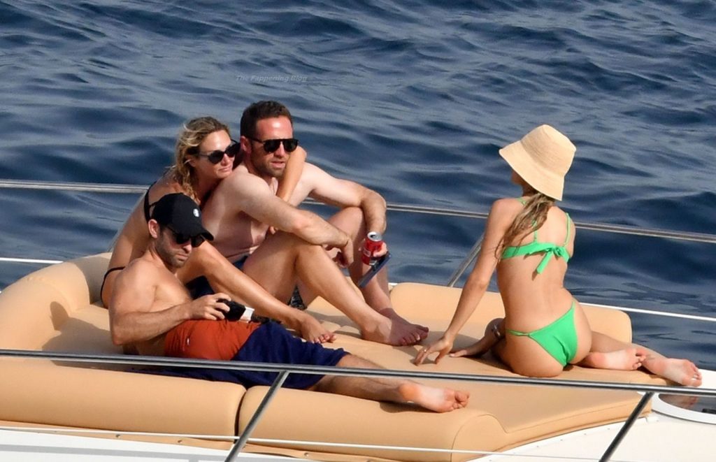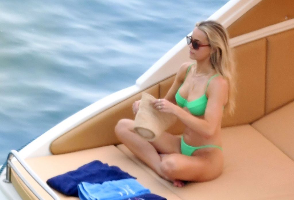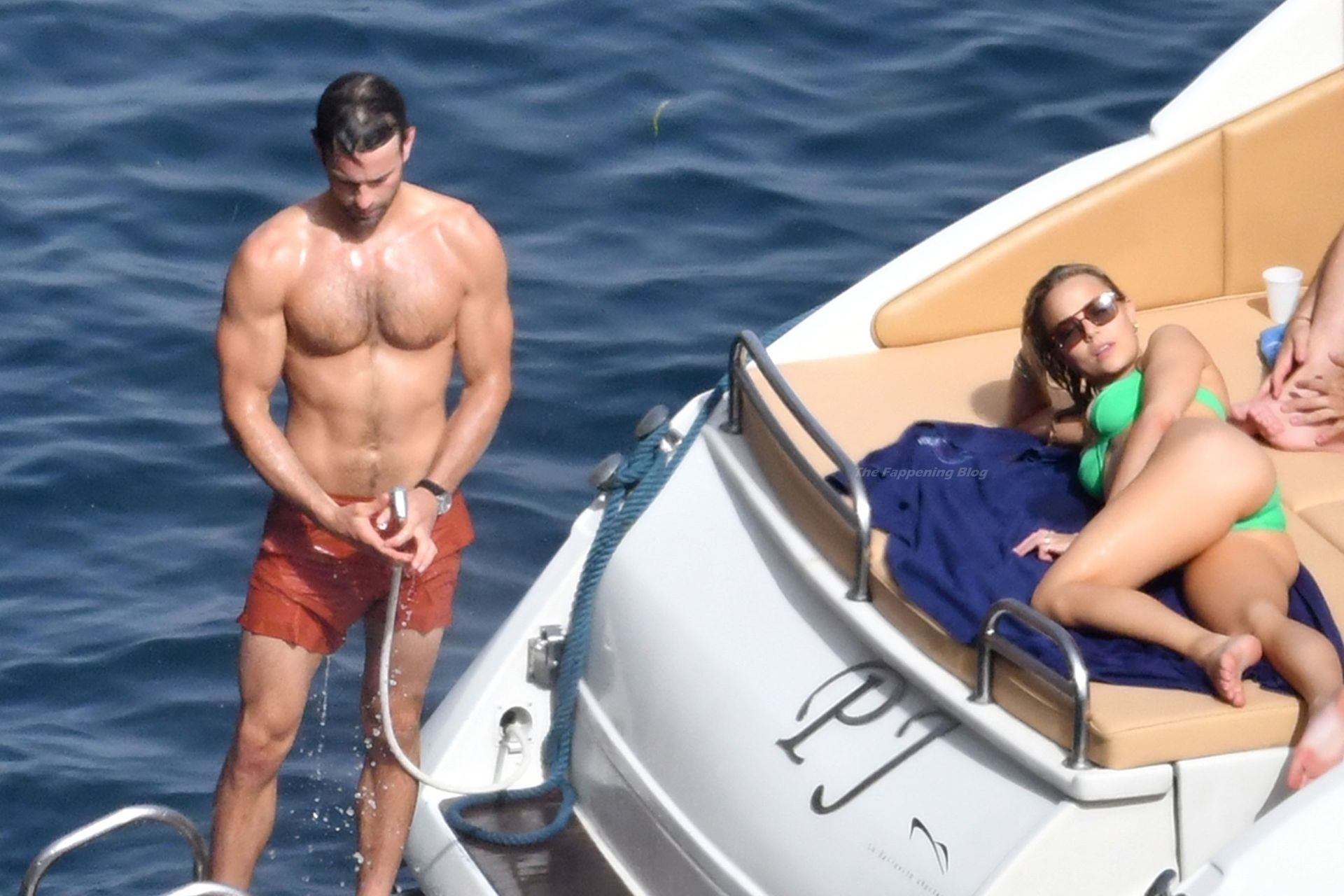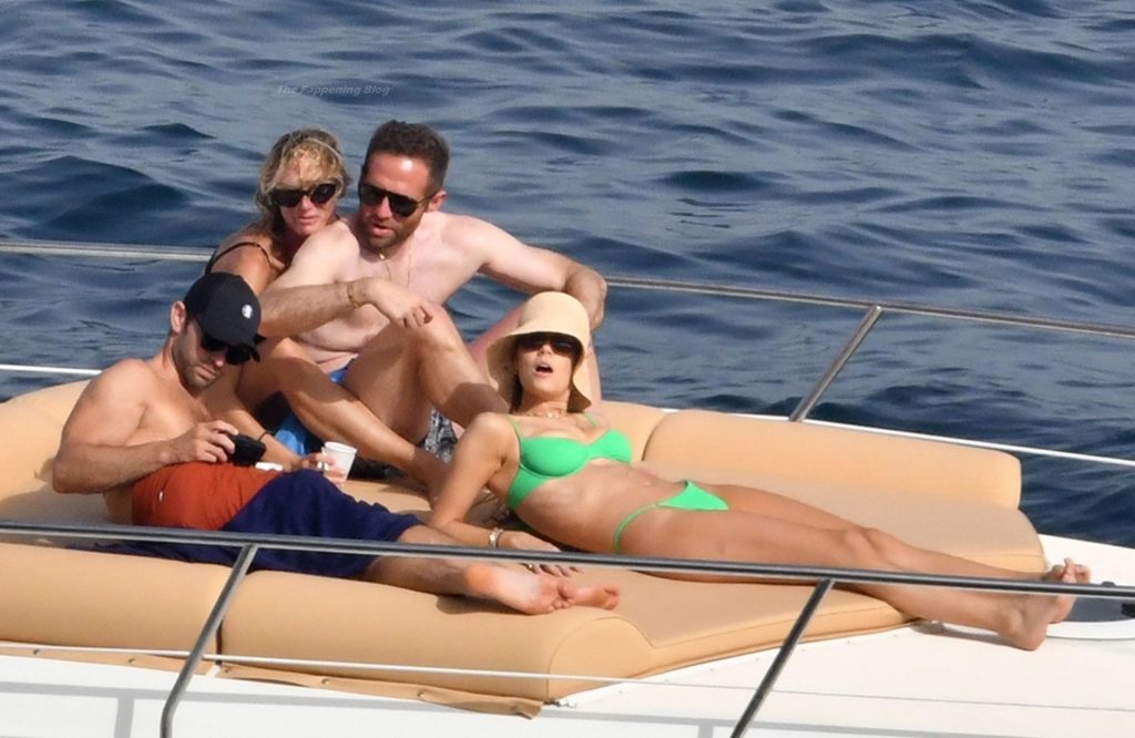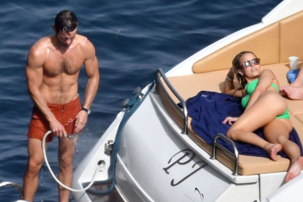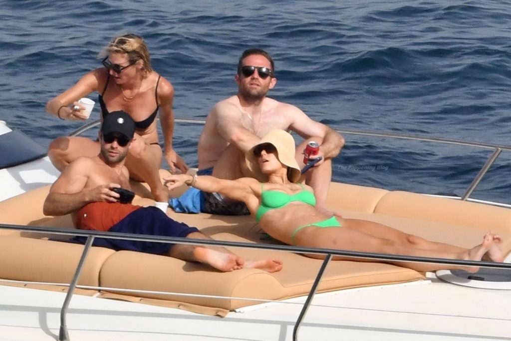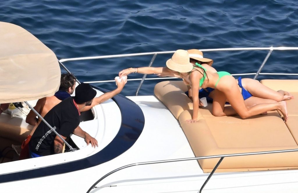 Avec quelques amis, le couple se détendait sur leur bateau et a fait un plongeon dans la mer italienne chaude, profitant du soleil brûlant tout en s’appliquant de la crème solaire pendant leurs vacances.