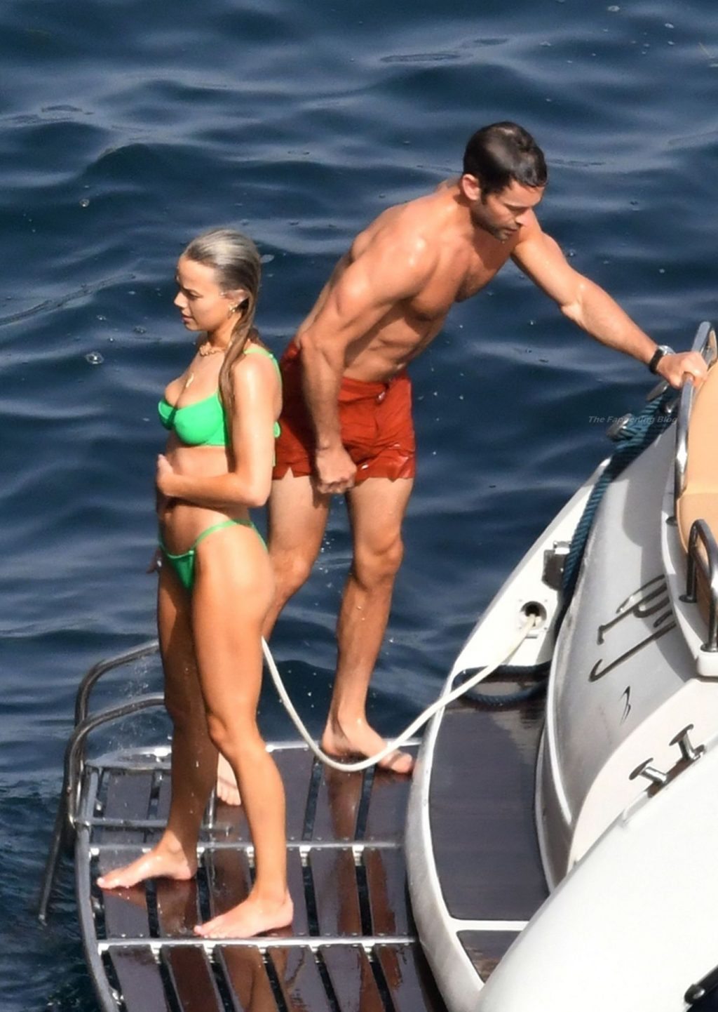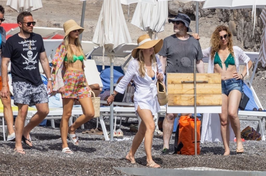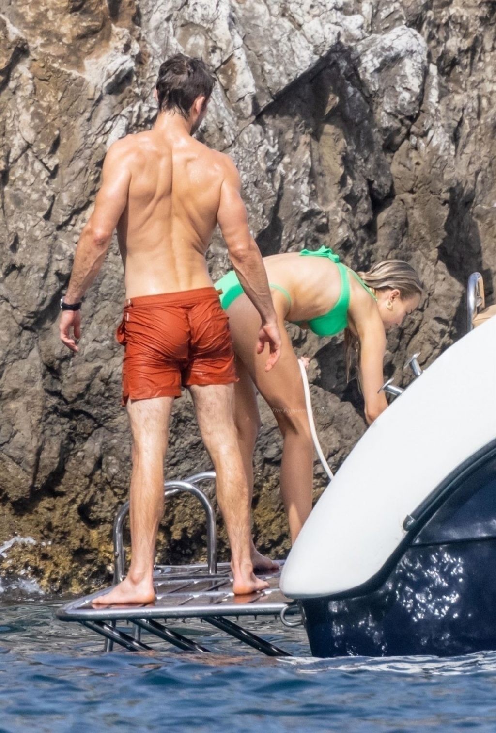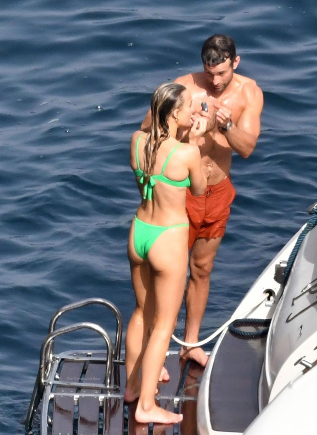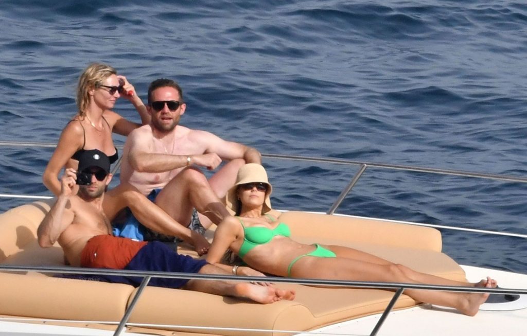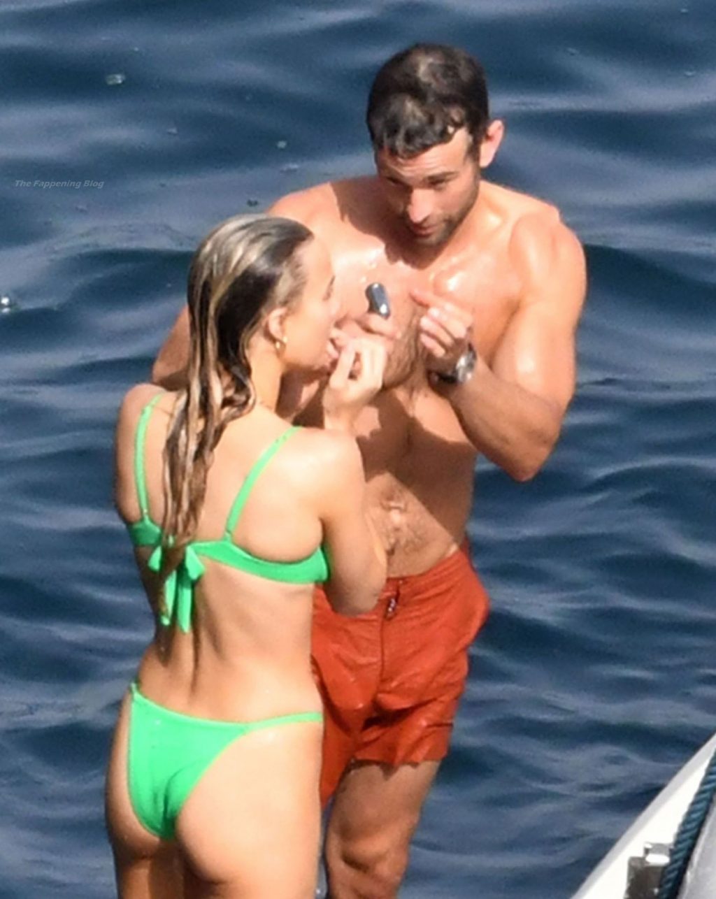 Avec quelques amis, le couple se détendait sur leur bateau et a fait un plongeon dans la mer italienne chaude, profitant du soleil brûlant tout en s’appliquant de la crème solaire pendant leurs vacances.
