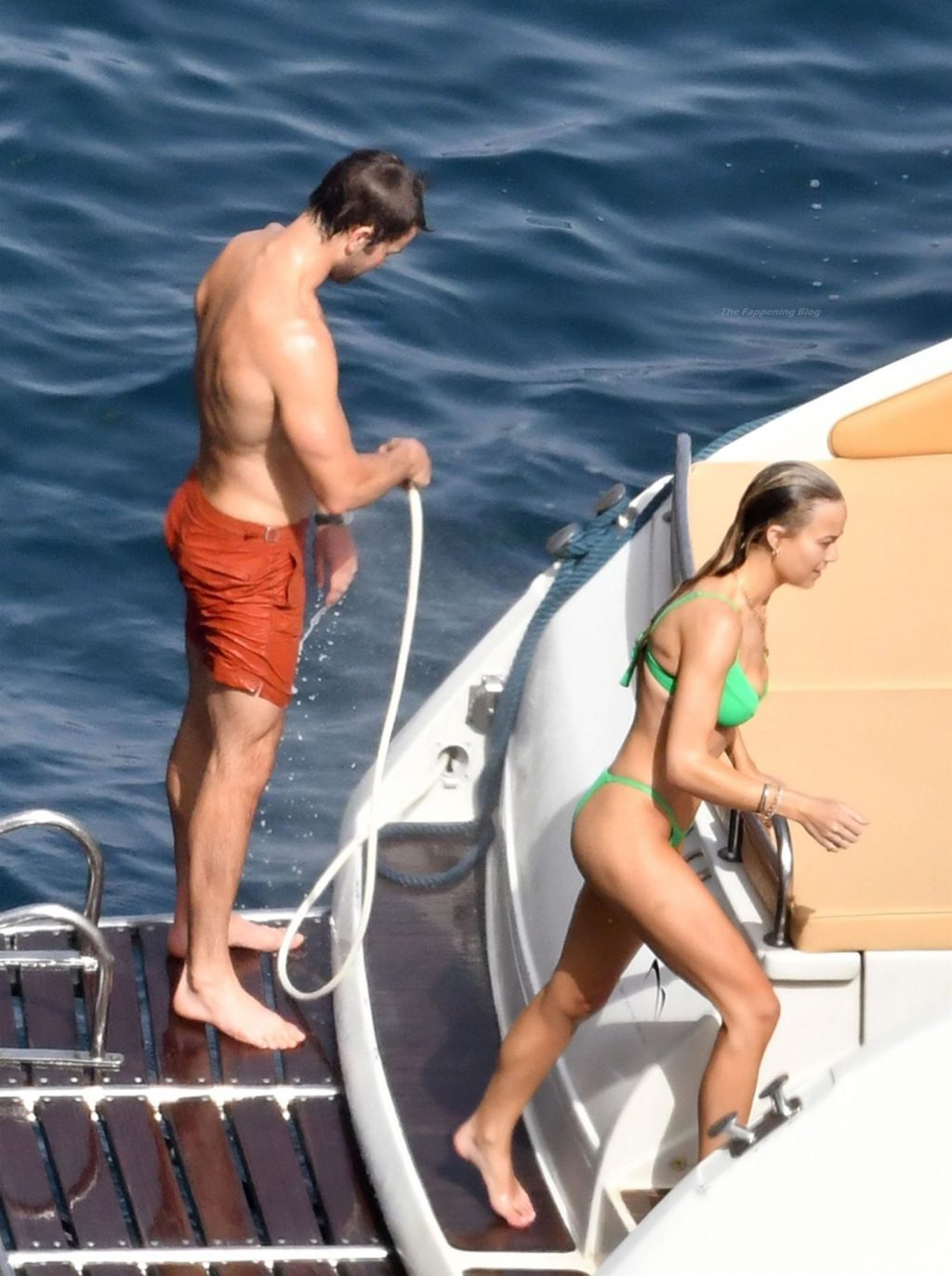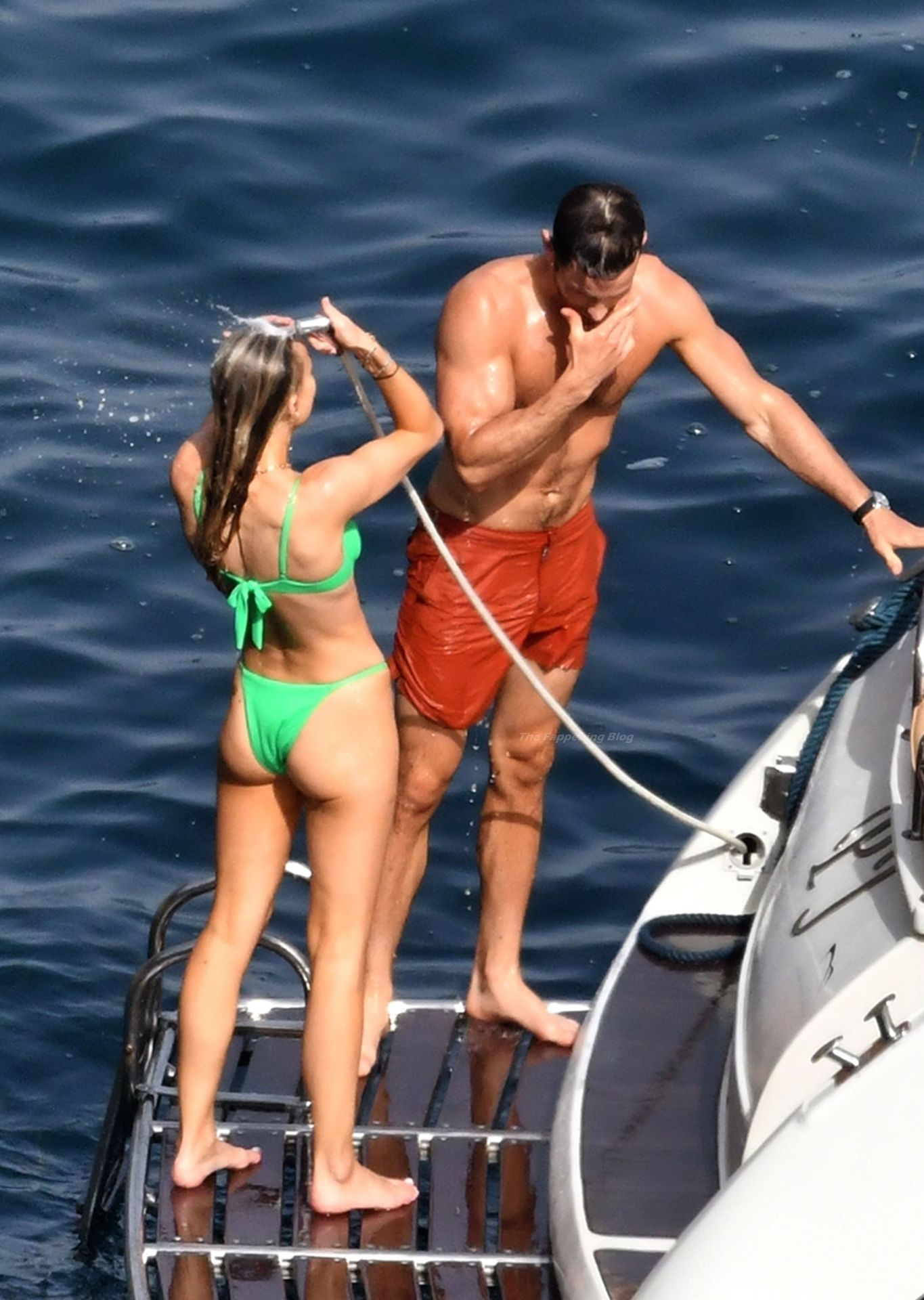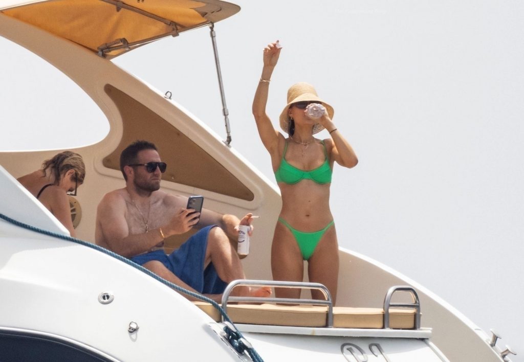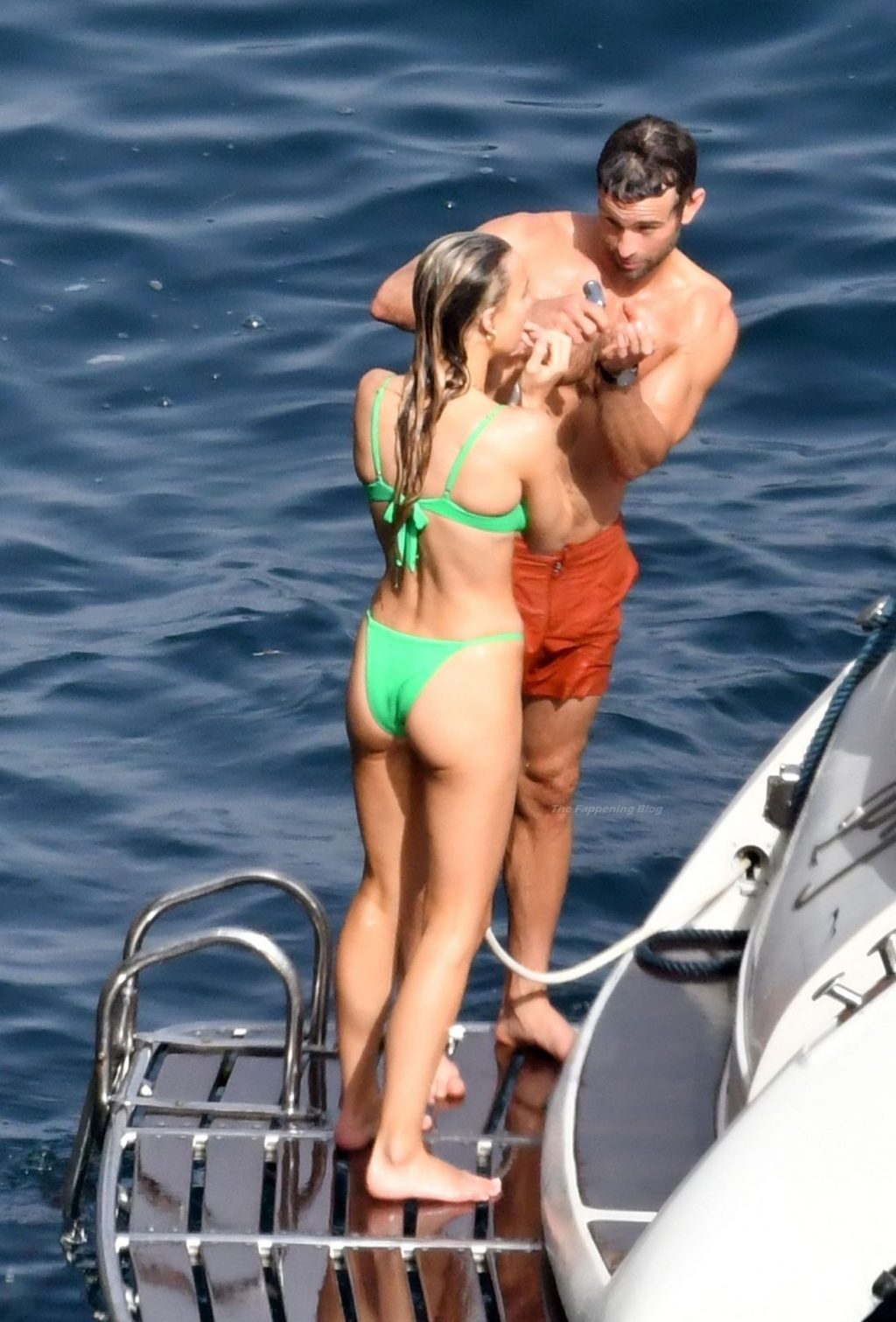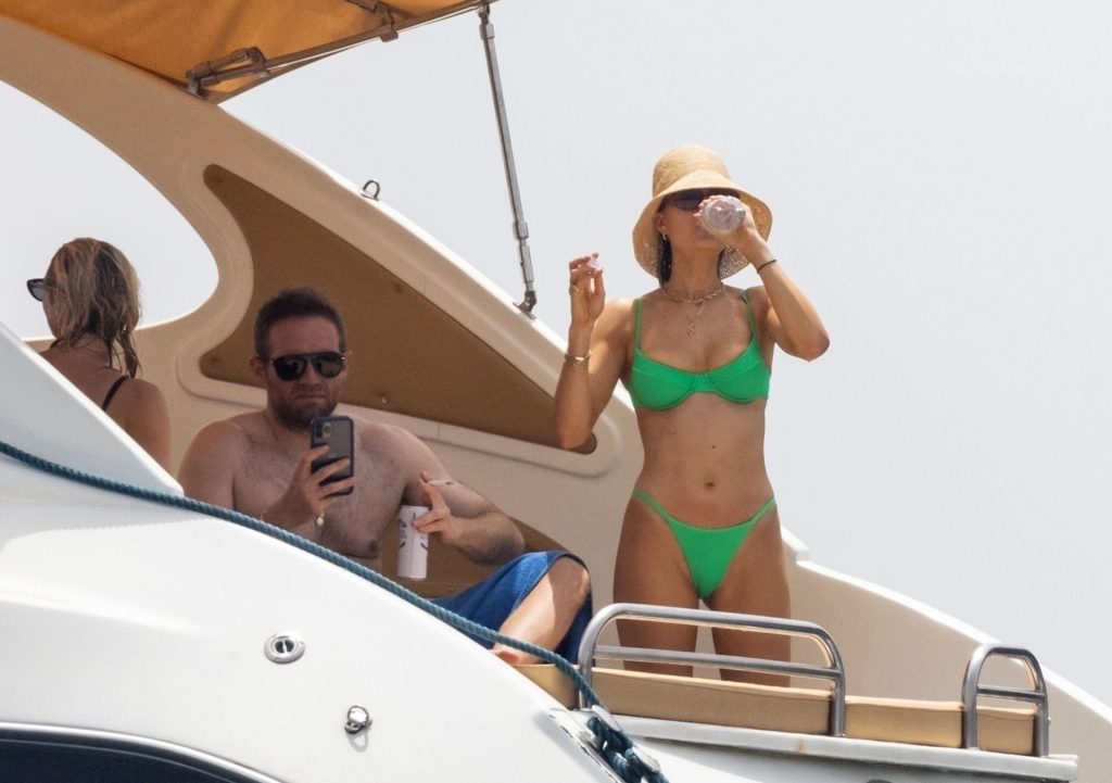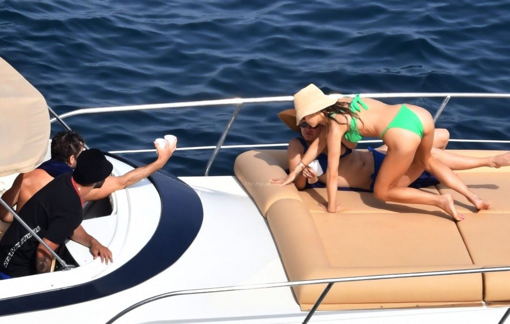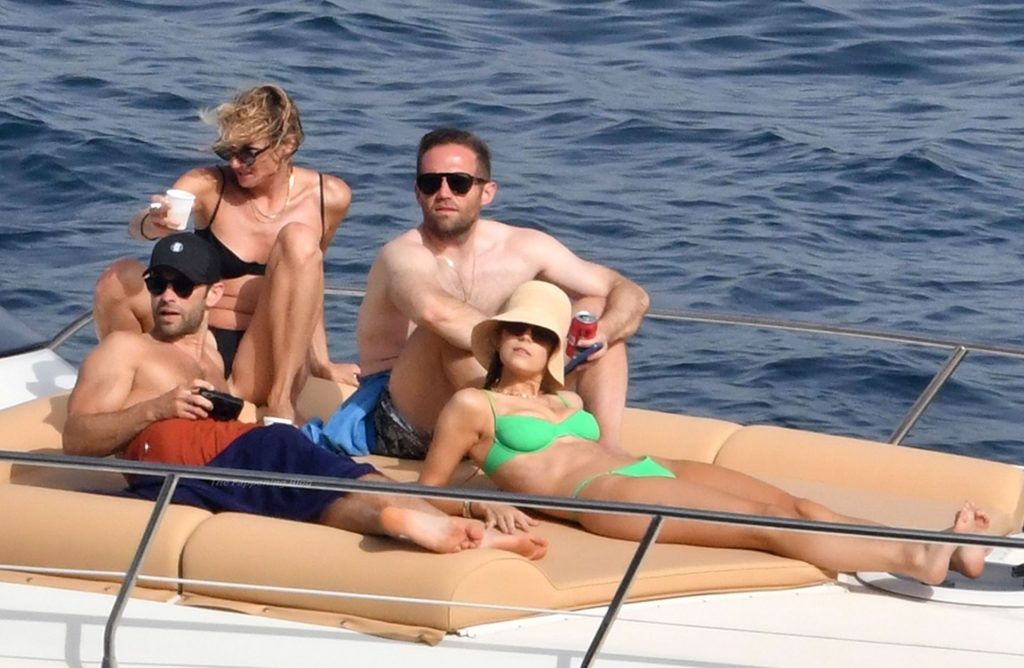 Avec quelques amis, le couple se détendait sur leur bateau et a fait un plongeon dans la mer italienne chaude, profitant du soleil brûlant tout en s’appliquant de la crème solaire pendant leurs vacances.