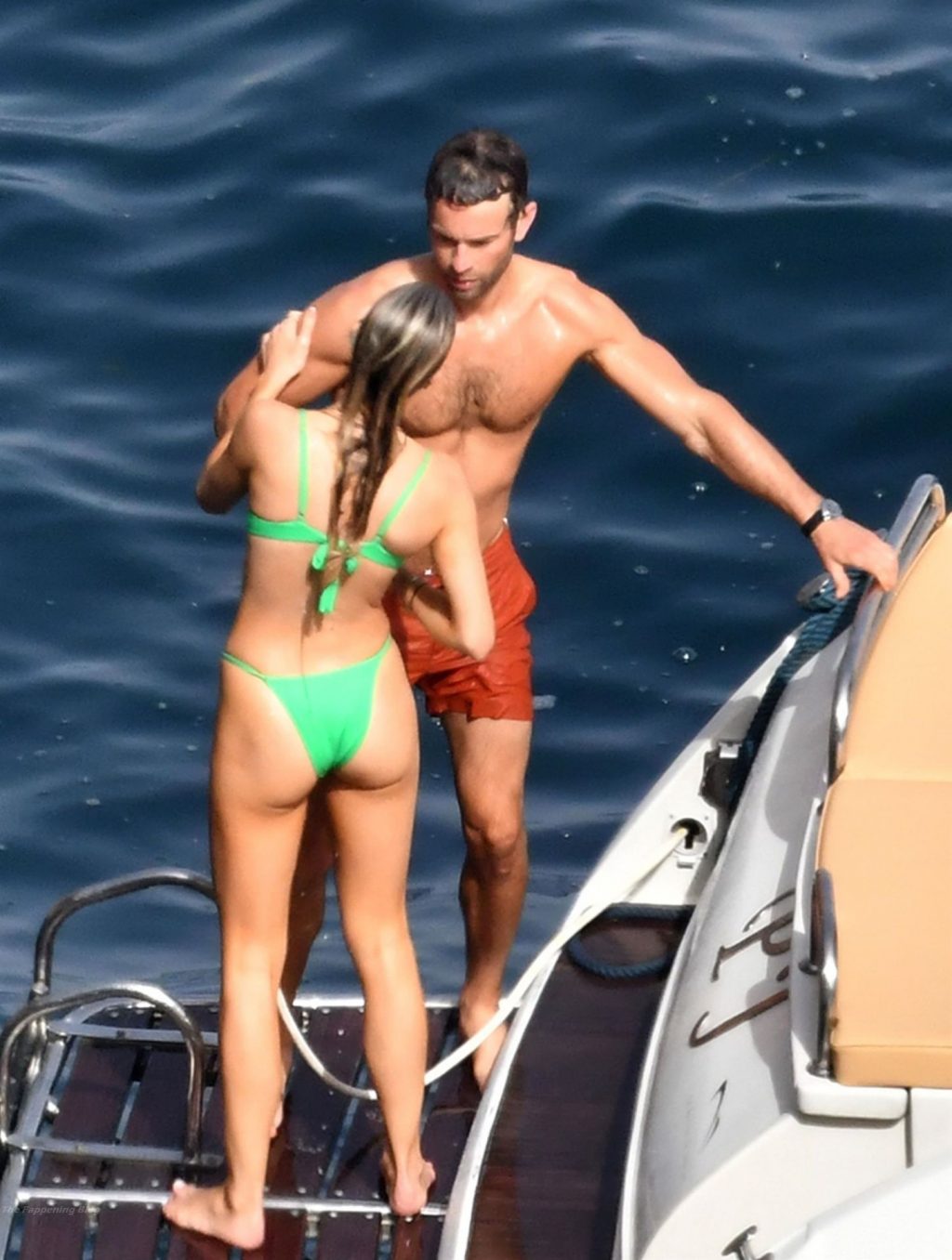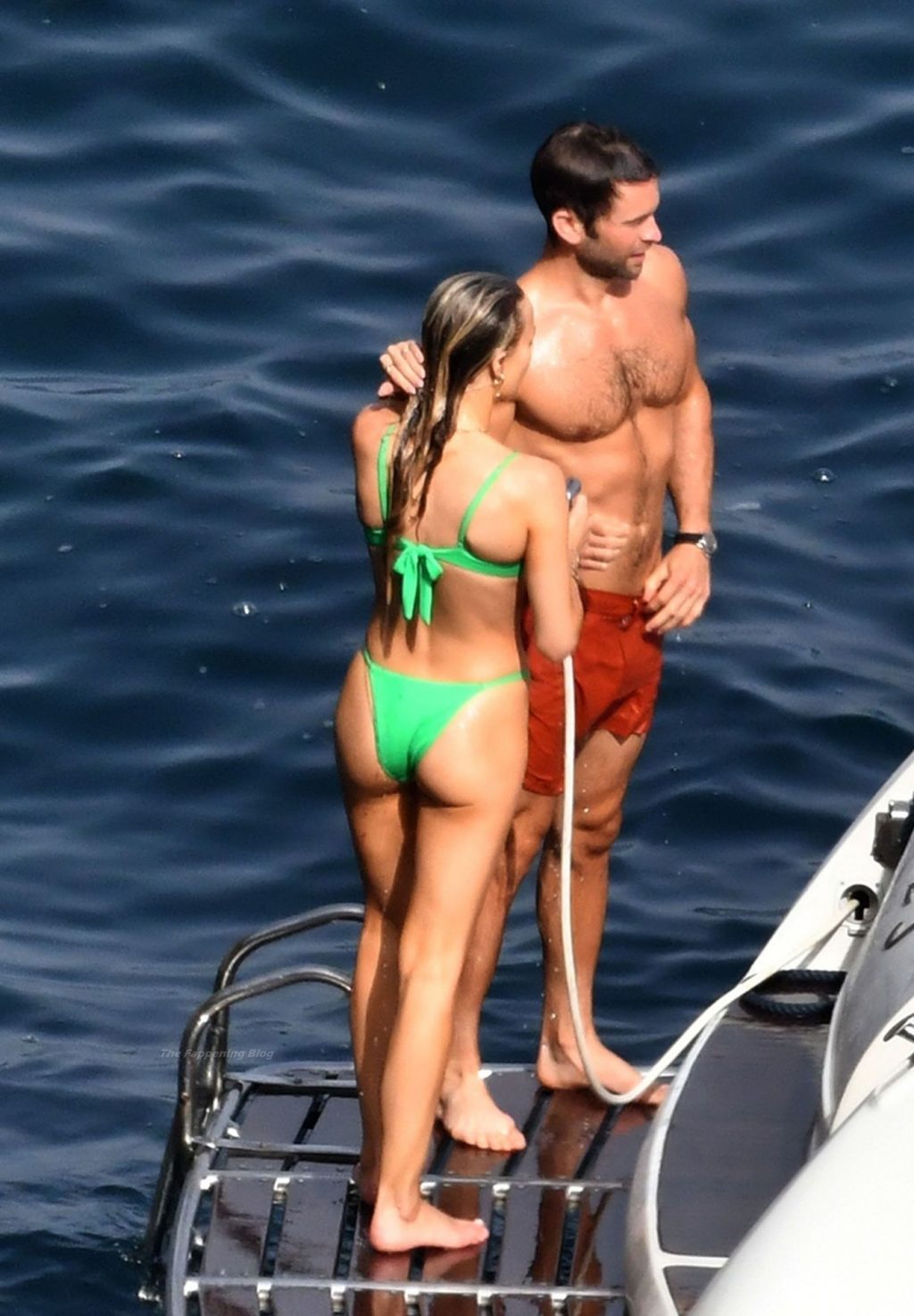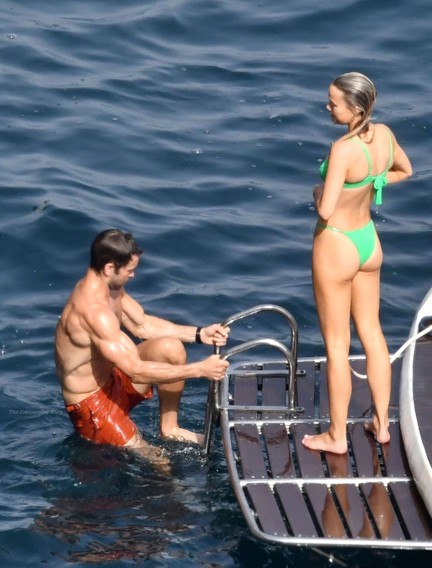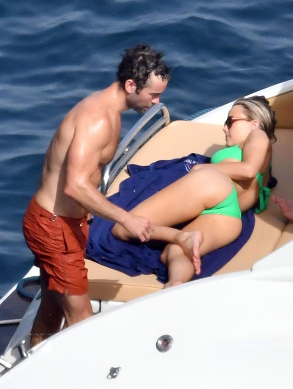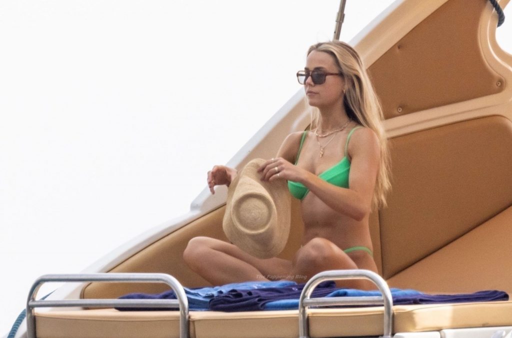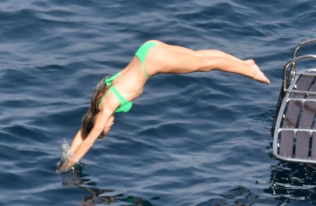 Avec quelques amis, le couple se détendait sur leur bateau et a fait un plongeon dans la mer italienne chaude, profitant du soleil brûlant tout en s’appliquant de la crème solaire pendant leurs vacances.