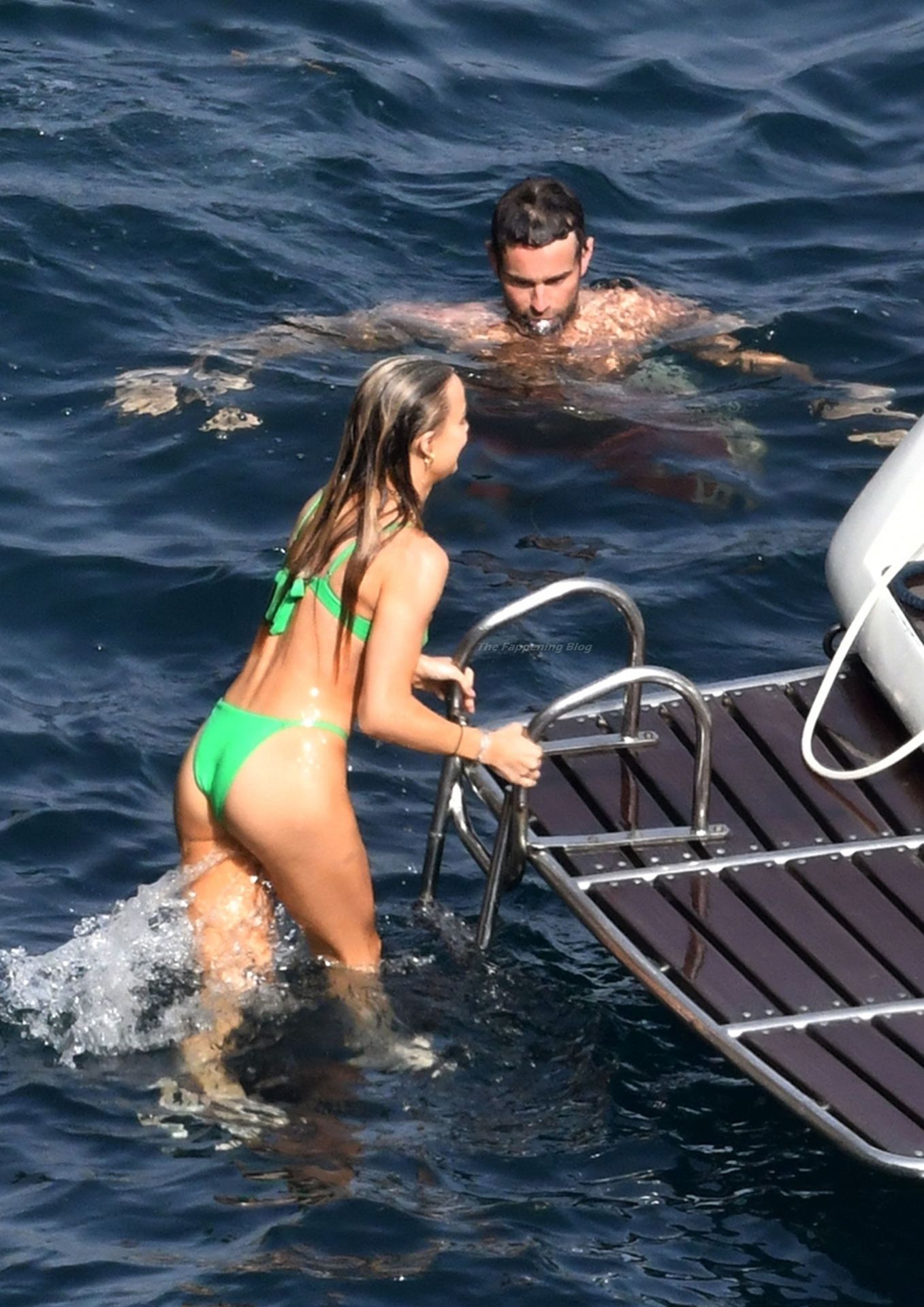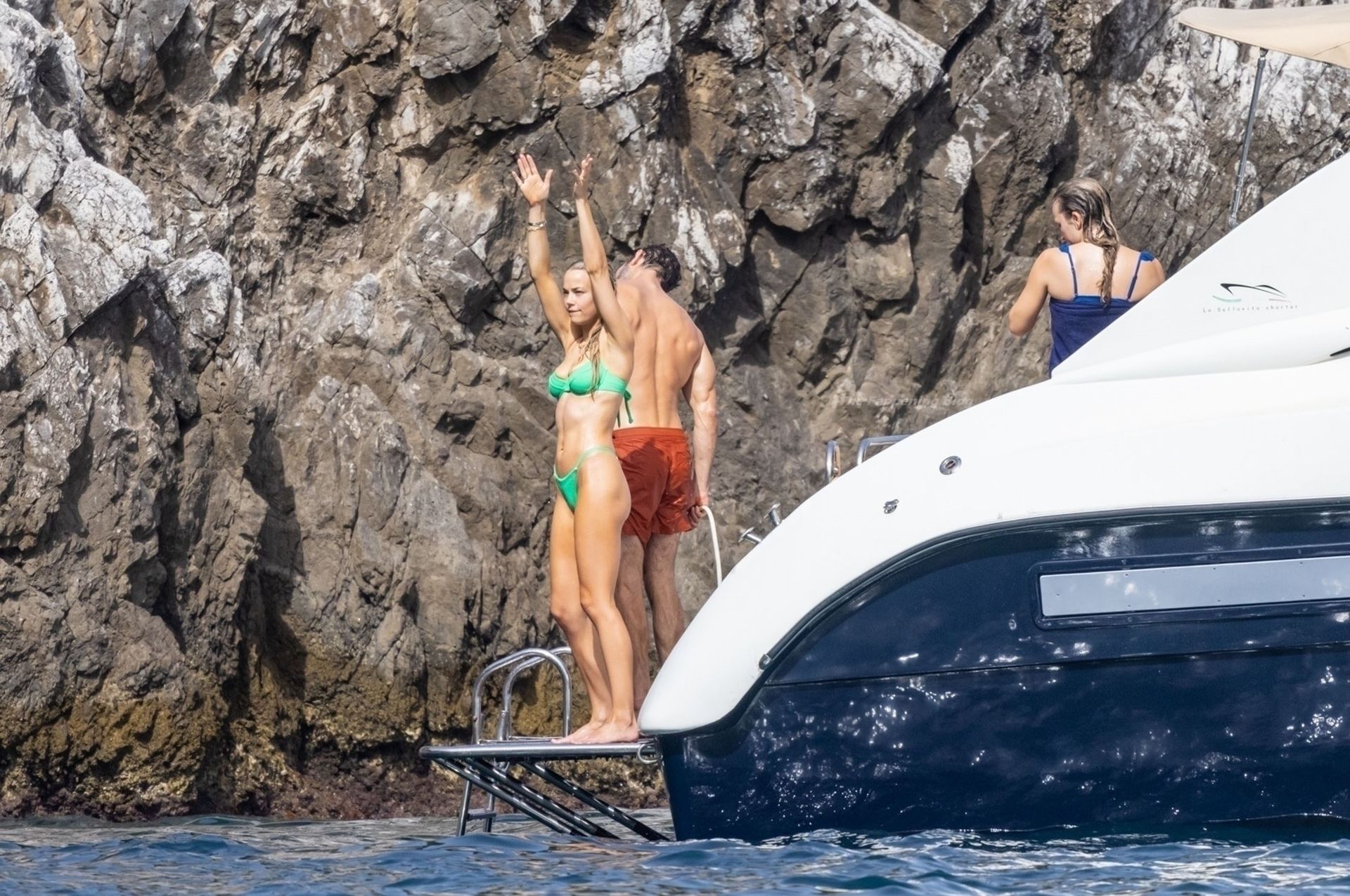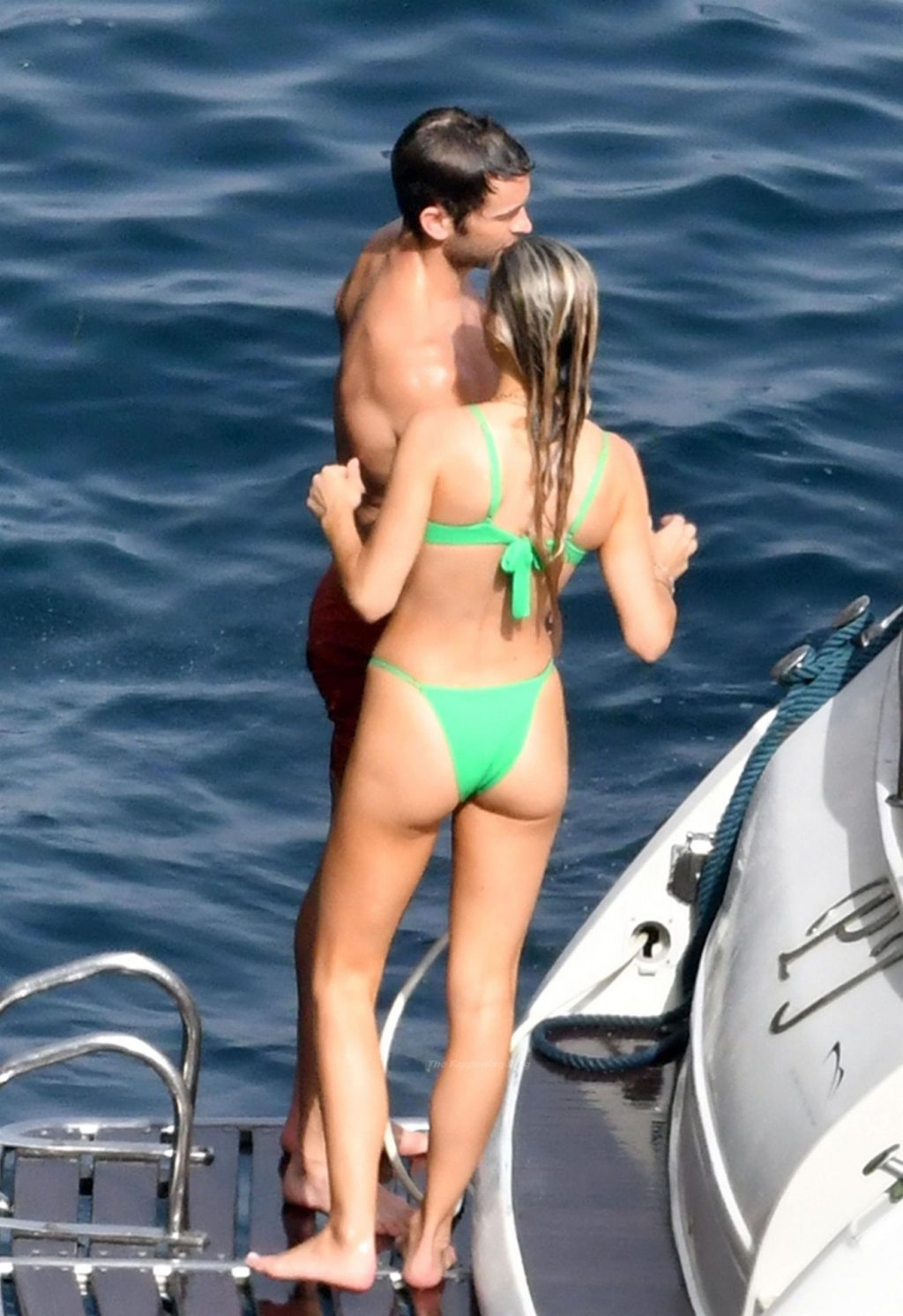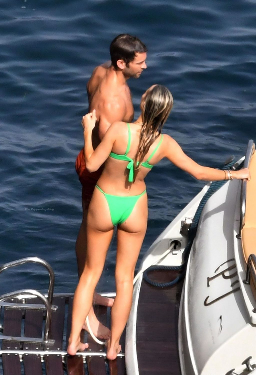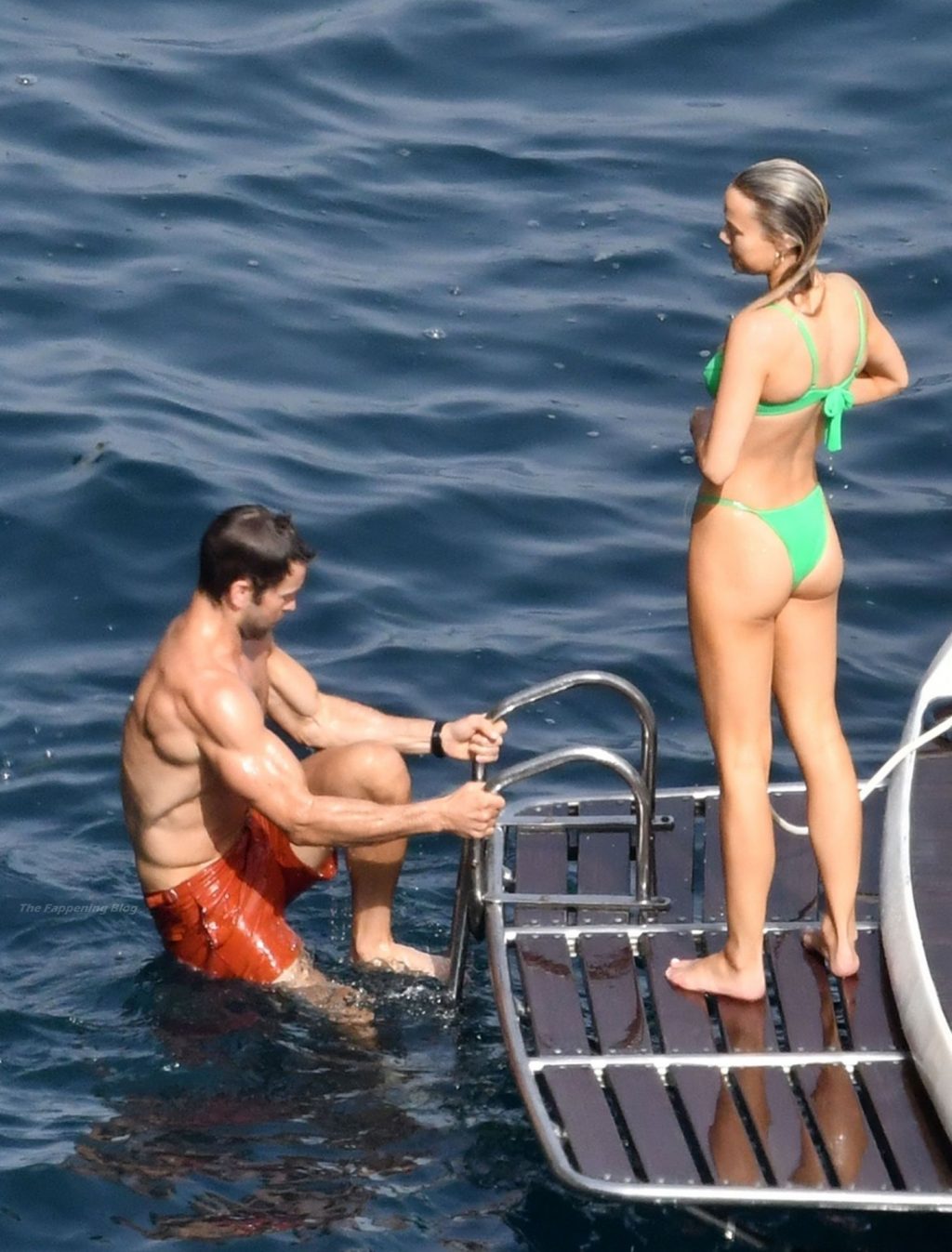 Avec quelques amis, le couple se détendait sur leur bateau et a fait un plongeon dans la mer italienne chaude, profitant du soleil brûlant tout en s’appliquant de la crème solaire pendant leurs vacances.