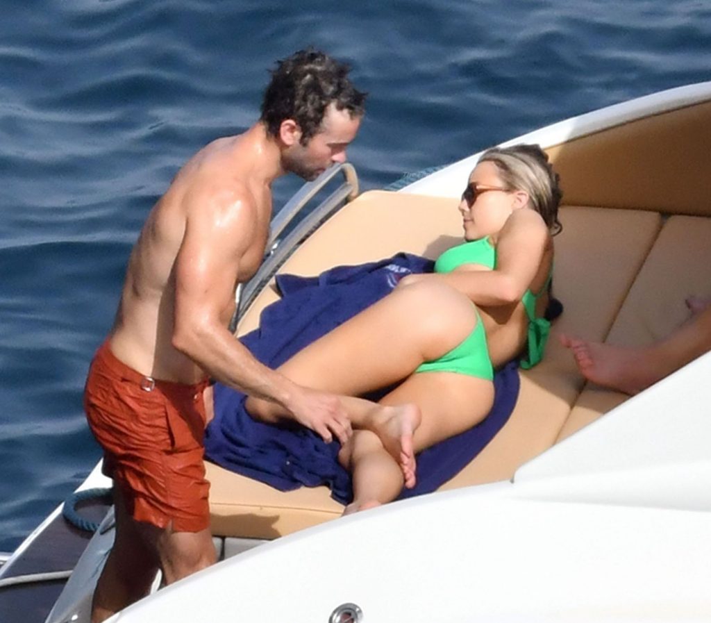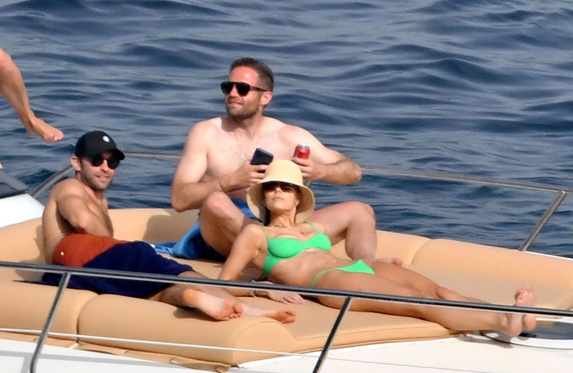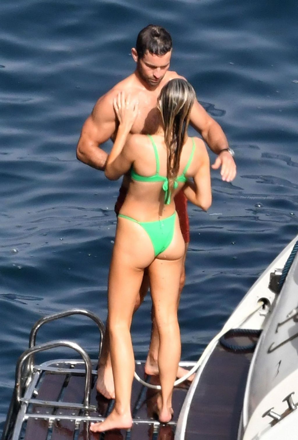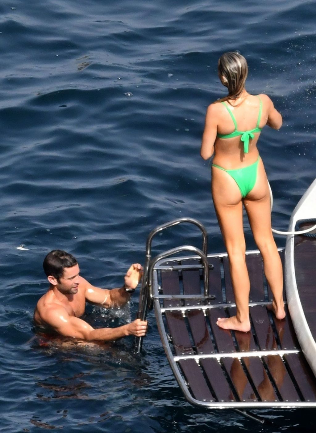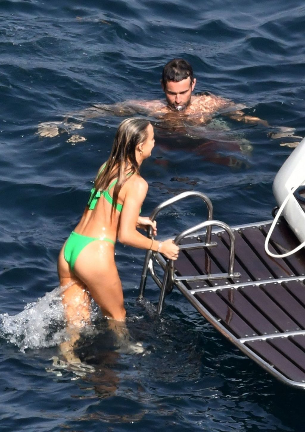 Avec quelques amis, le couple se détendait sur leur bateau et a fait un plongeon dans la mer italienne chaude, profitant du soleil brûlant tout en s’appliquant de la crème solaire pendant leurs vacances.