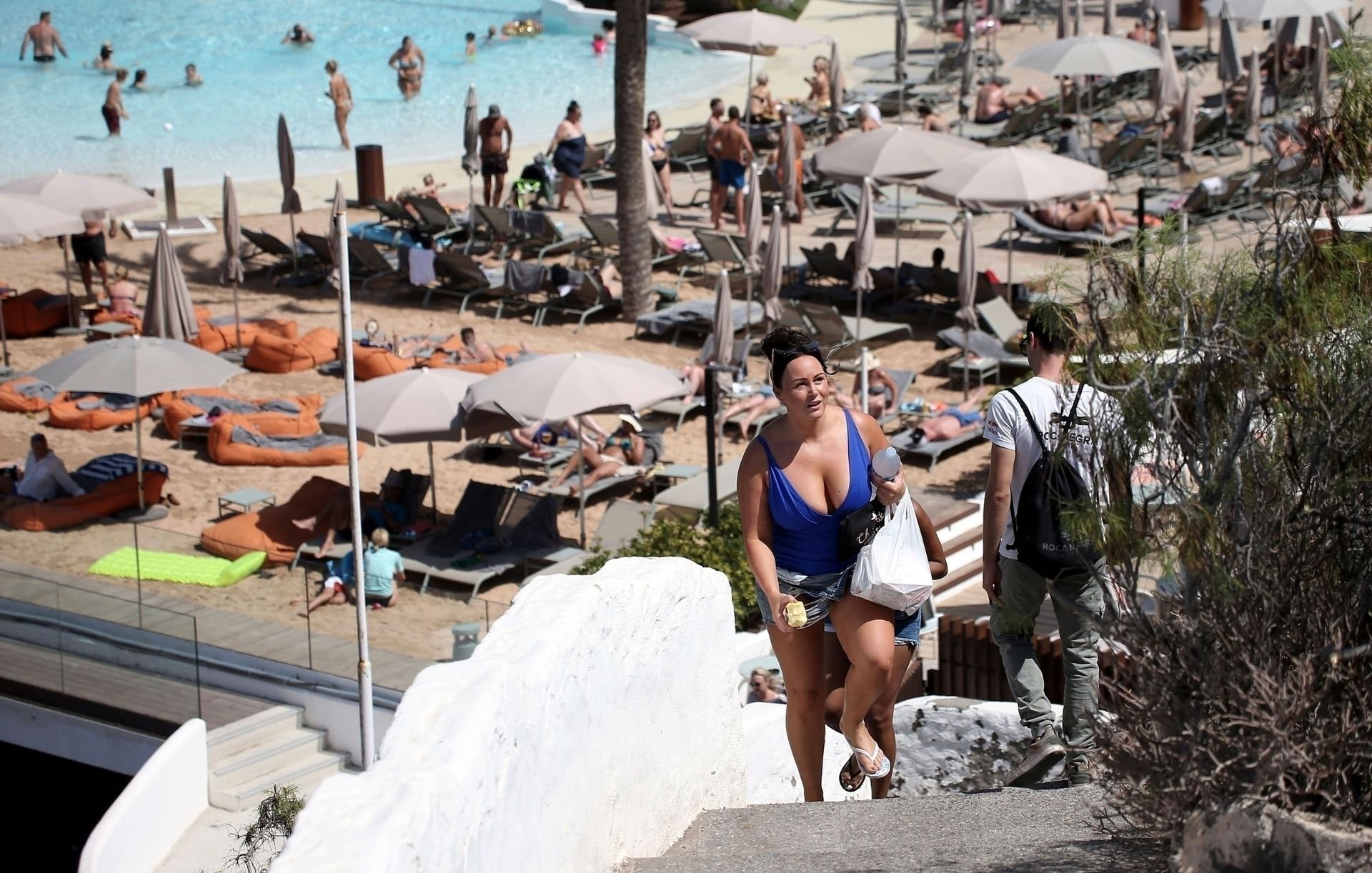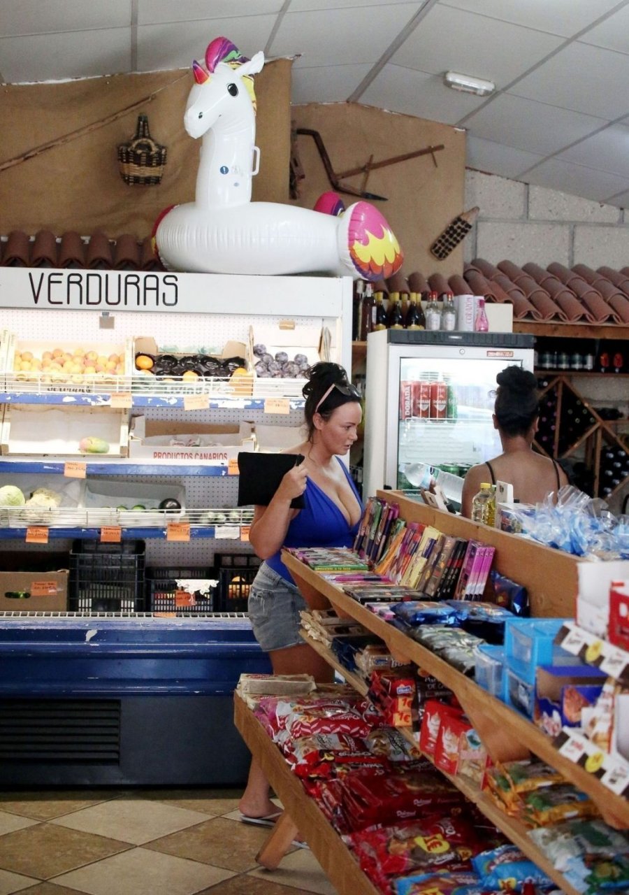 Sous un soleil éclatant, Chanelle portait son short en jean déchiré et un haut bleu dévoilant un décolleté généreux sous le soleil espagnol.