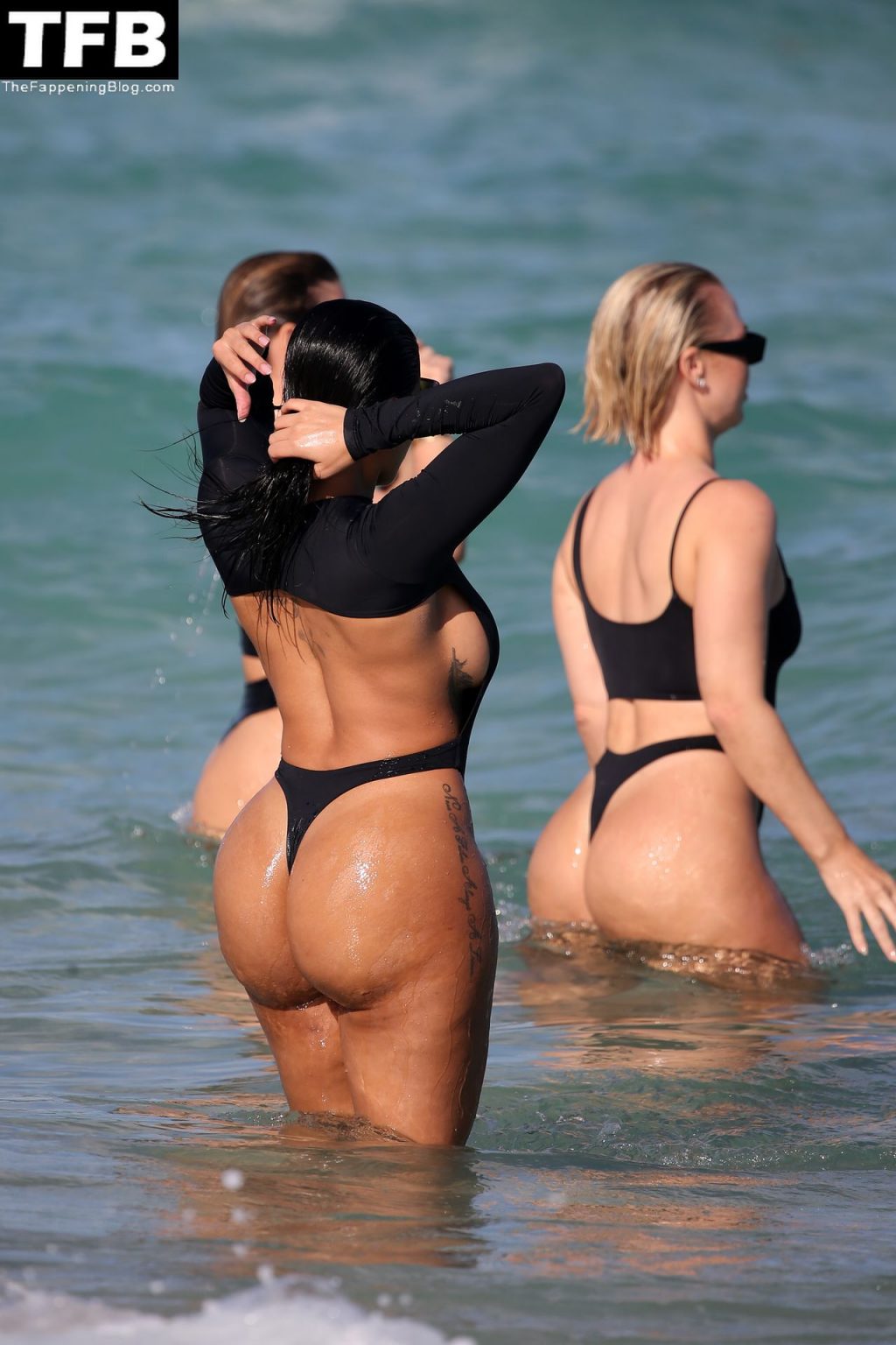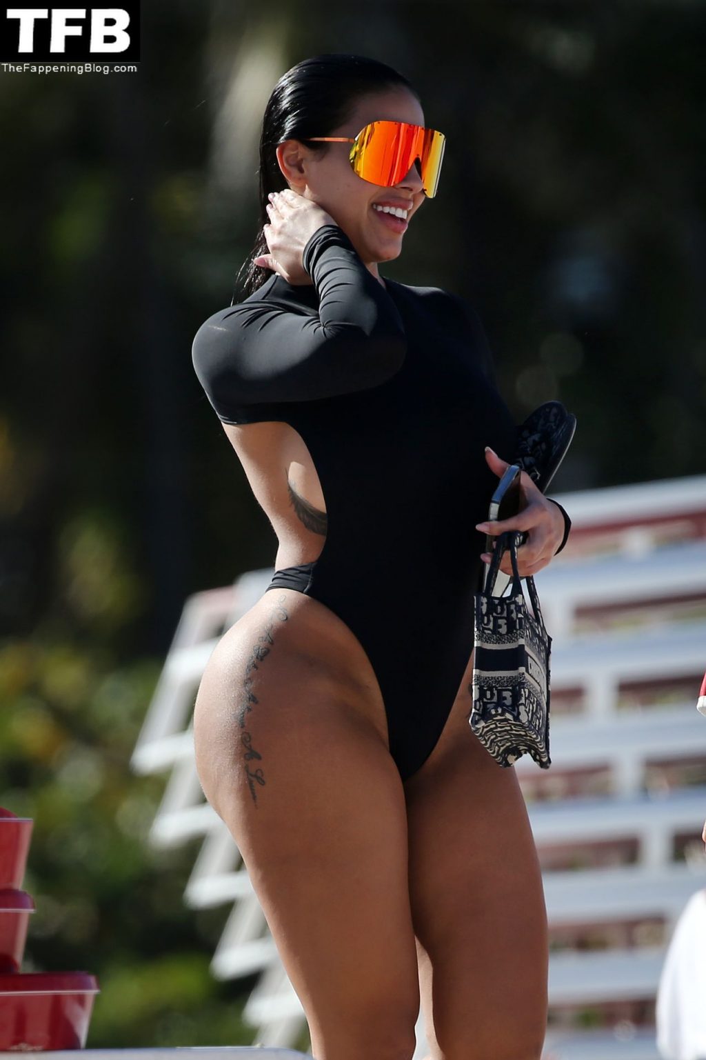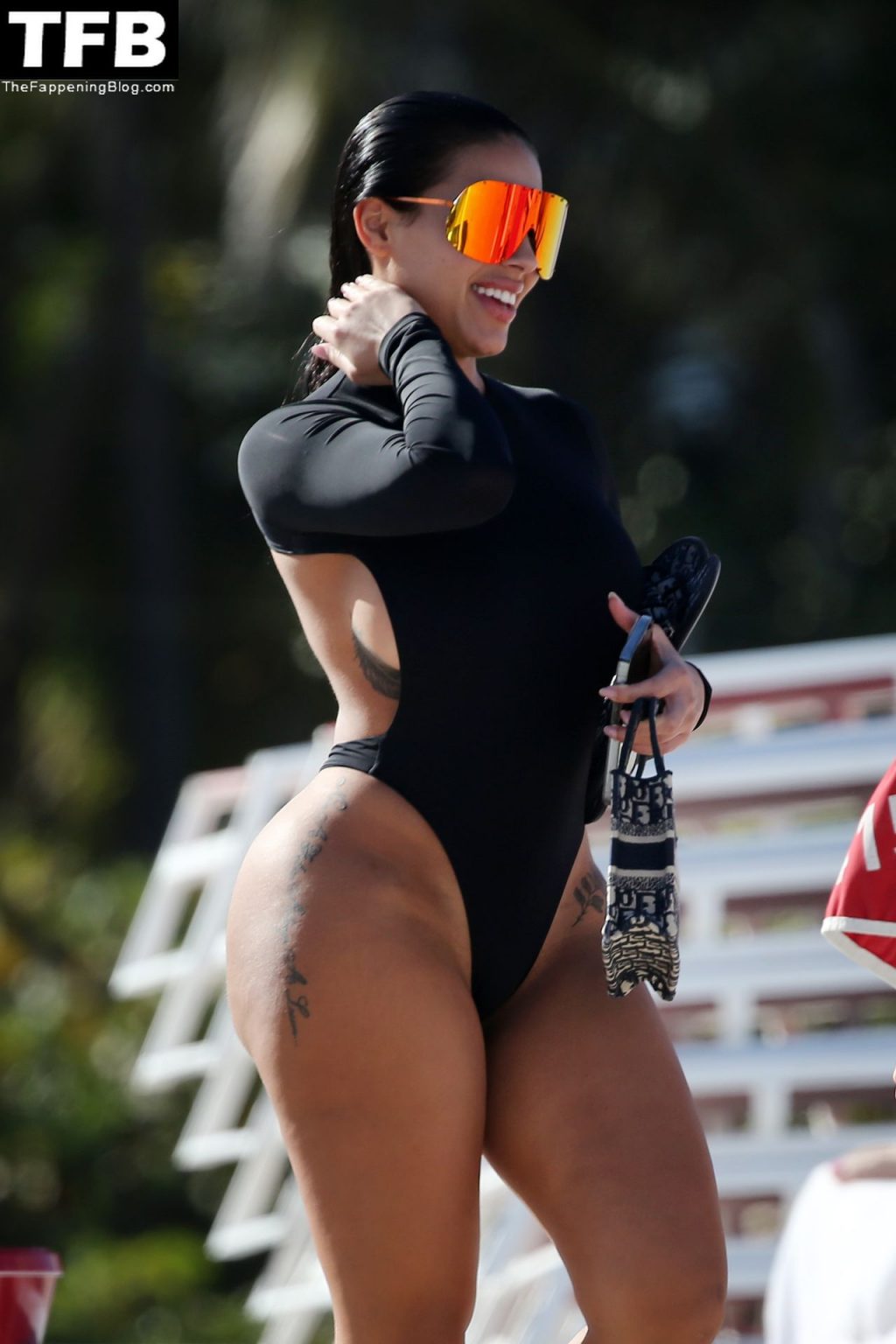 La dernière muse de Kanye West, Chaney Jones, montre ses courbes dans un une-pièce révélateur alors qu’elle se rend à la plage avec la créatrice de maillots de bain Bianca Elouise à Miami, le 23/02/2022.