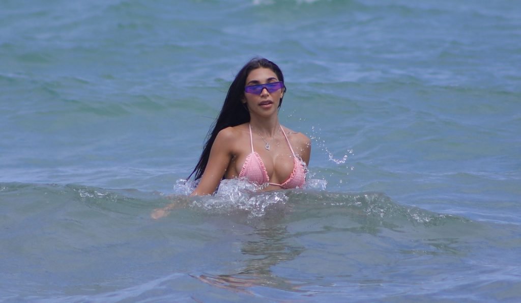 Chantel Jeffries montre son corps tonique alors qu’elle se mouille dans l’océan en portant un maillot de bain Revolve rose vif alors qu’elle fait sensation à Miami Swimweek avec une amie à South Beach, 07/12/2019.