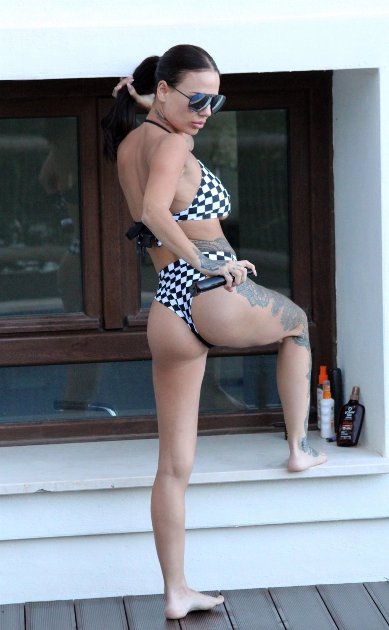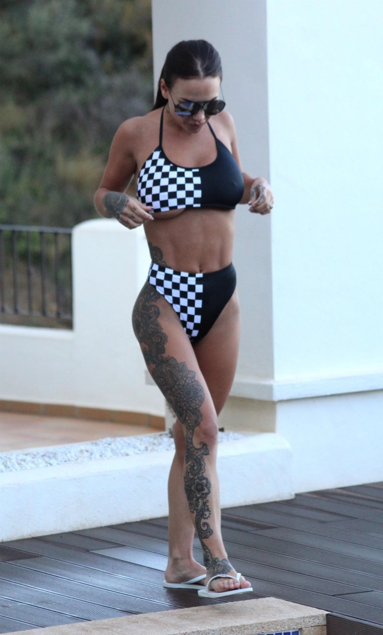 La star de la télé-réalité Chantelle Connelly, 28 ans, est vue en bikini à carreaux au bord de la piscine lors de ses vacances à Marbella, le 04/05/2018. Elle s’est fait un bronzage en spray avant de prendre quelques selfies. Elle veut vendre son fessier cher !