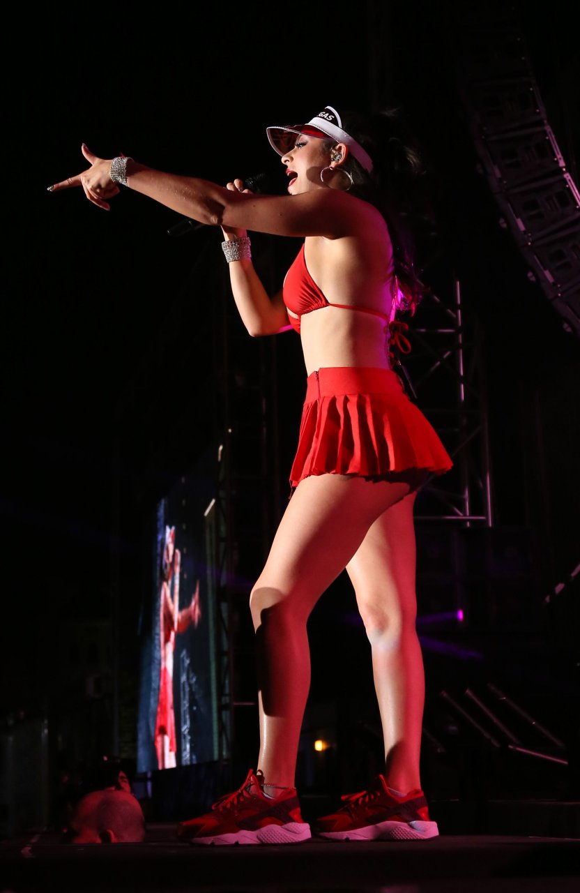 Charli XCX porte un haut de bikini rouge, une jupe et une culotte rose alors qu’elle se produit au Downtown Las Vegas Events Center à Las Vegas, le 21/10/2016. Super cameltoe ! Charli XCX est une chanteuse et auteure-compositrice anglaise. Âge : 24 ans (2 août 1992).
