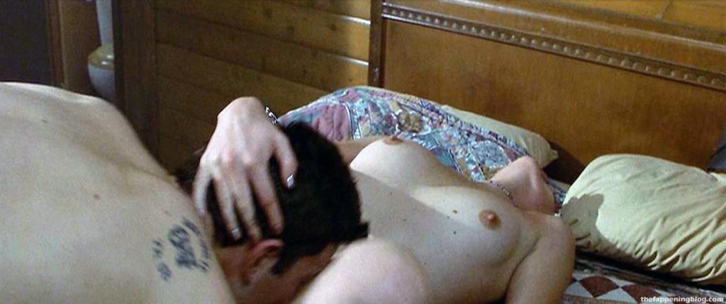 The following scenes are from the ‘Head In The Clouds’ movie. Charlize Theron in perfect combination apparel, hat, and tie on a naked body. She sits in the bathtub with her boyfriend and shows her nude pointy boobs and juicy nipples – a very sexy edition of this beautiful actress.